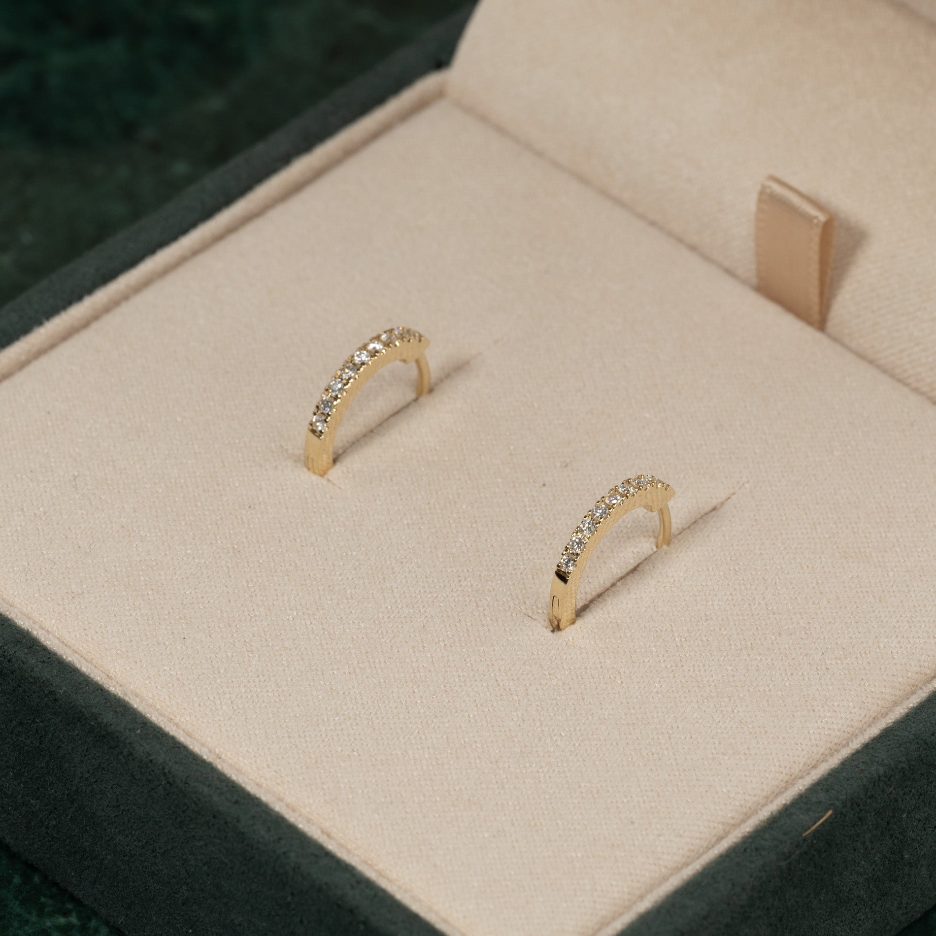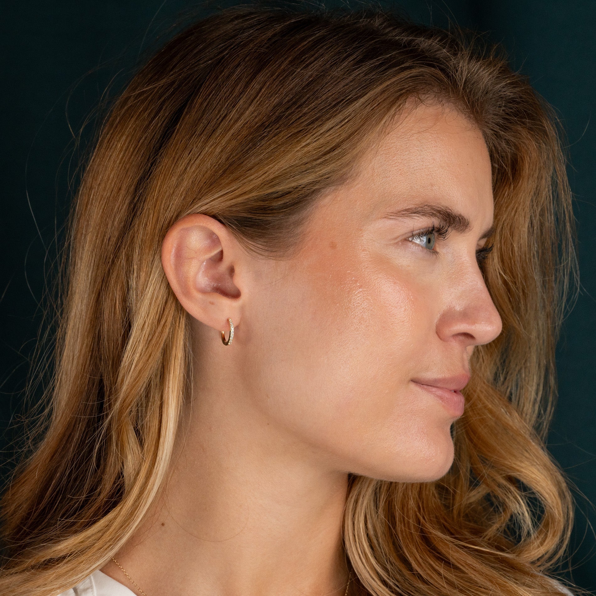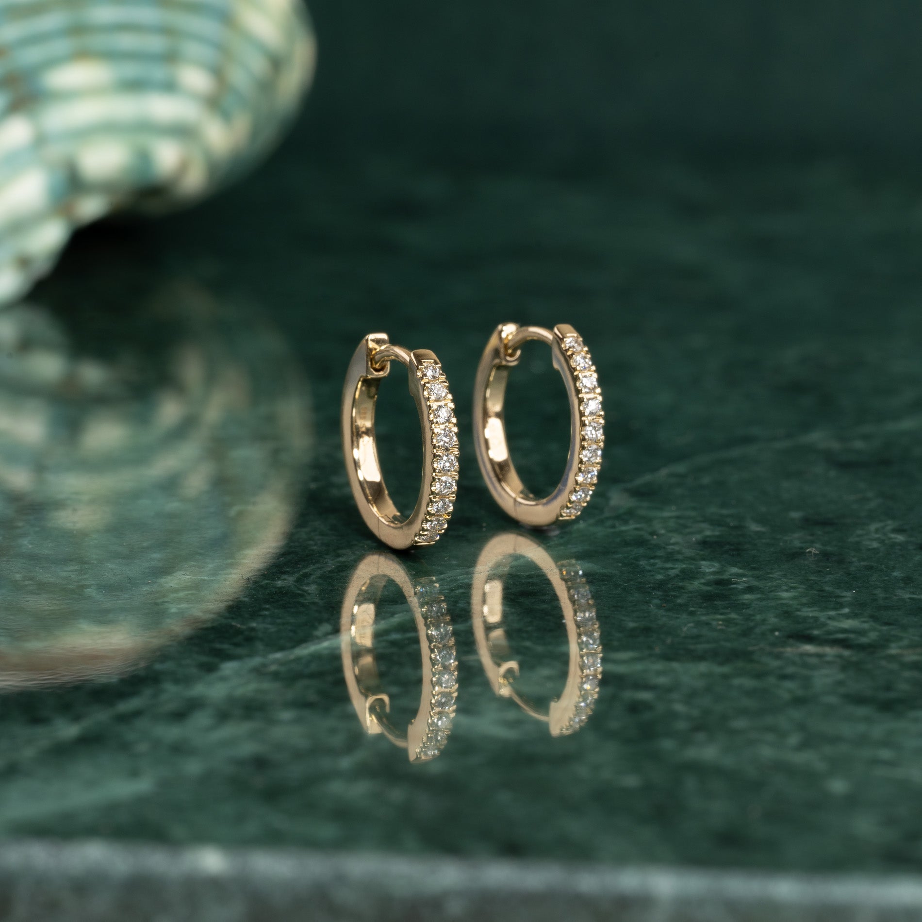 Classic diamond hoops made in 14 karat solid gold with a total of 20 lab-grown diamonds weighing 0.15 ct. the diamonds have the color E-F (River) and clarity VVS. The jewelry is created with care; the diamonds are made with solar energy and the gold is 100% certified recycled.