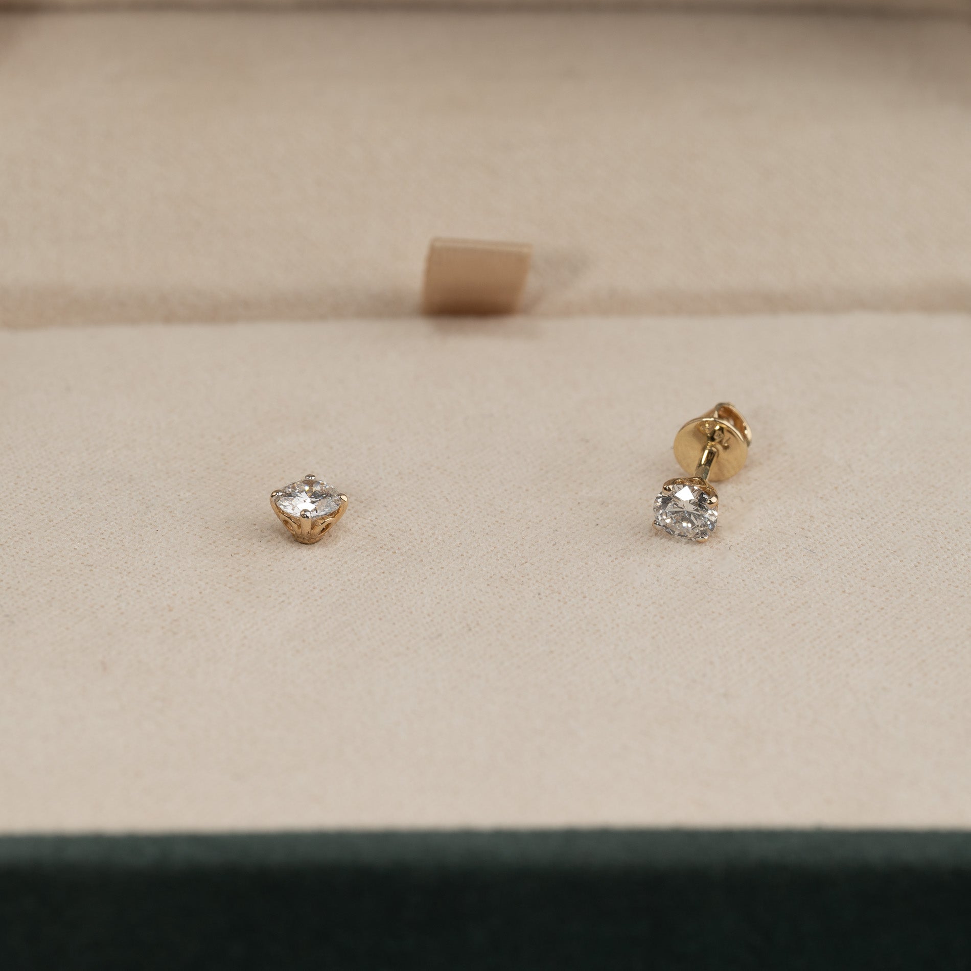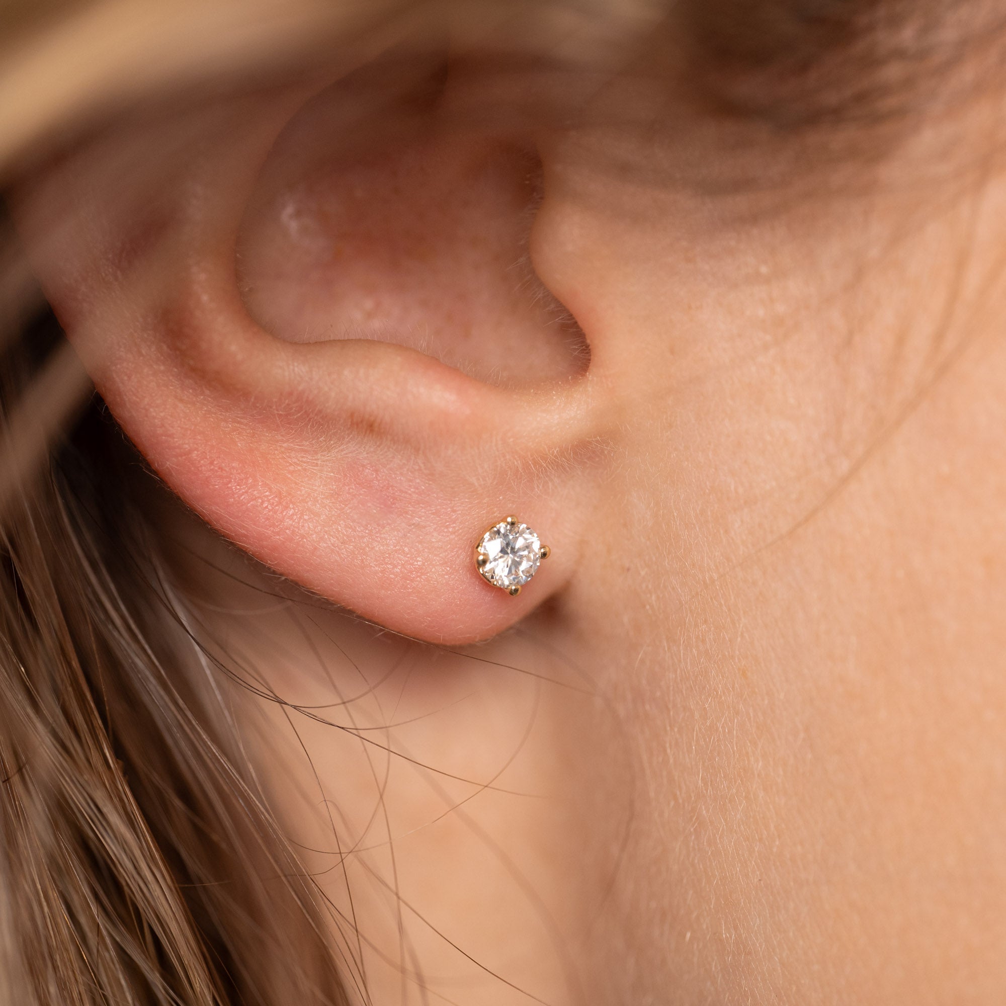 Our solitaire diamond stud earrings are made from 14 karat solid gold, featuring lab-grown diamonds, each weighing 0.25ct., for a total weight of 0.5ct. The diamonds are graded E-F (River) in color and VVS in clarity. The jewelry is thoughtfully crafted; the diamonds are produced using, among other methods, solar energy, and the gold is 100% certified recycled.