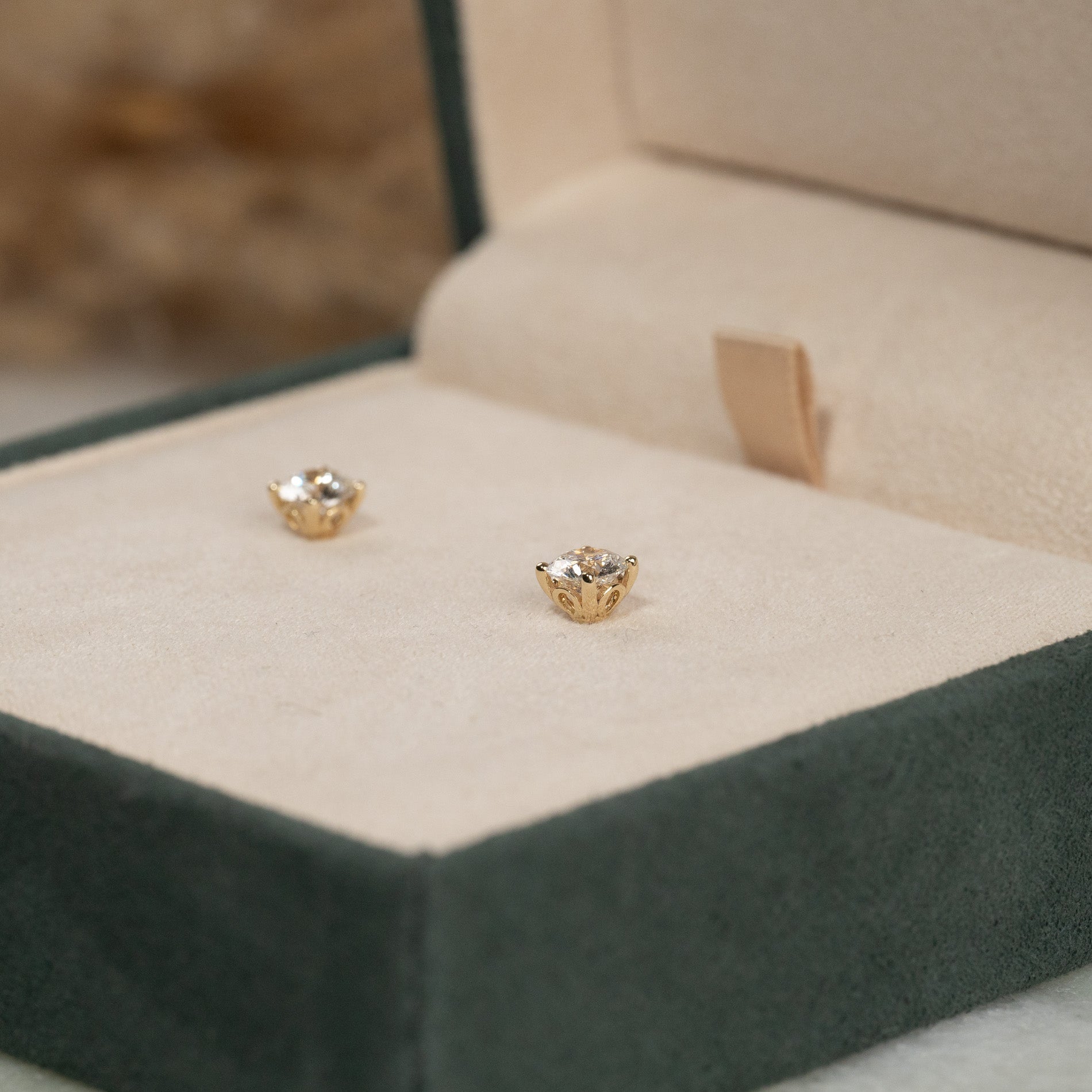 Our solitaire diamond stud earrings are made in 14 karat solid gold with lab-grown diamonds of 0.5 ct each - for a total weight of 1.0 ct. They have the color E-F (River) and clarity VVS. The jewelry is created with care; the diamonds are made with solar energy and the gold is 100% certified recycled.