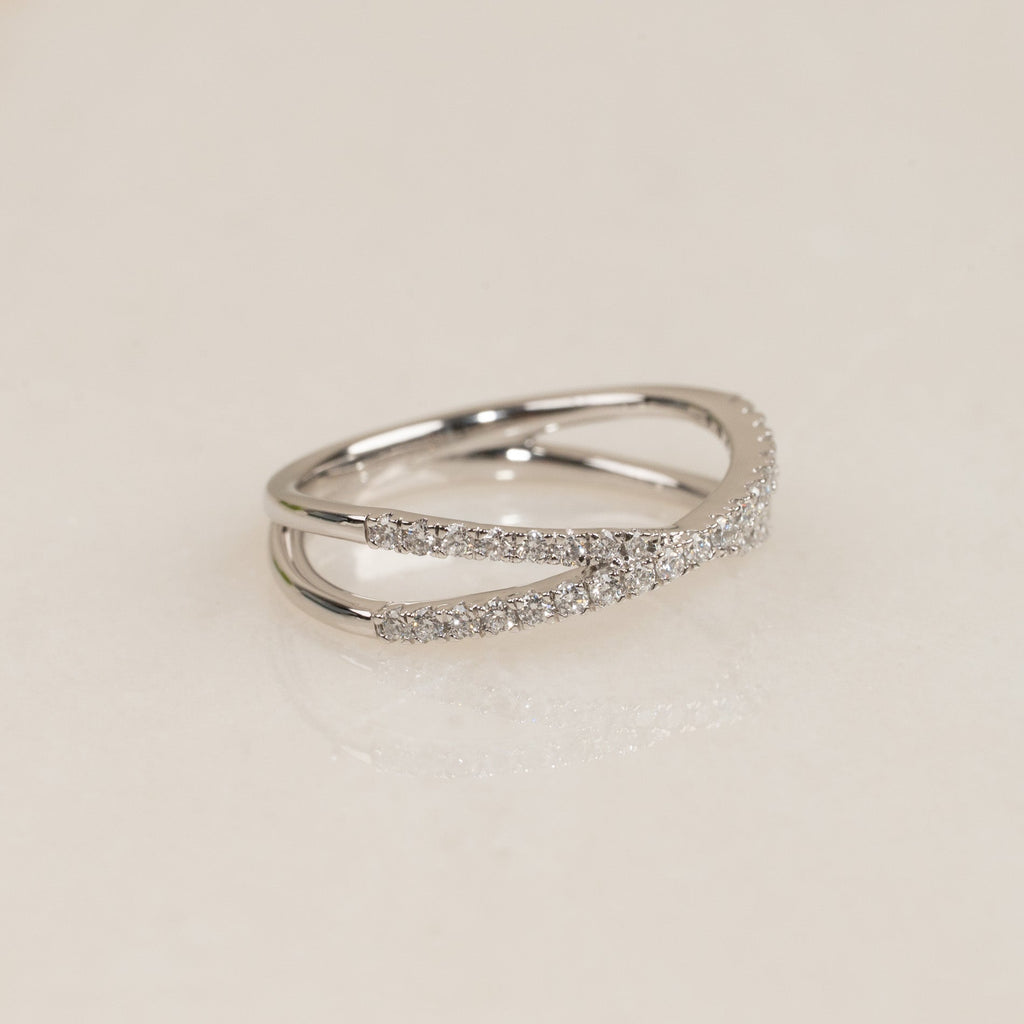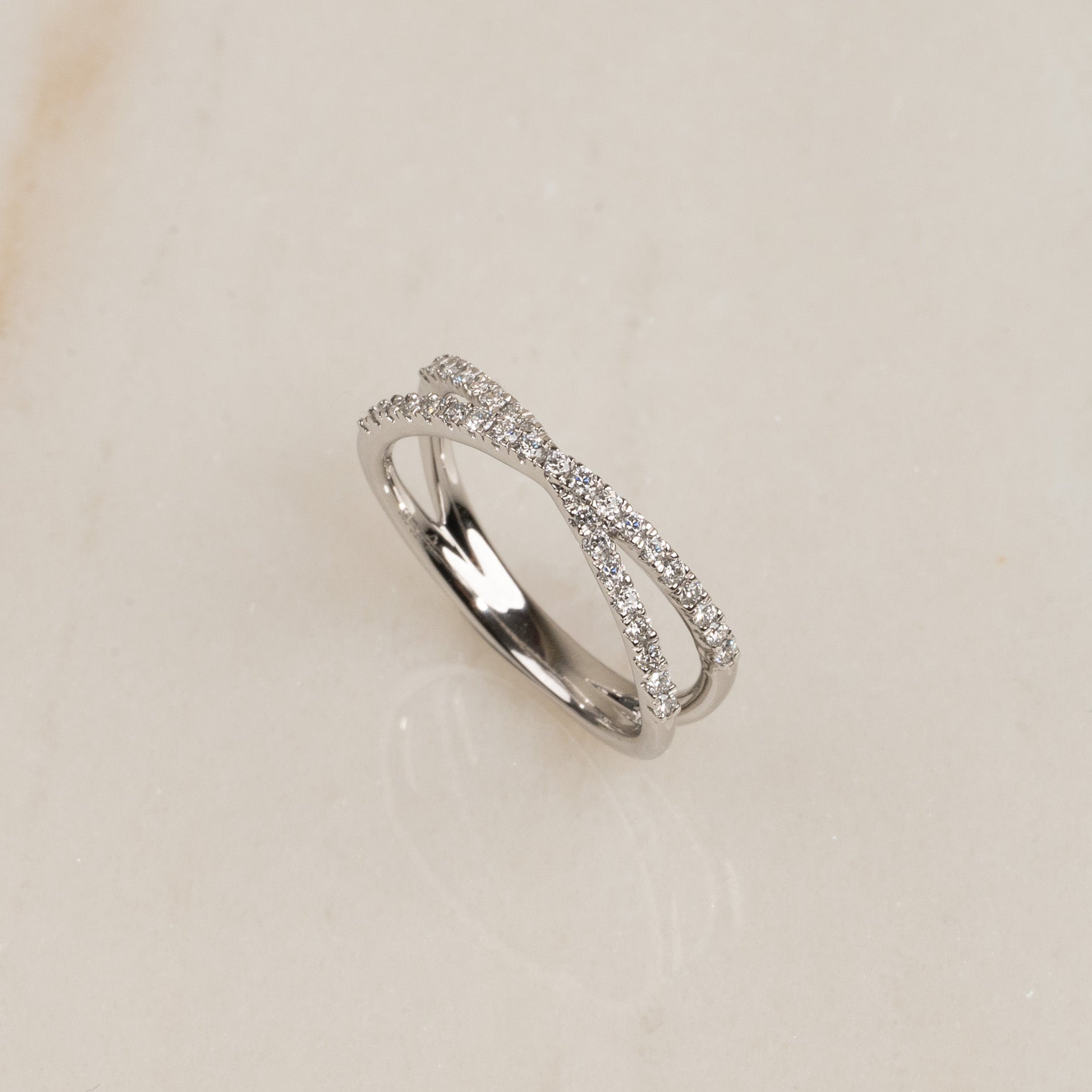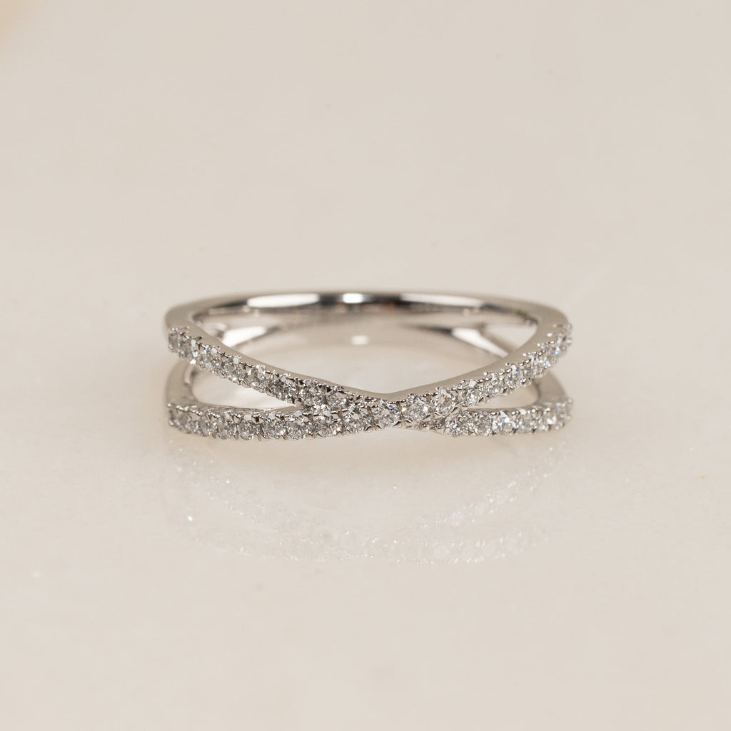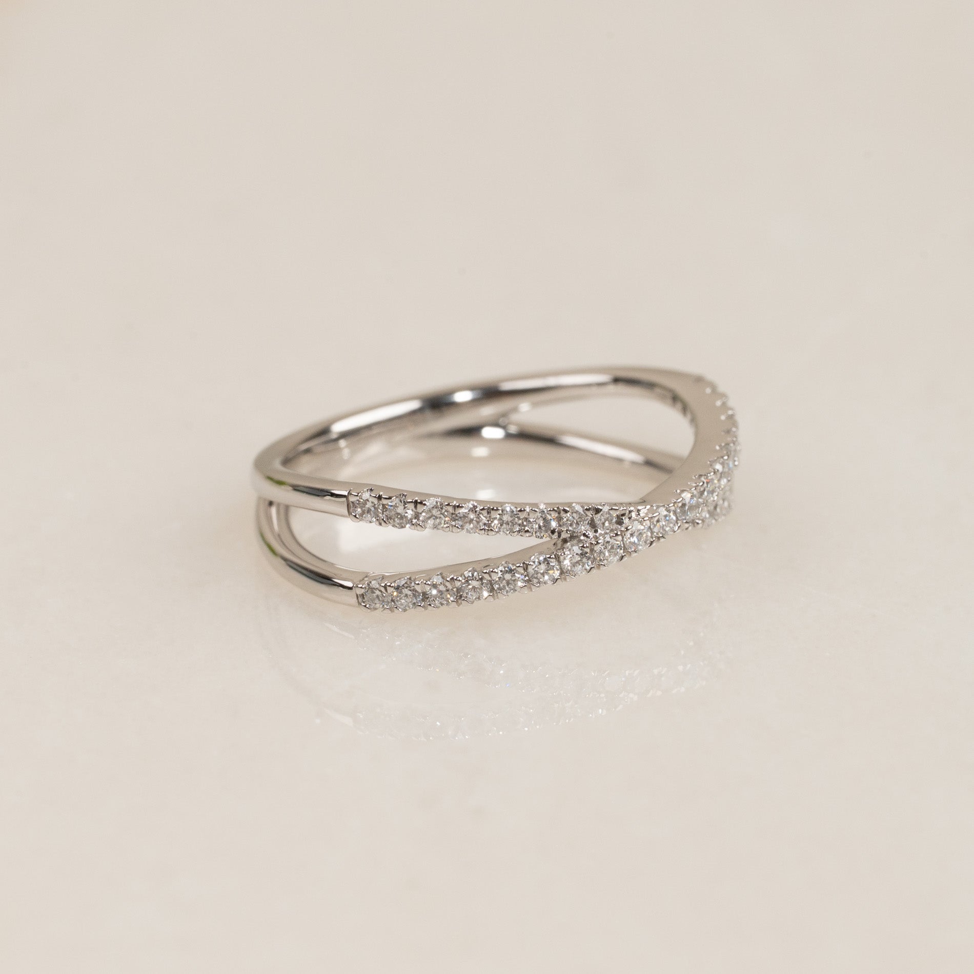 This ring is crafted in 14 karat solid white gold with a modern cross eternity design, where the two bands elegantly intersect. The combination of the crossing bands and radiant diamonds gives the ring a look that is both contemporary and timeless. The diamonds are graded E/F (River) in color with VVS clarity and have a total weight of 0.25 ct.