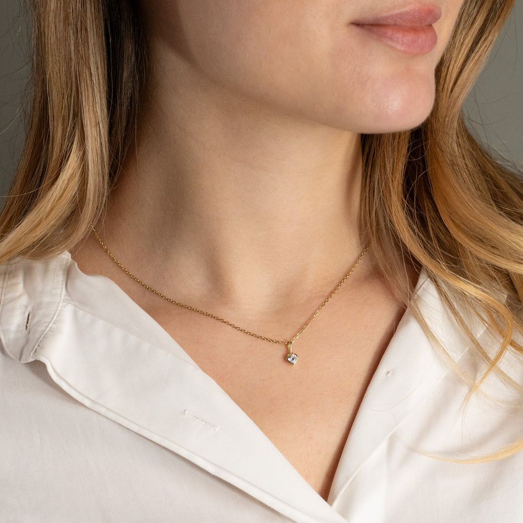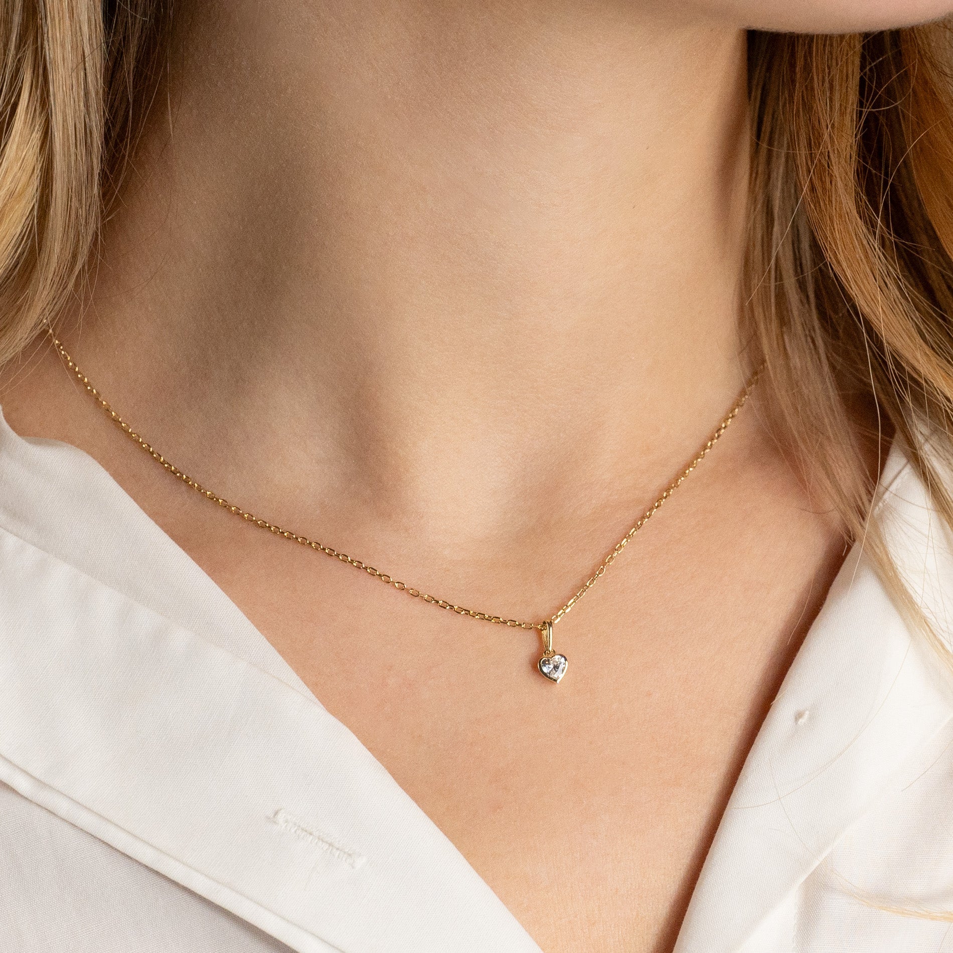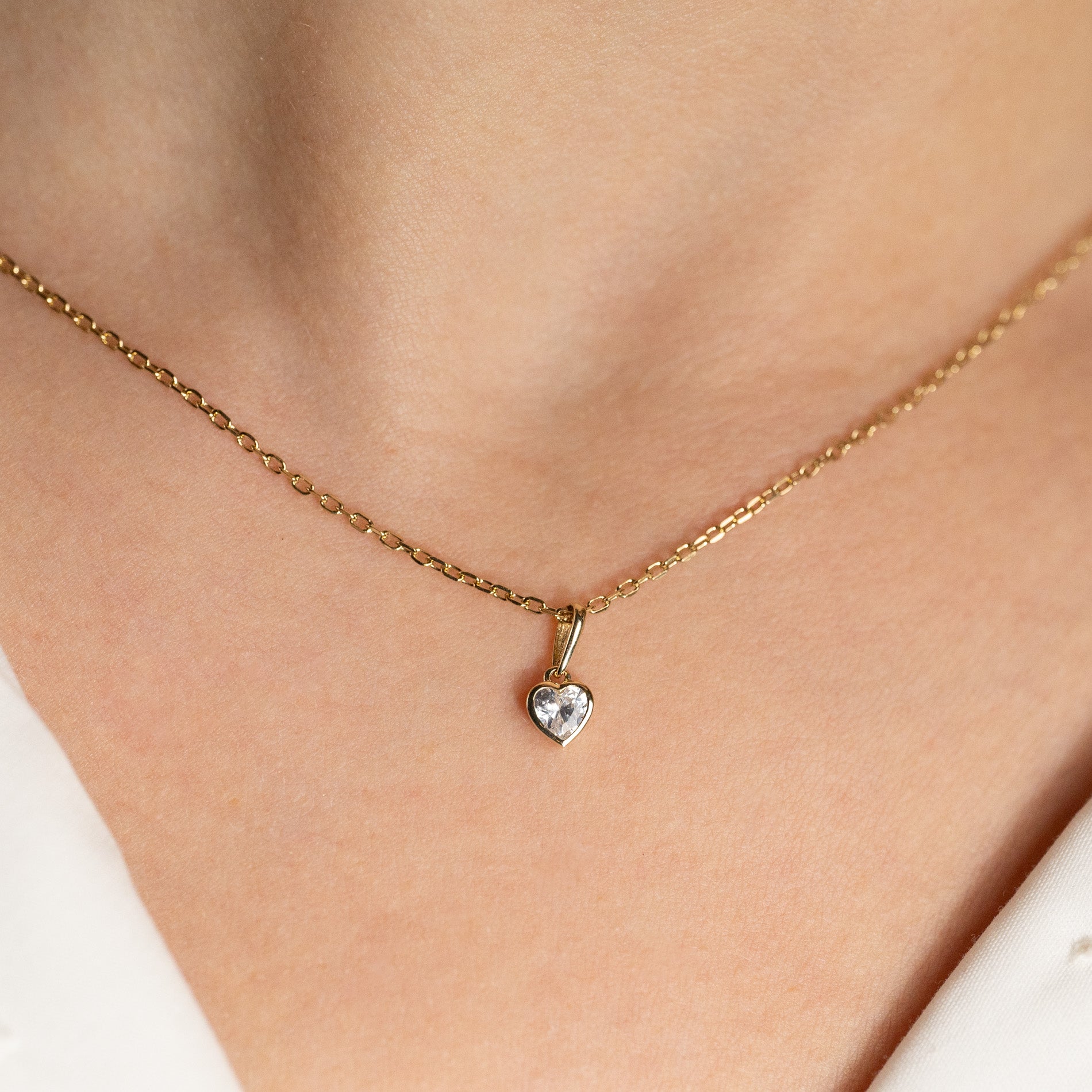 Small neklace pendant with heart-cut zirconias and 100% recycled 9 kt. Solid gold.