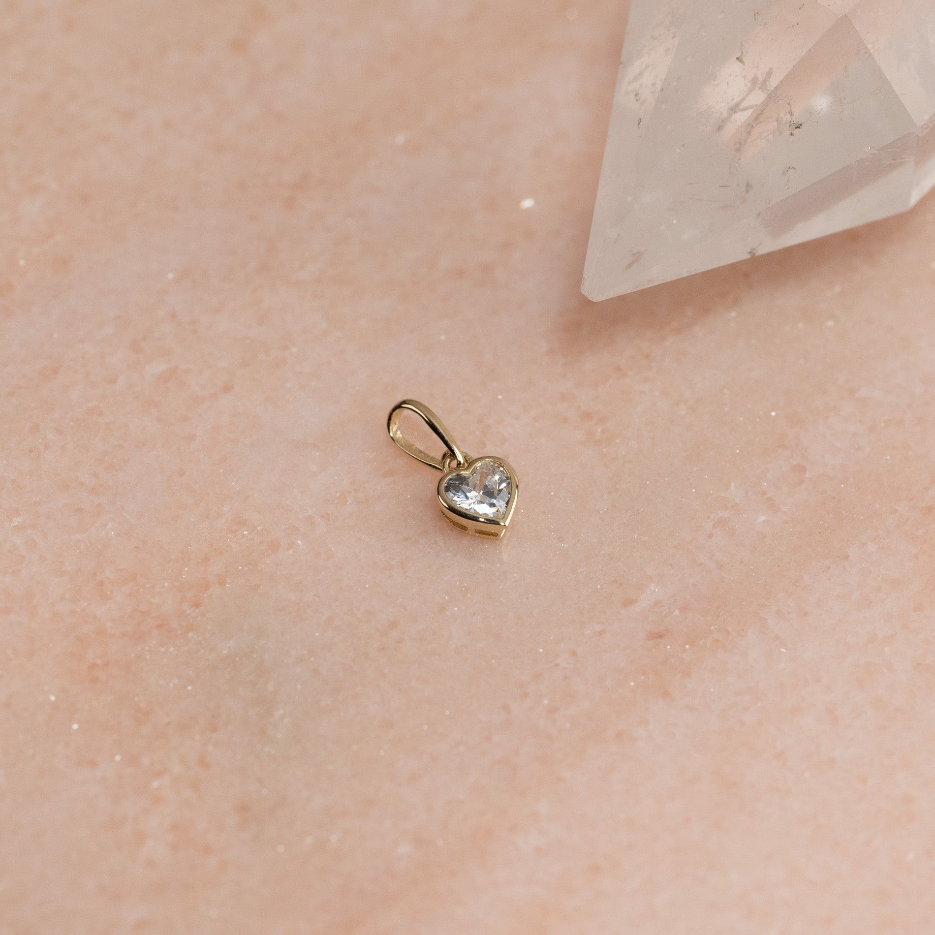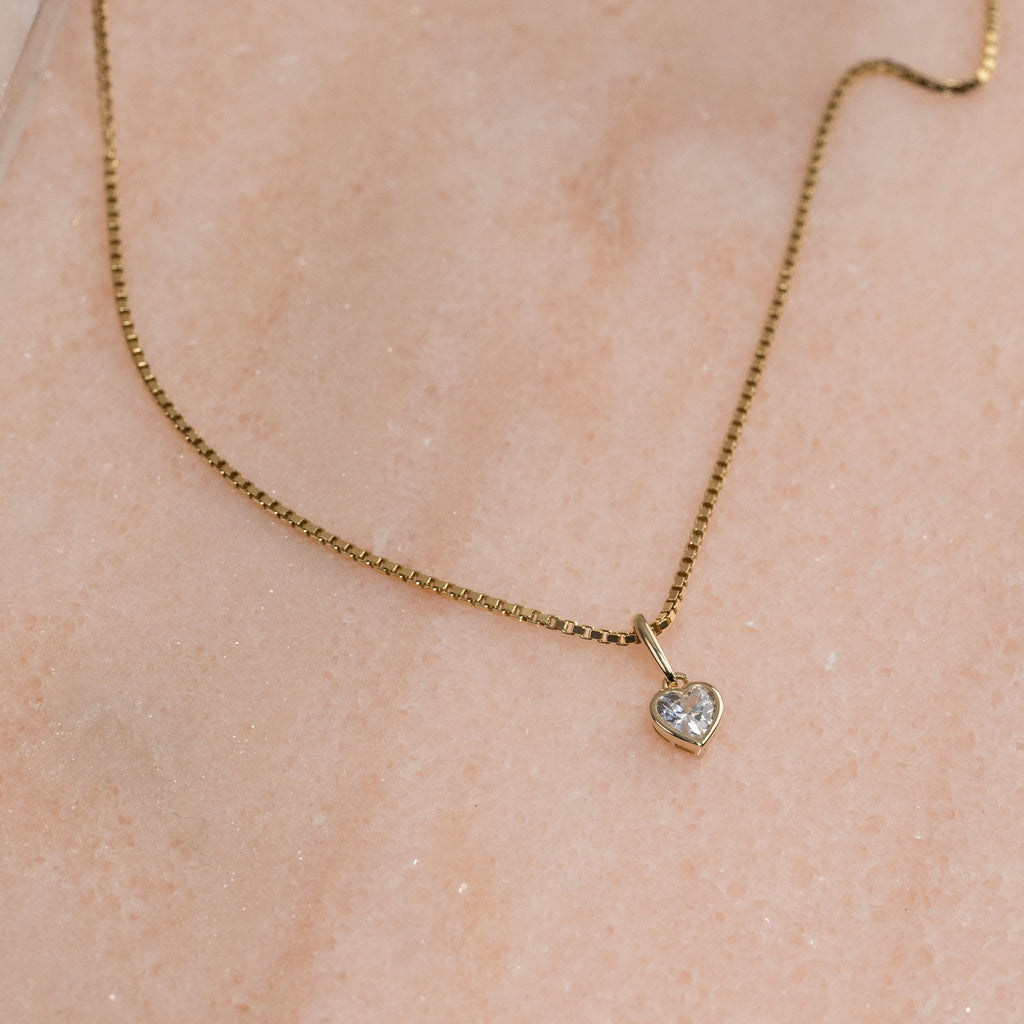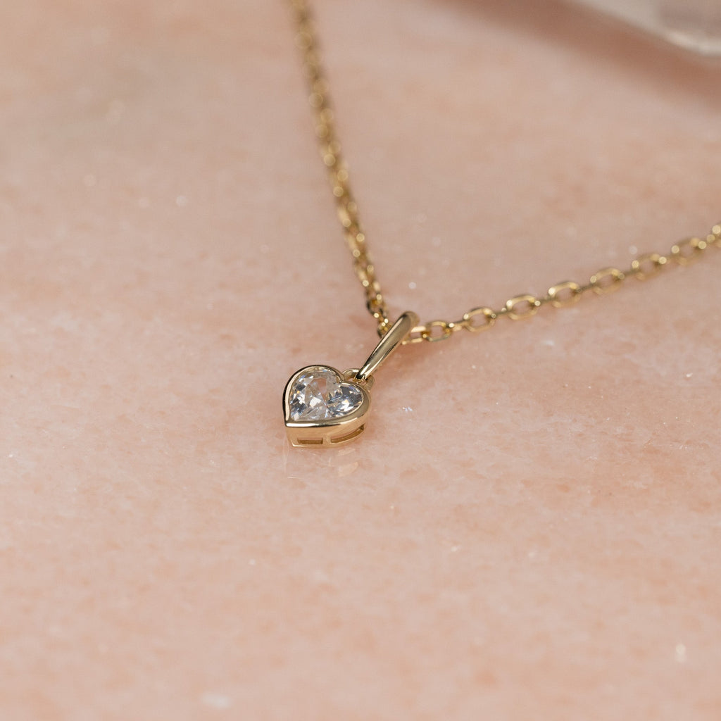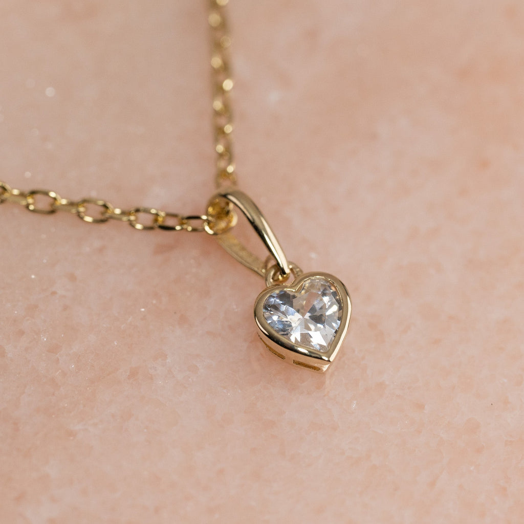 Small neklace pendant with heart-cut zirconias and 100% recycled 9 kt. Solid gold.