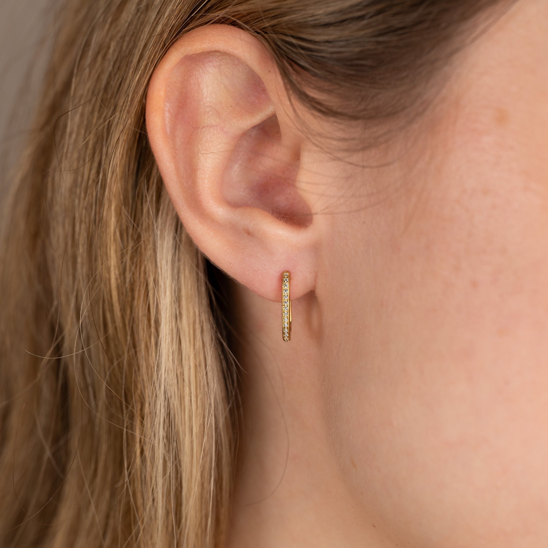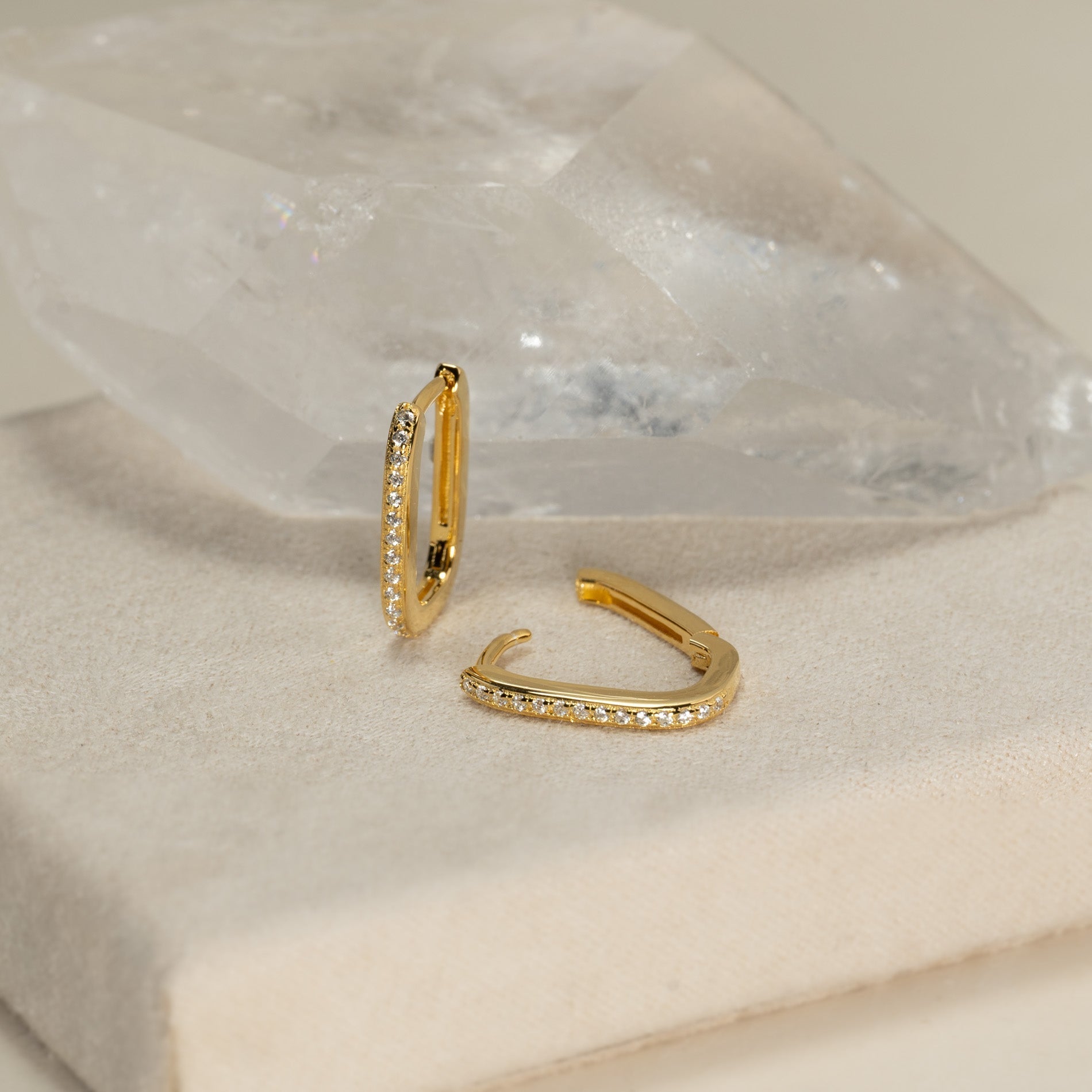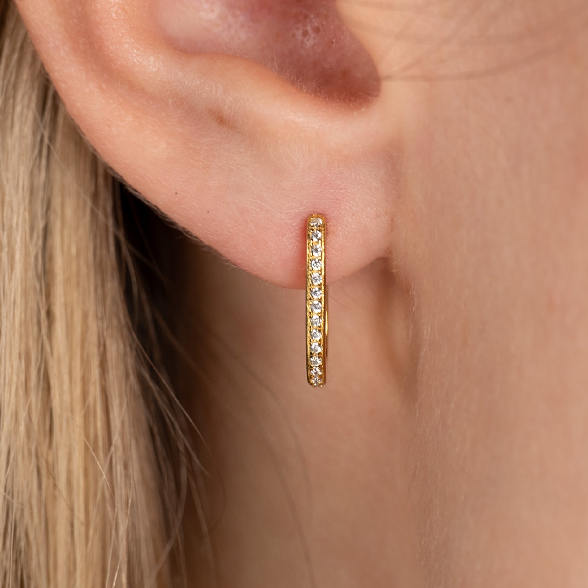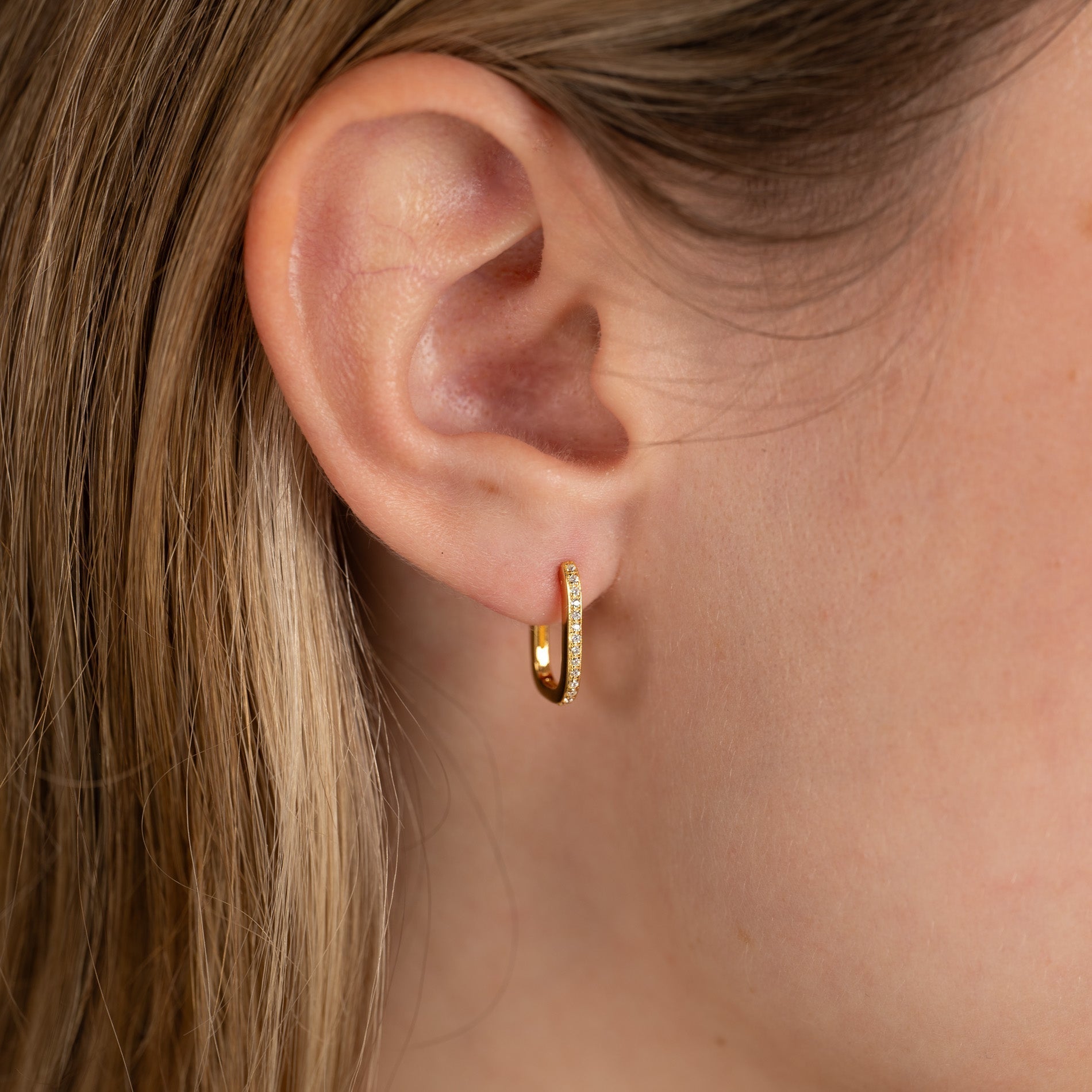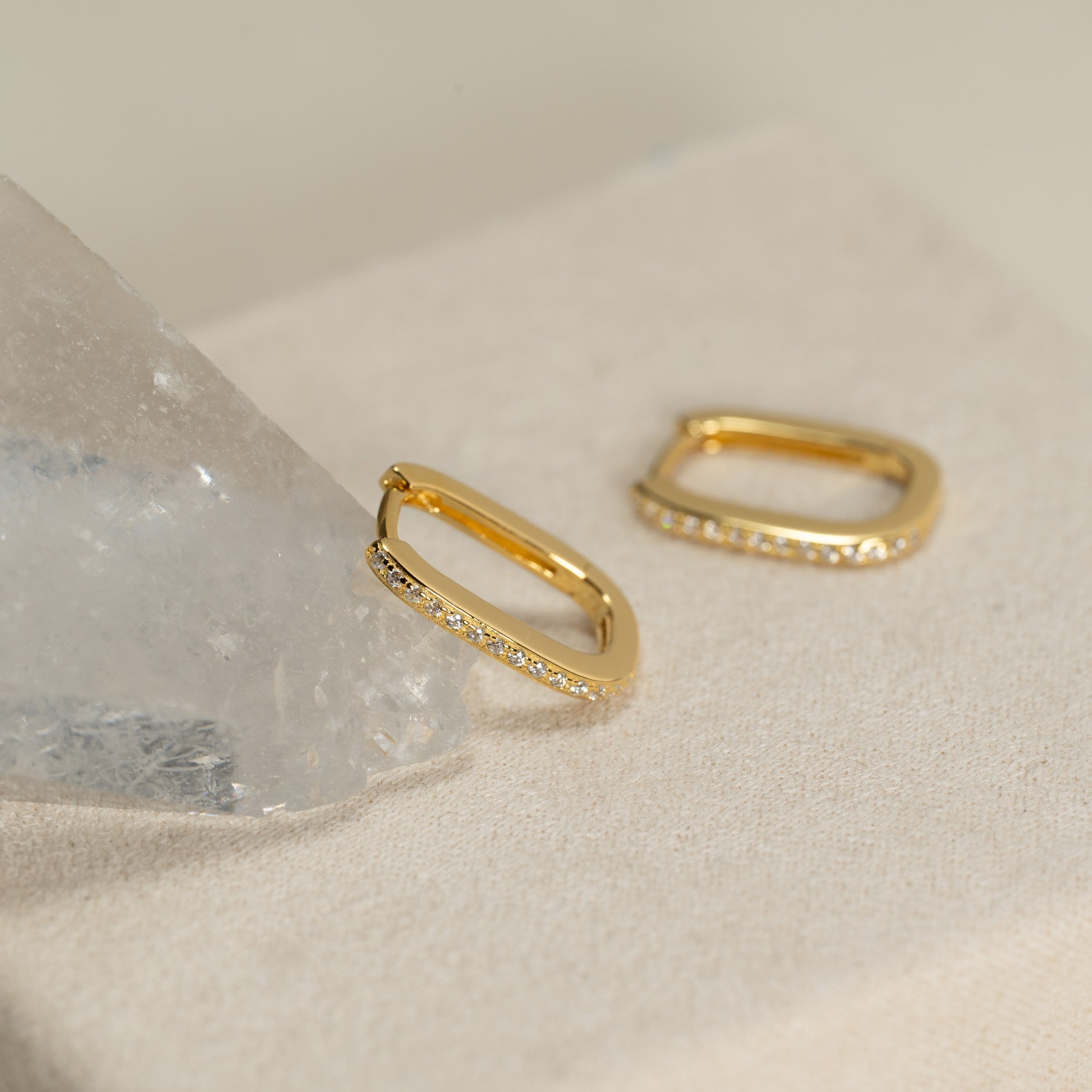Oval huggie earrings made from 100% recycled 18-karat gold-plated silver with cubic zirconia. The earrings have a modern look and can easily be paired with other earrings, making them perfect for an everyday style.
