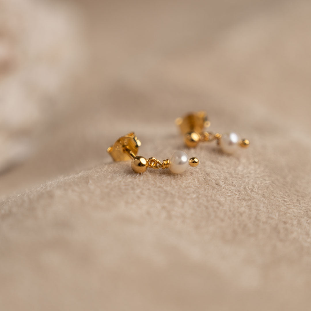 These ear studs are designed with small fine gold-plated balls on the stud itself and white freshwater pearls below. . The design gives the earrings on one side an elegant and classy appearance, but creates at the same time also modern expression.