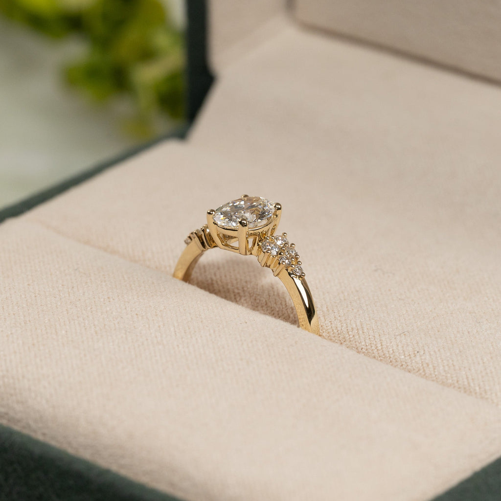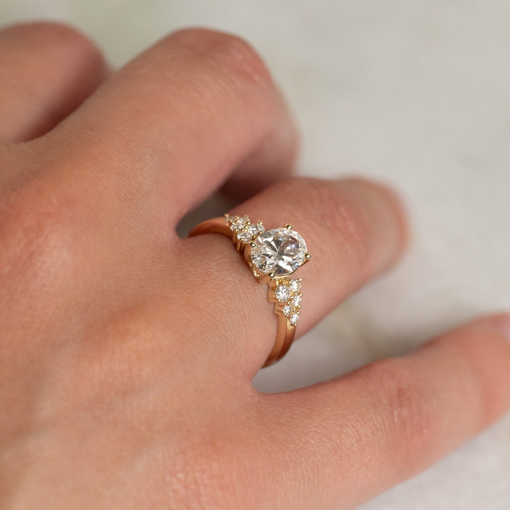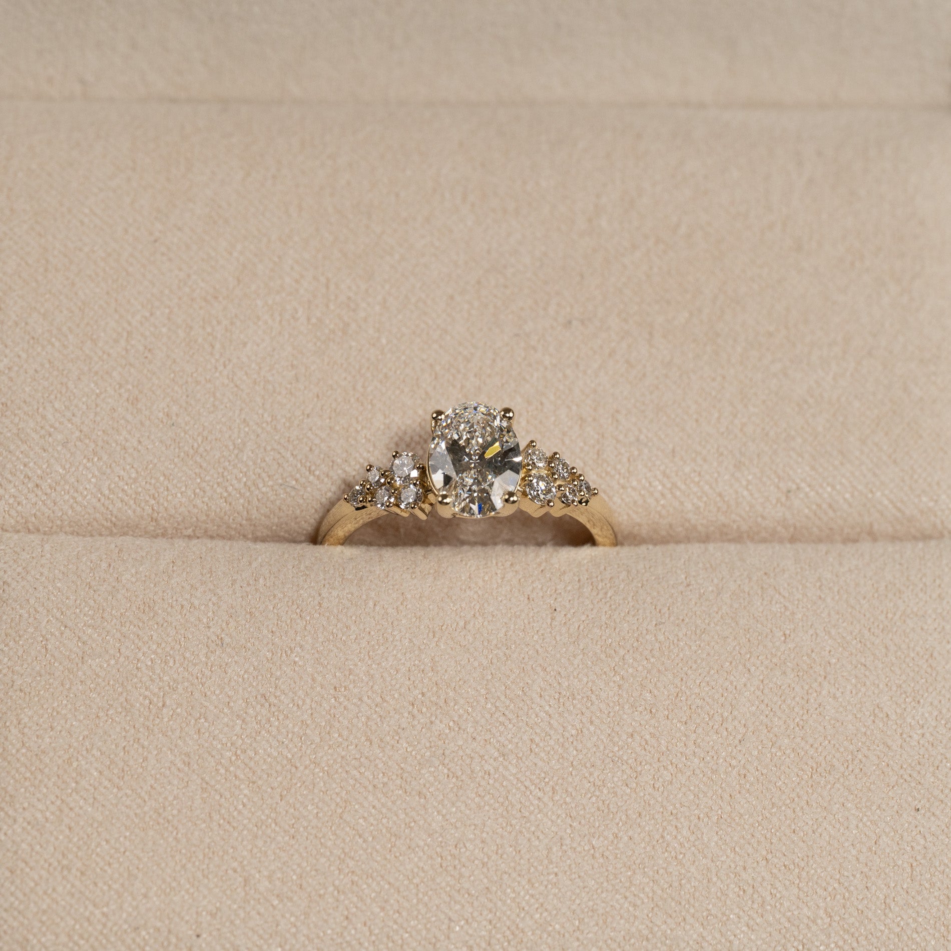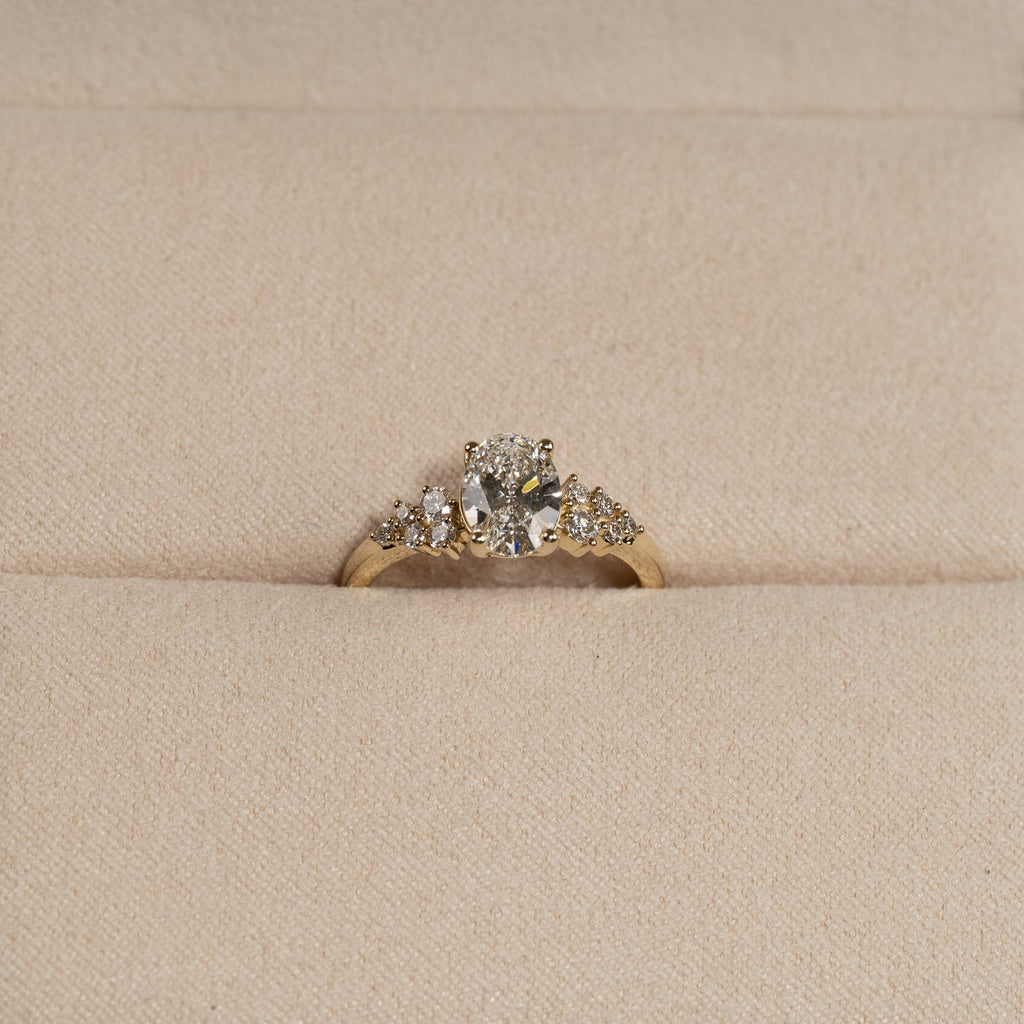 Oval cluster ring in 14kt. gold with a 1.1 ct. lab-grown centre stone framed by delicate side diamonds.