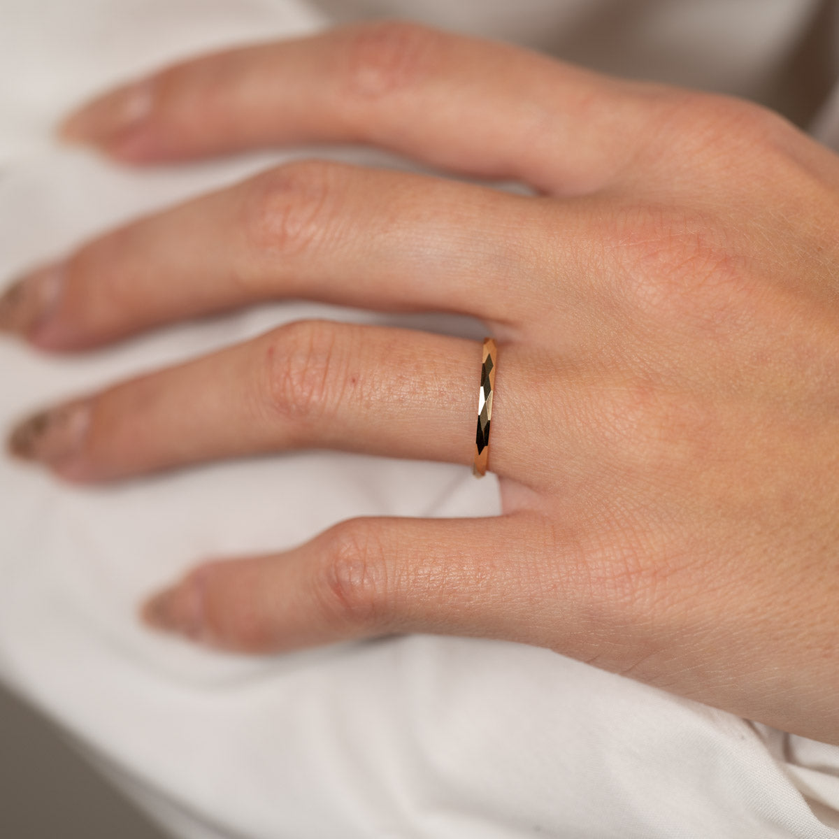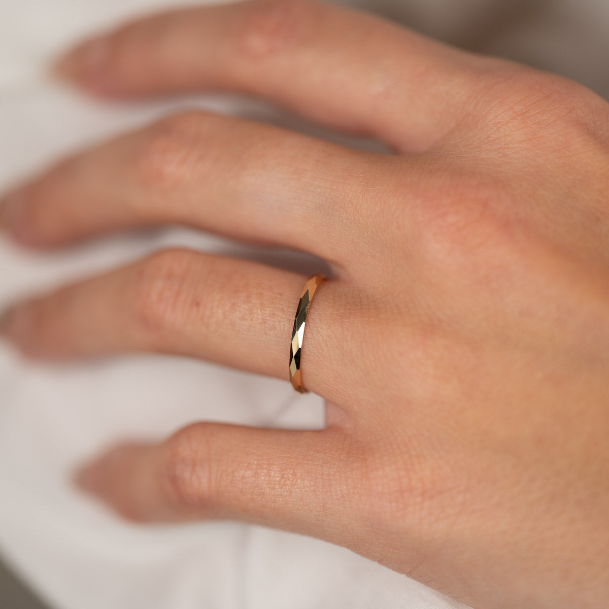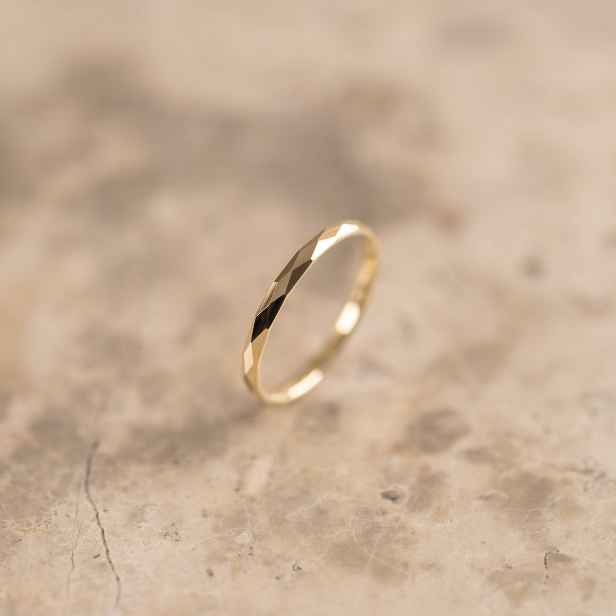 The ring is crafted from 100% recycled 9 karat solid gold. It features a faceted / diamond-cut surface that adds texture and fine details to the ring.