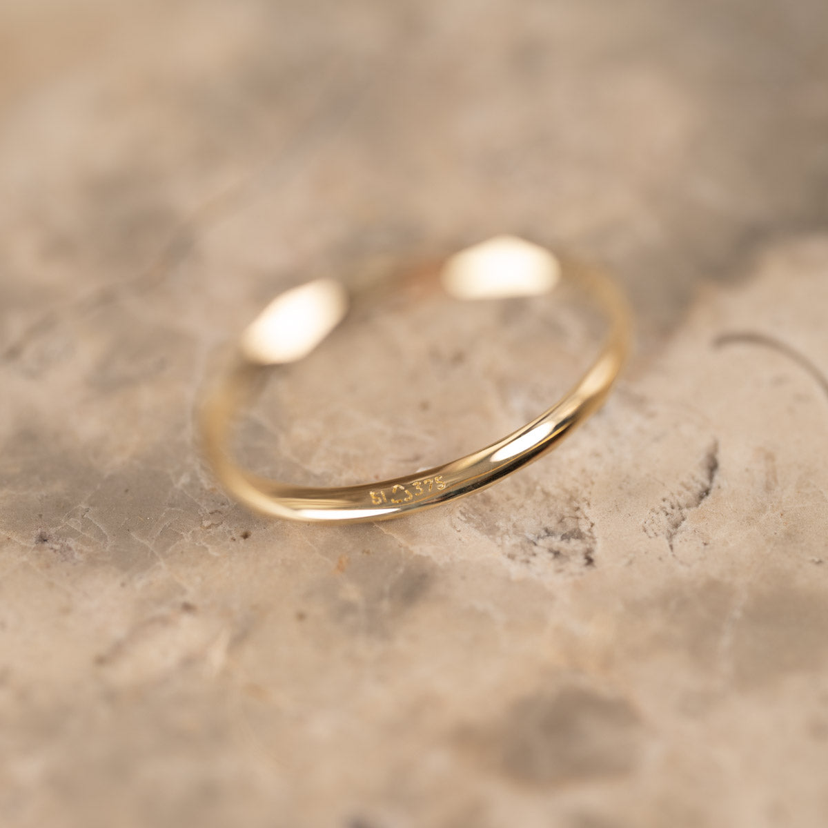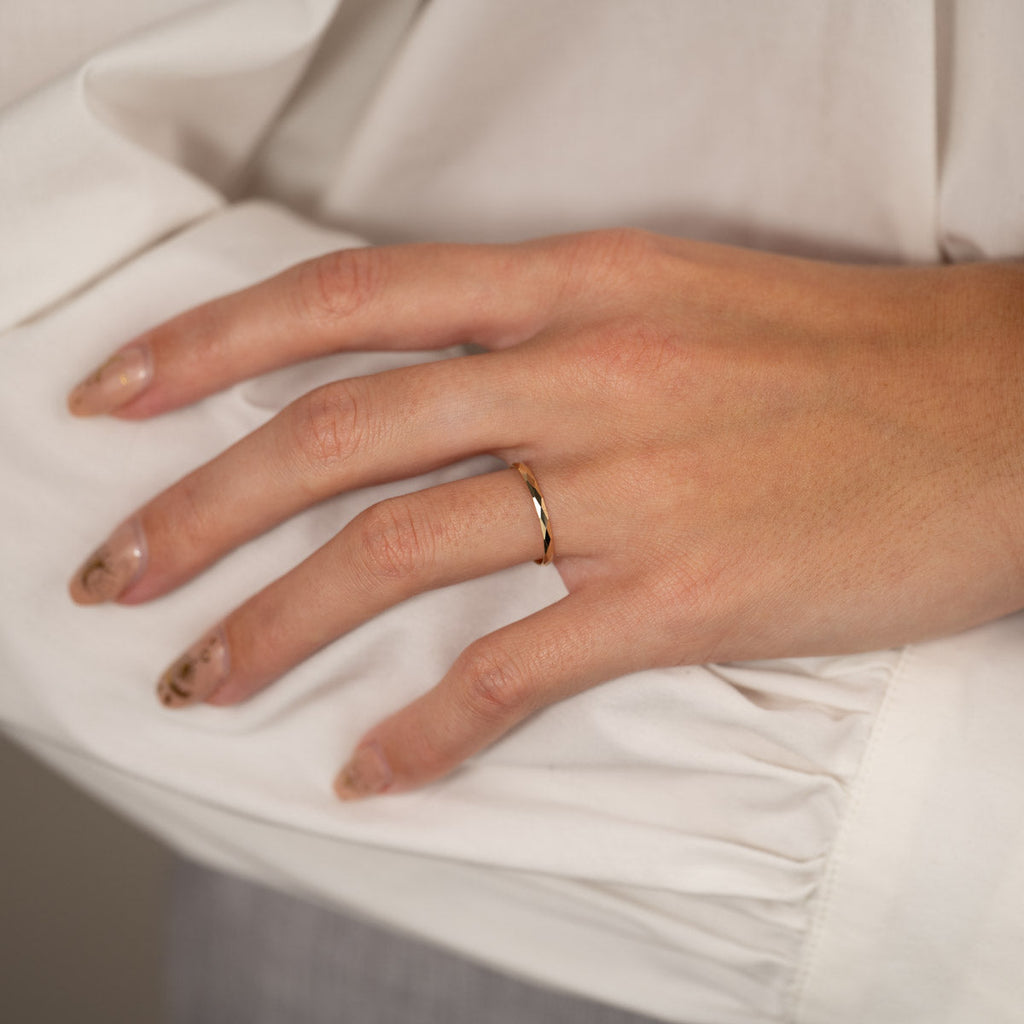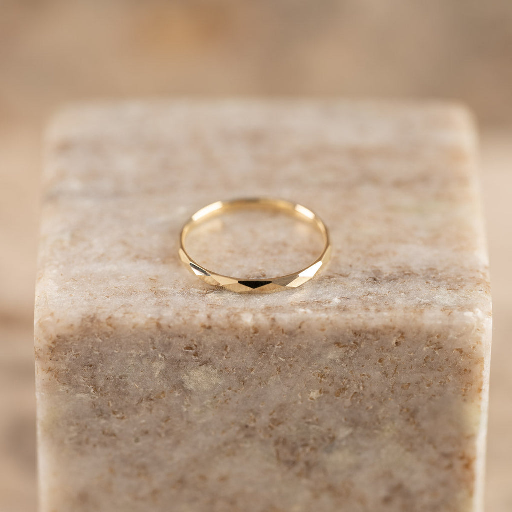 The ring is crafted from 100% recycled 9 karat solid gold. It features a faceted / diamond-cut surface that adds texture and fine details to the ring.