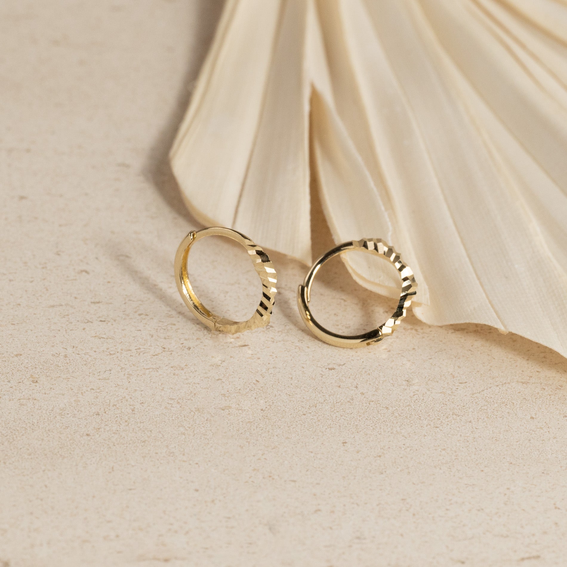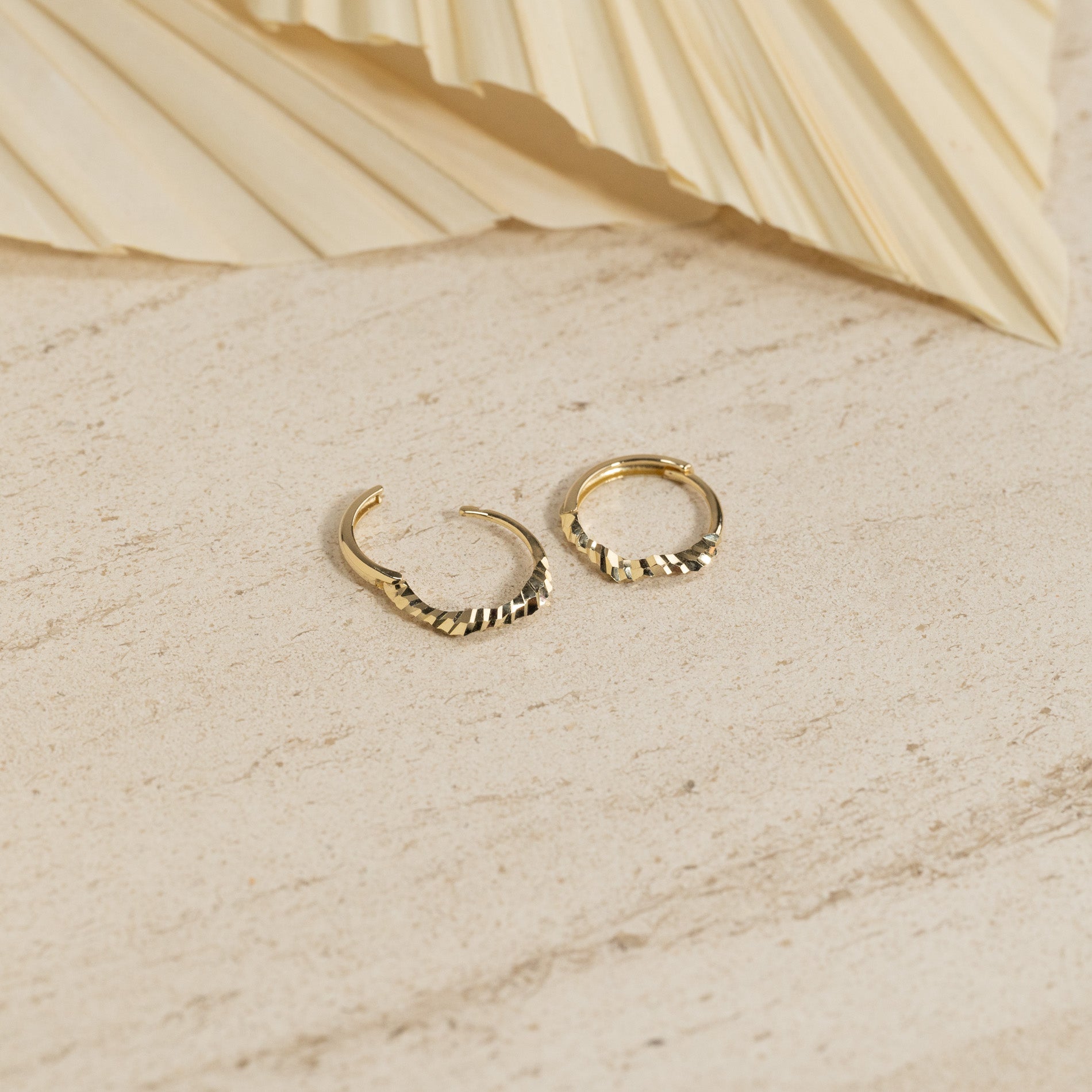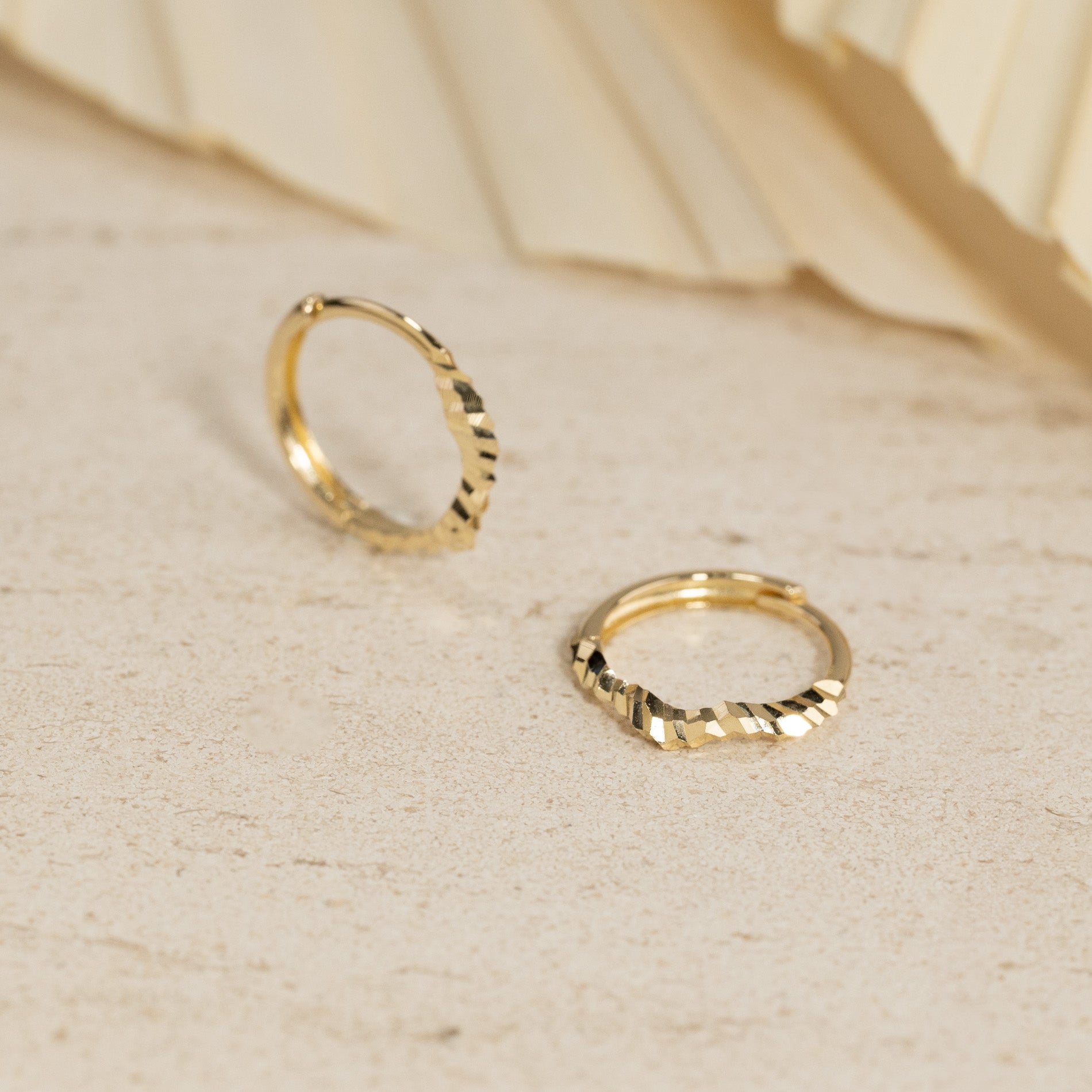 The earrings are made from 100% recycled 9 karat solid gold. They have a faceted/diamonded surface that adds structure and fine details to the hoops.