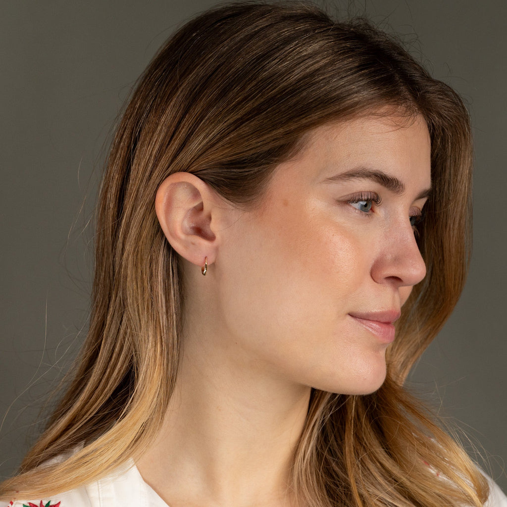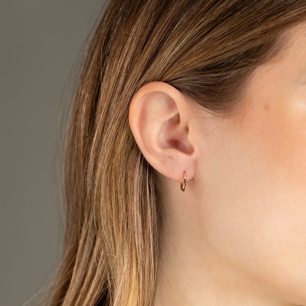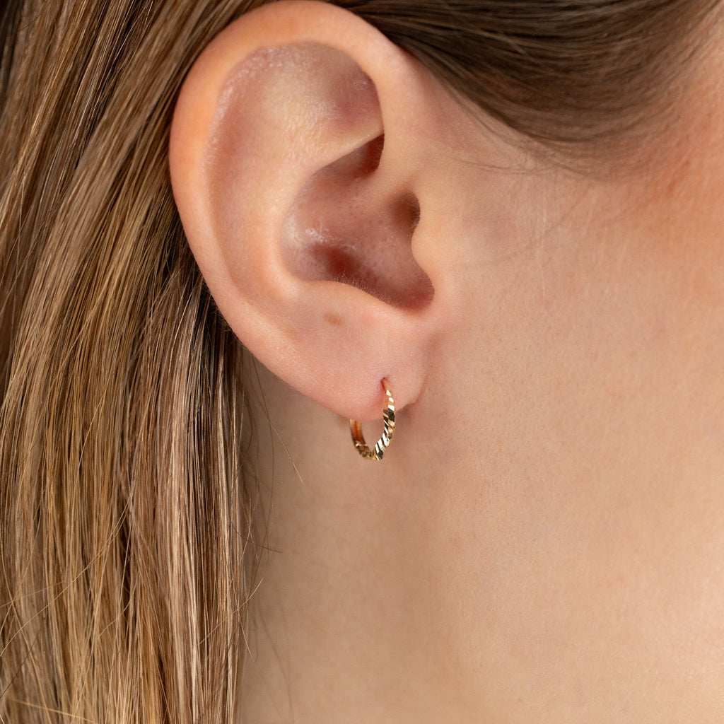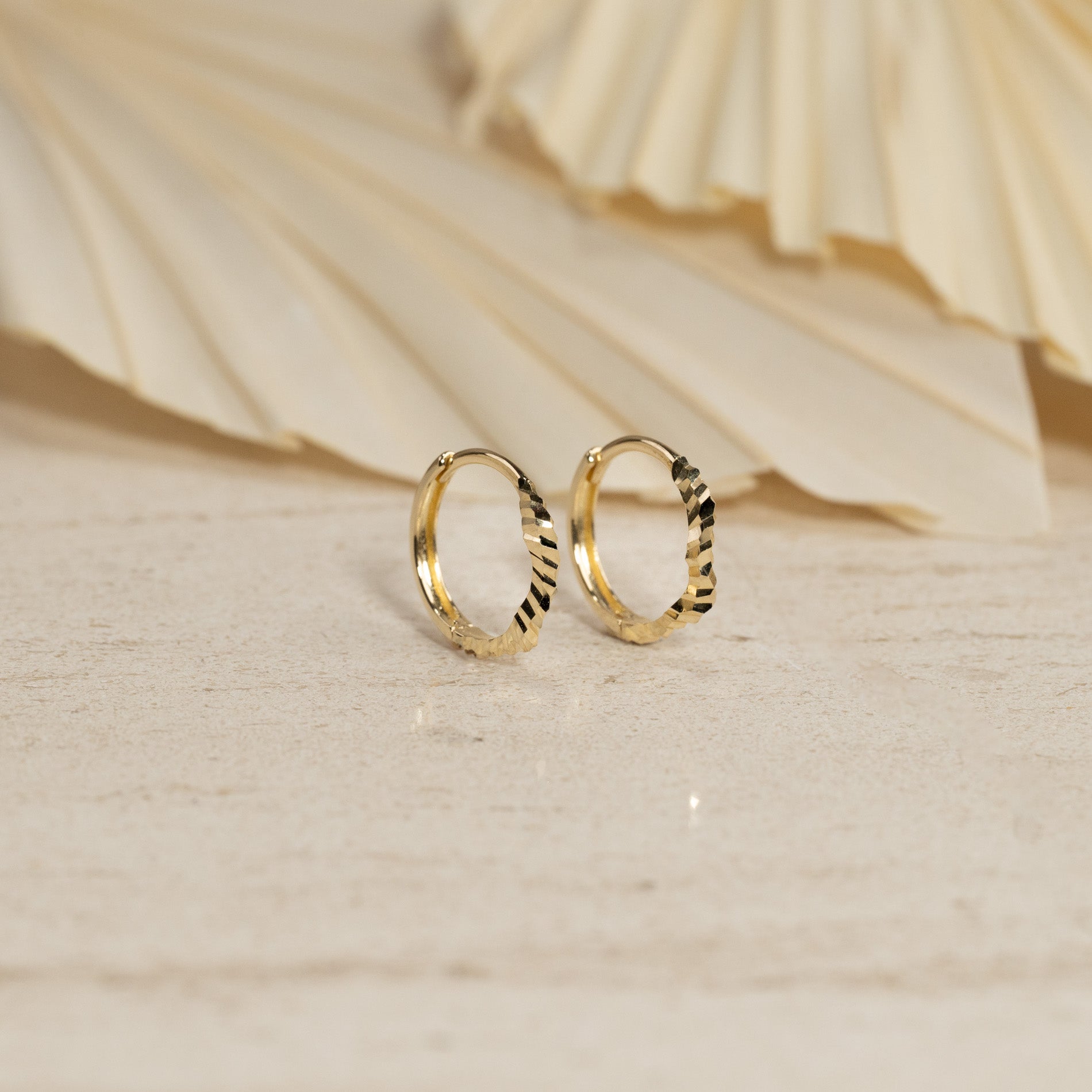 The earrings are made from 100% recycled 9 karat solid gold. They have a faceted/diamonded surface that adds structure and fine details to the hoops.