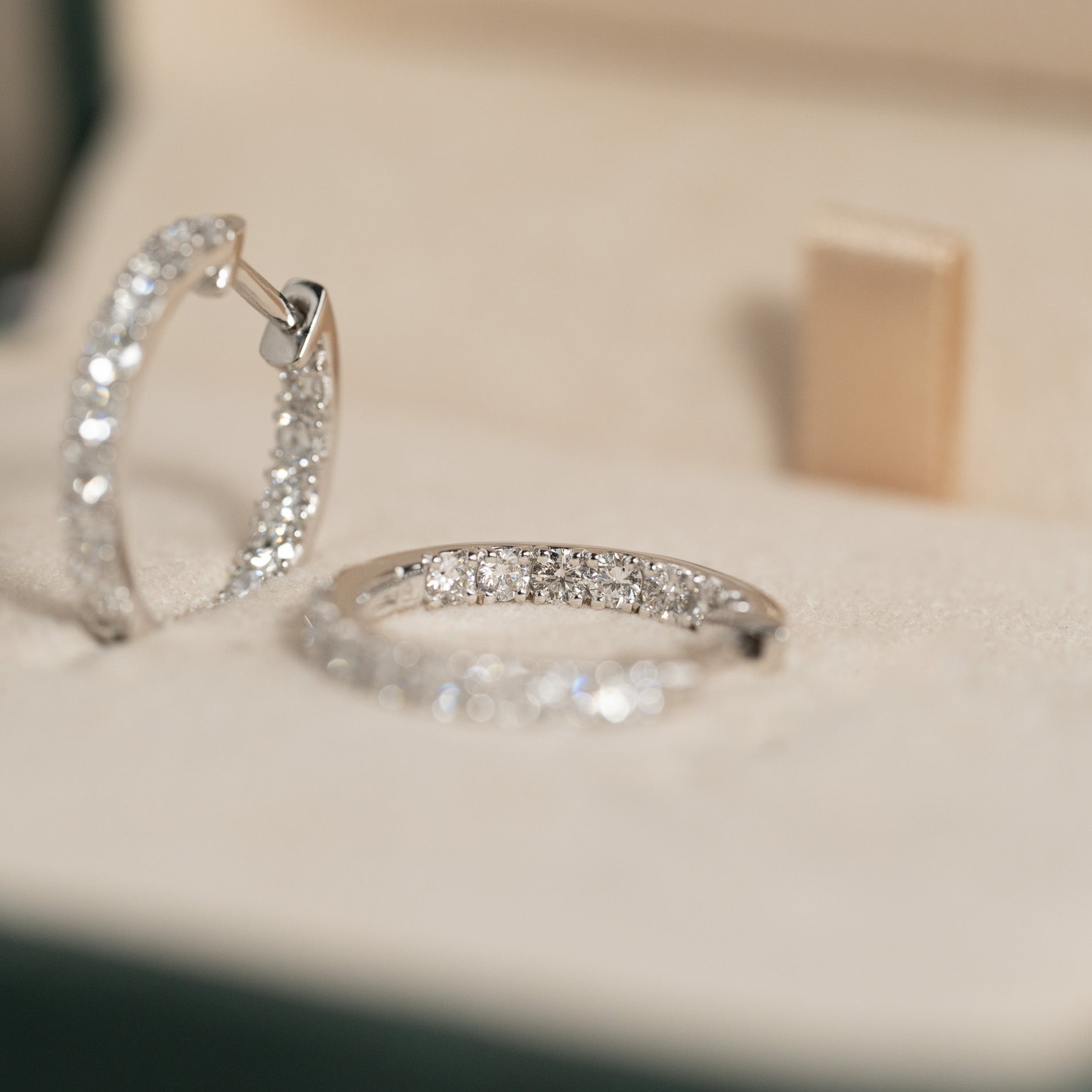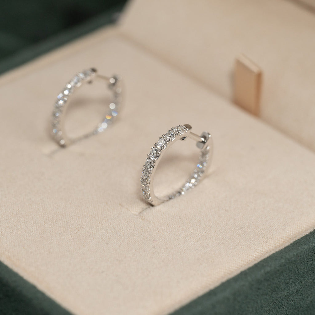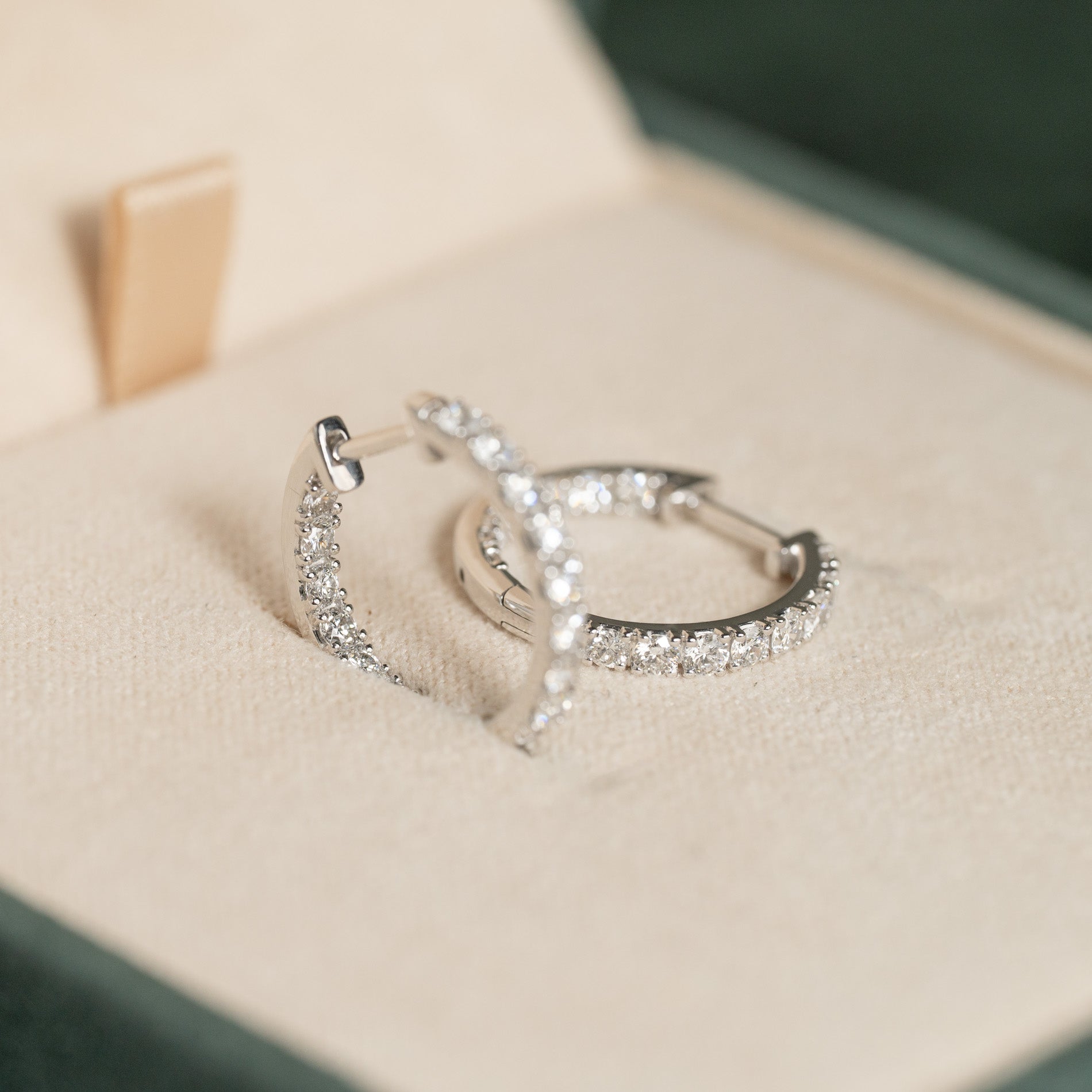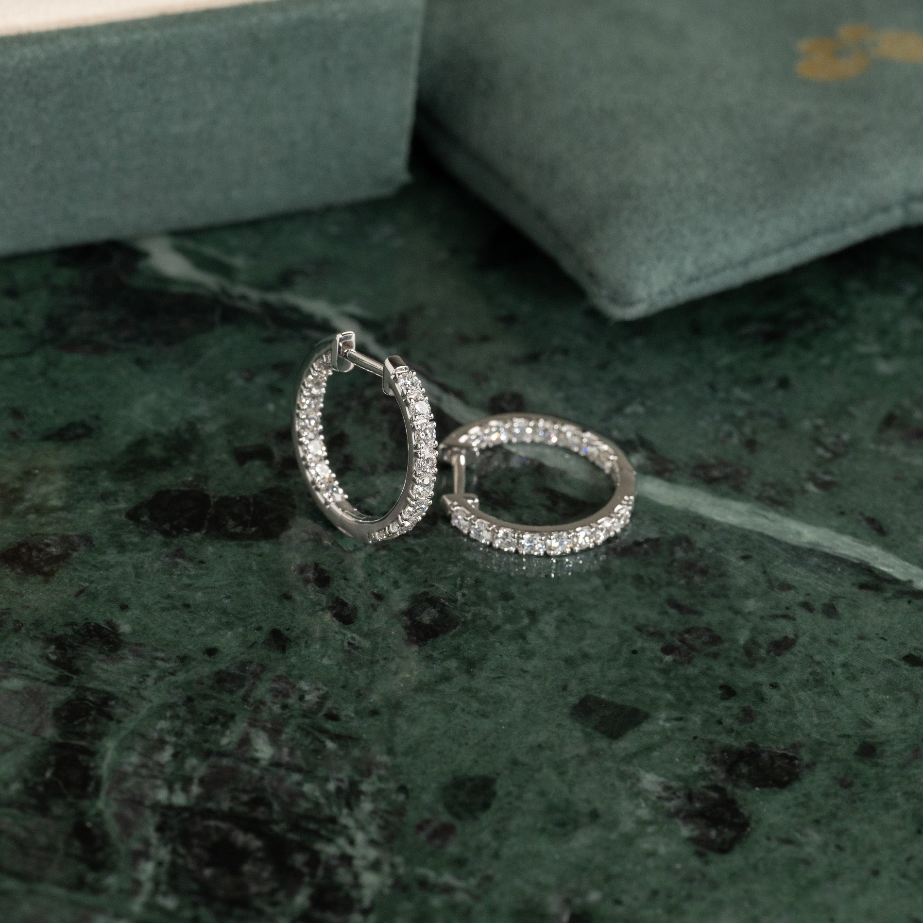 Hoops in 14 karat white gold set with 0.8 ct. lab-grown diamonds inside and out.