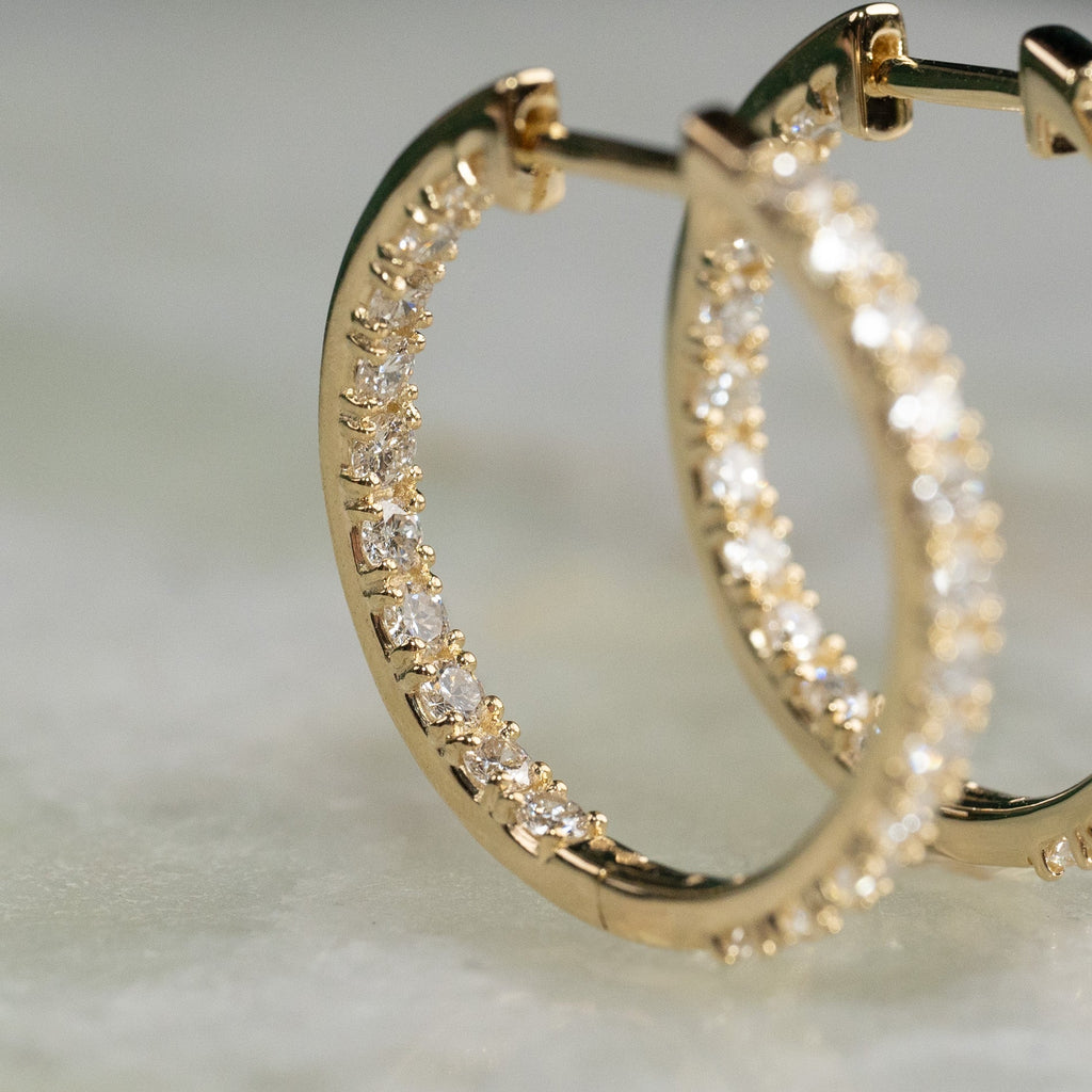 Hoops in 14 karat gold set with 1.25 ct. lab-grown diamonds inside and out. The earrings are modern, extraordinary and incredibly elegant. They are perfect for festive events or if you want a decadent everyday piece of jewelry that stands out. They are sized 22 mm in diameter.