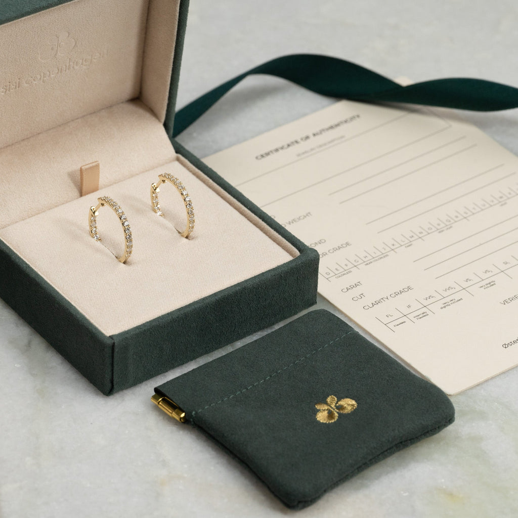 The jewelry comes in our exclusive Diamond Collection box with a beautiful jewelry box, certificate and pouch. The box is also perfect if you want to give the jewelry as a gift.