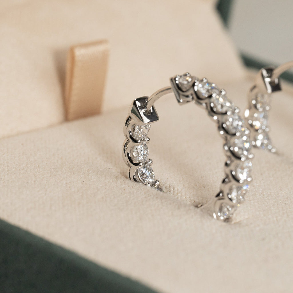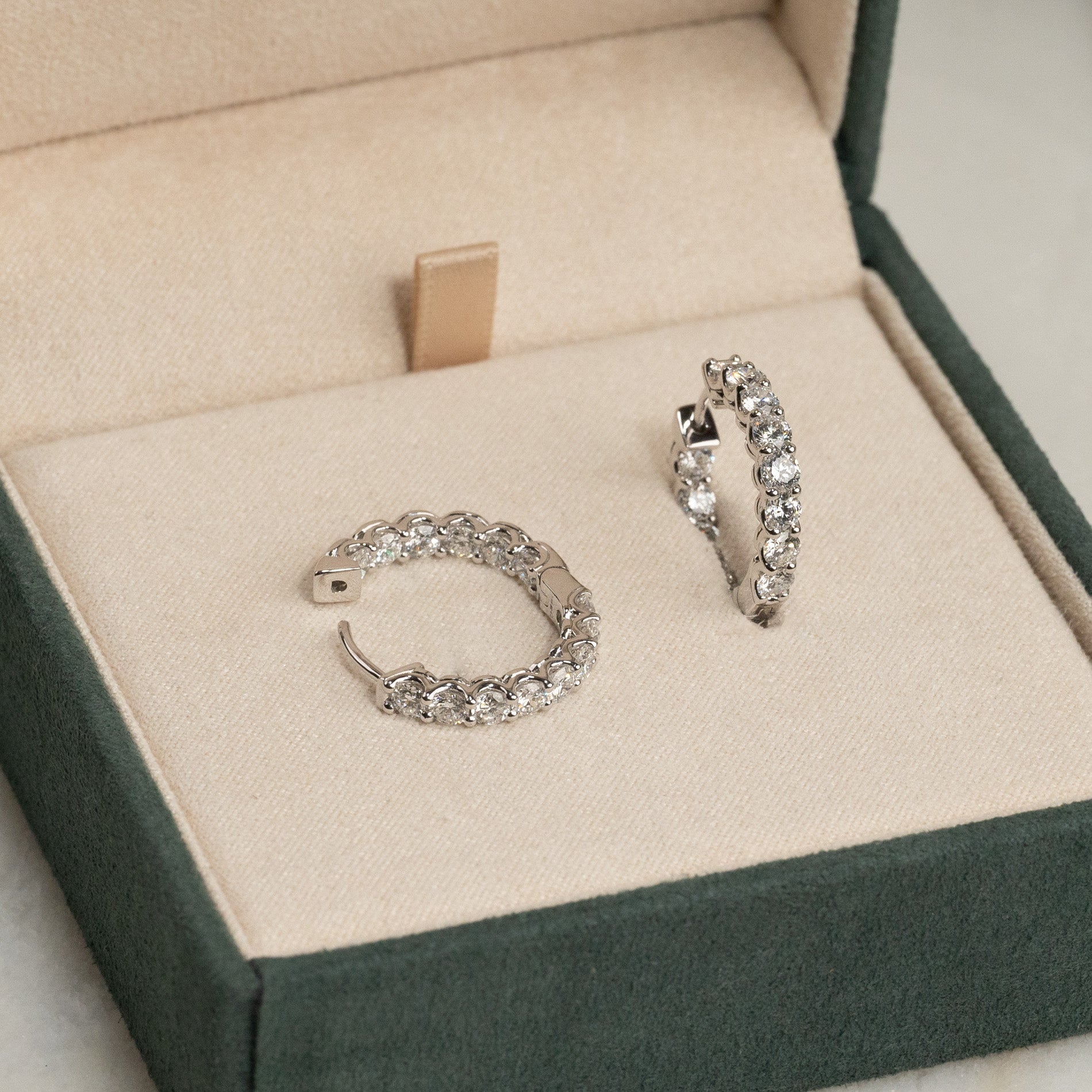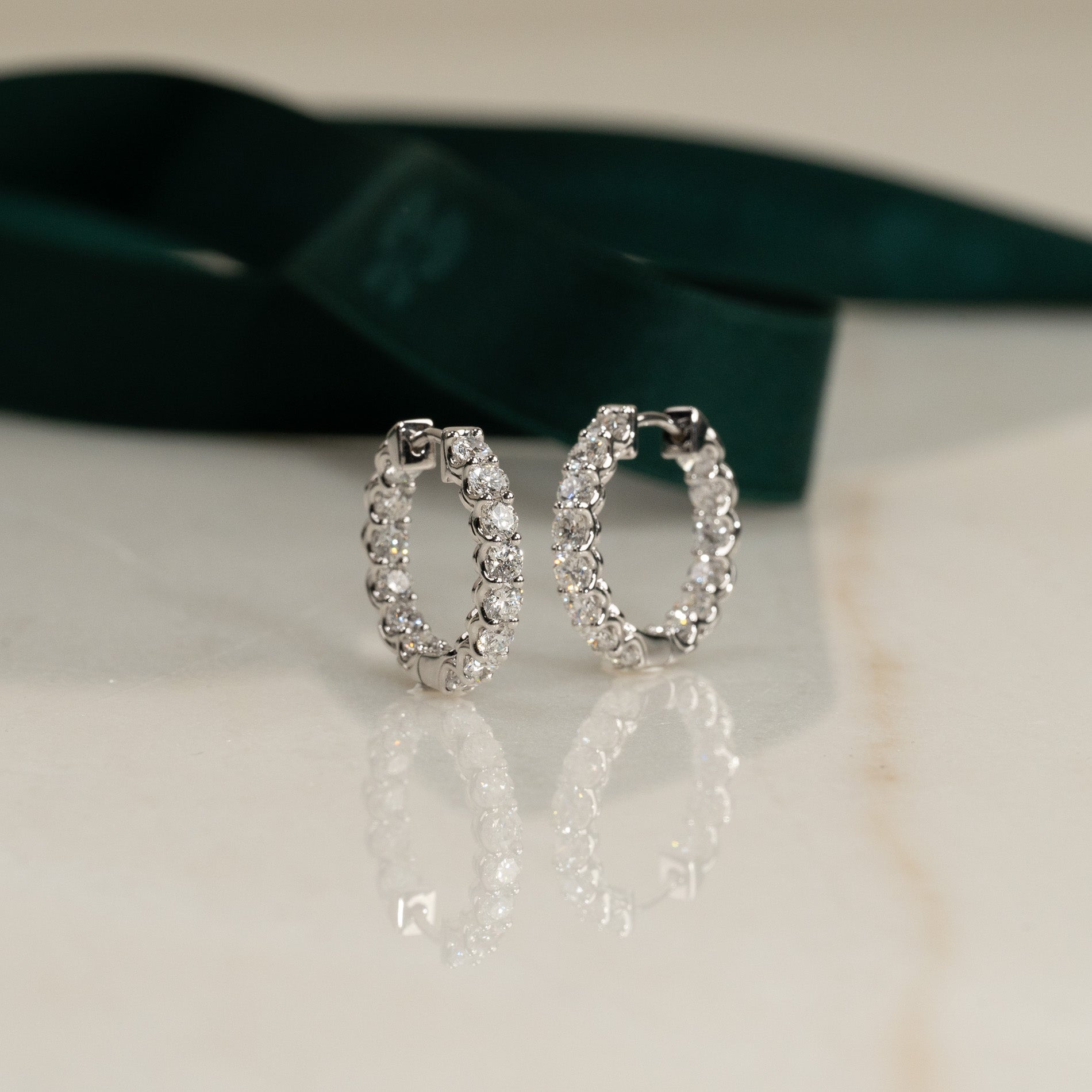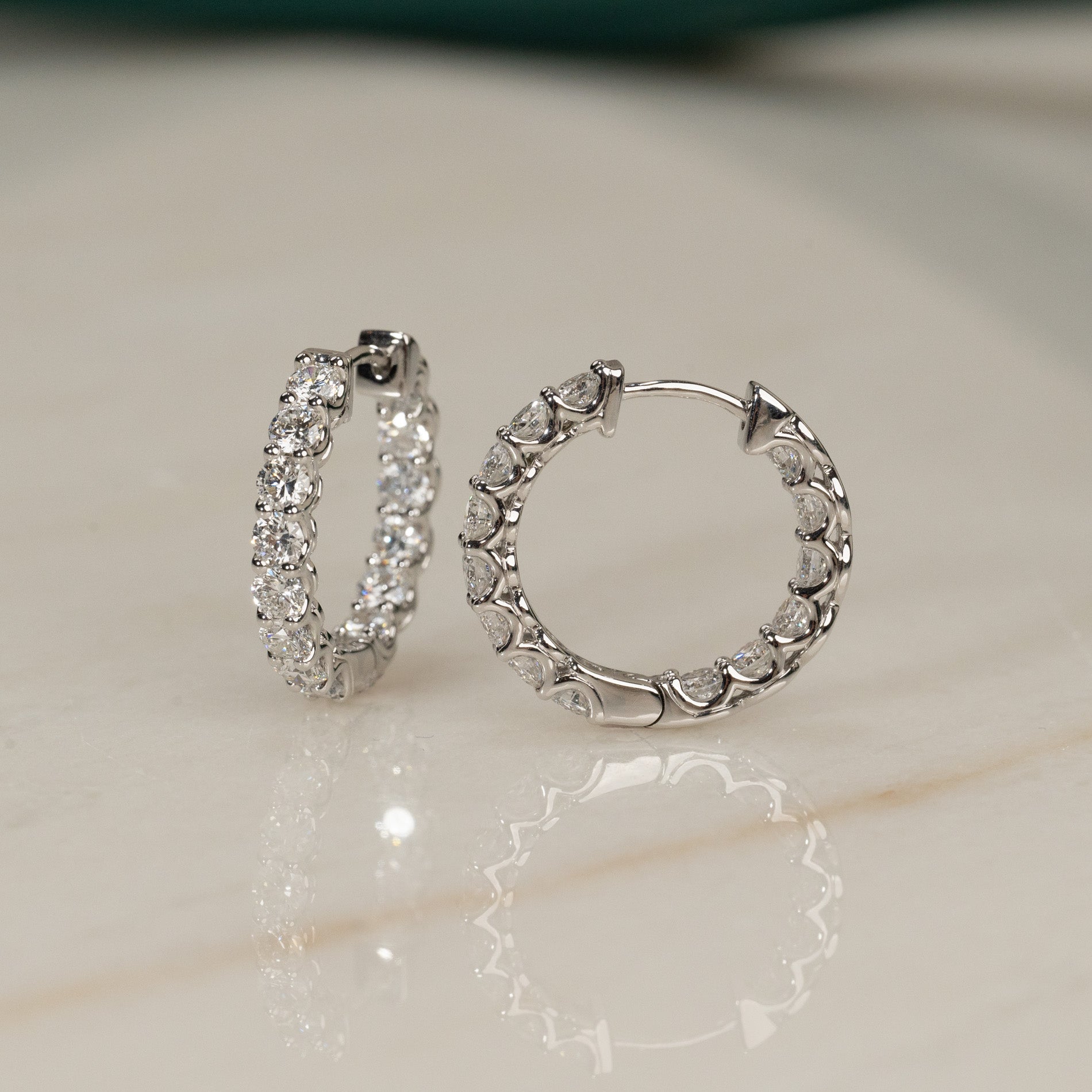 Hoops in 14 karat white gold set with 2.8 ct. lab-grown diamonds inside and out.