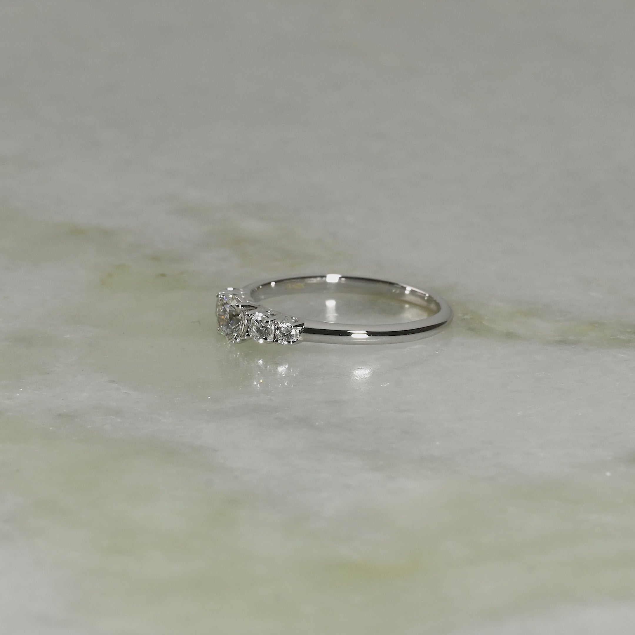 The ring is crafted in 14 karat solid white gold with five lab-grown diamonds totaling 0.5 ct. The diamonds have a color grade of E/F (River) and clarity of VVS. This piece of jewelry is thoughtfully made; the diamonds are produced using solar energy, and the gold is 100% certified recycled.