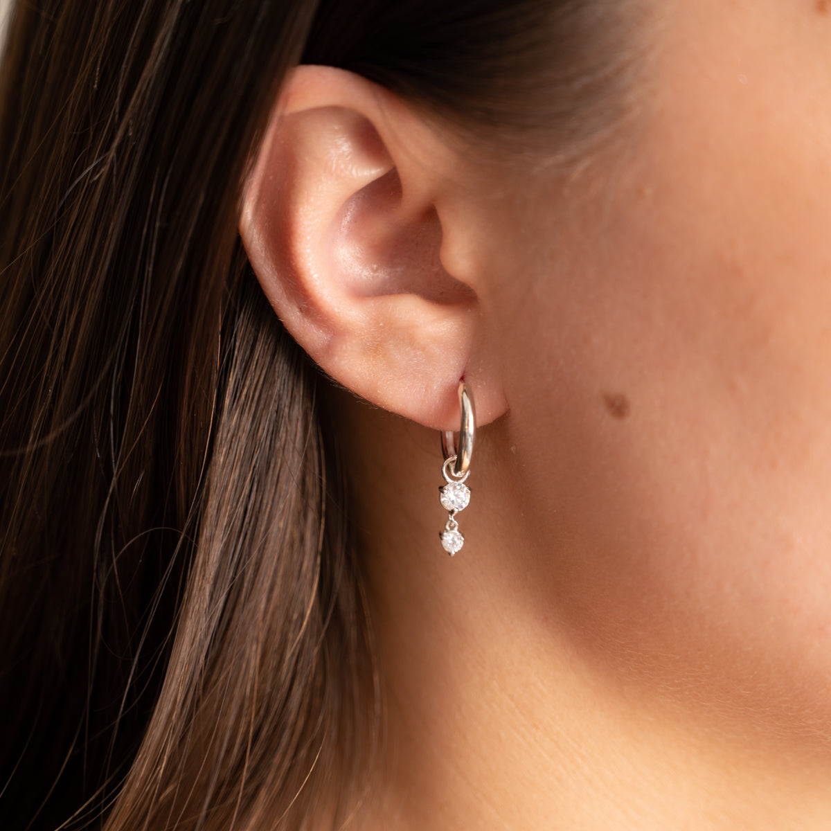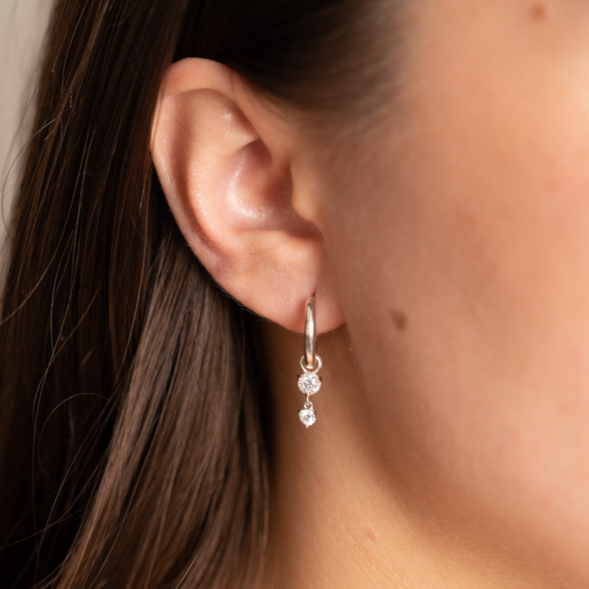Small creoles in 925 sterling silver with pendants of two zircons. Our Elenor earrings are timeless classics that never go out of fashion. The pendant can easily be taken off the creole, thereby making the earrings into functioning as 2-in-1, where you can skip the pendant if you want to have a more simplistic approach.