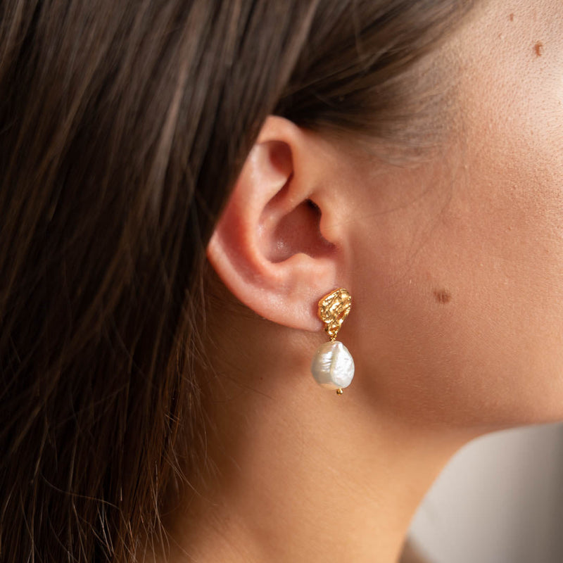 Our Ella earrings are made of 100% recycled 18-carat gold-plated sterling silver with a lovely white baroque freshwater pearl. The earrings consist of a piece next to the ear lobe, which has a beautifully textured surface. From this piece, the freshwater pearl hangs dynamically.