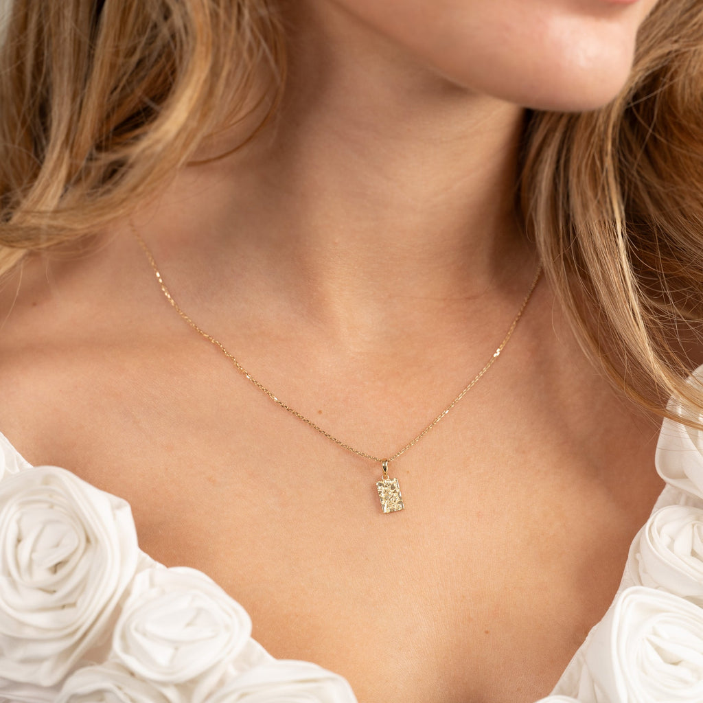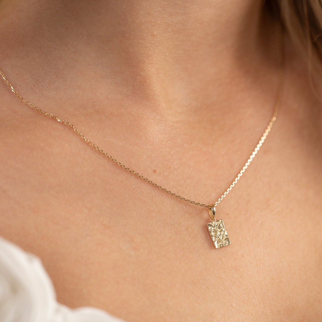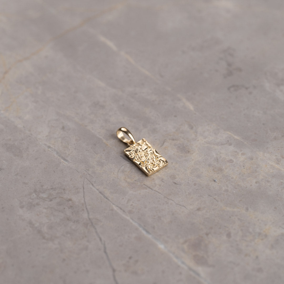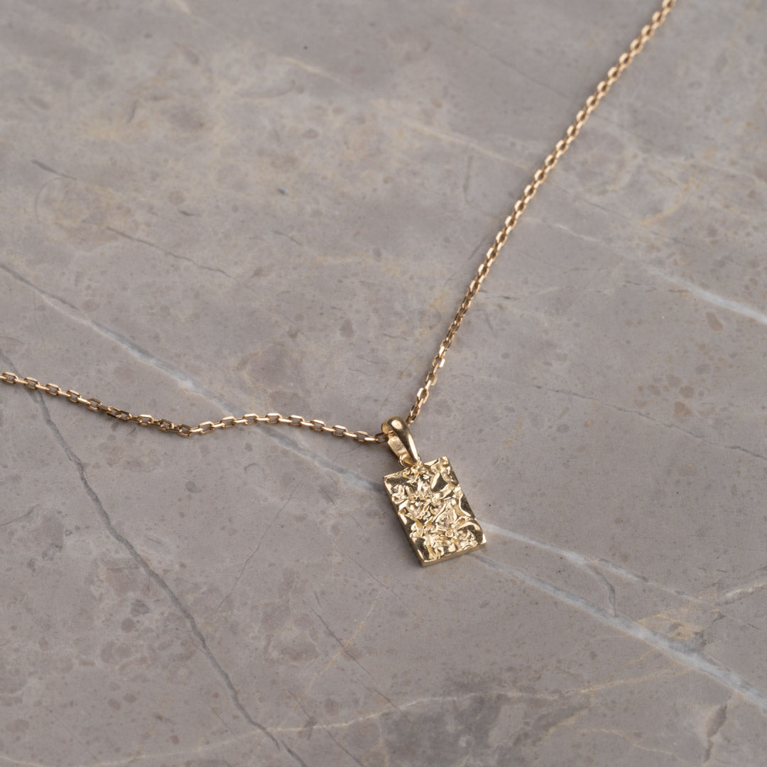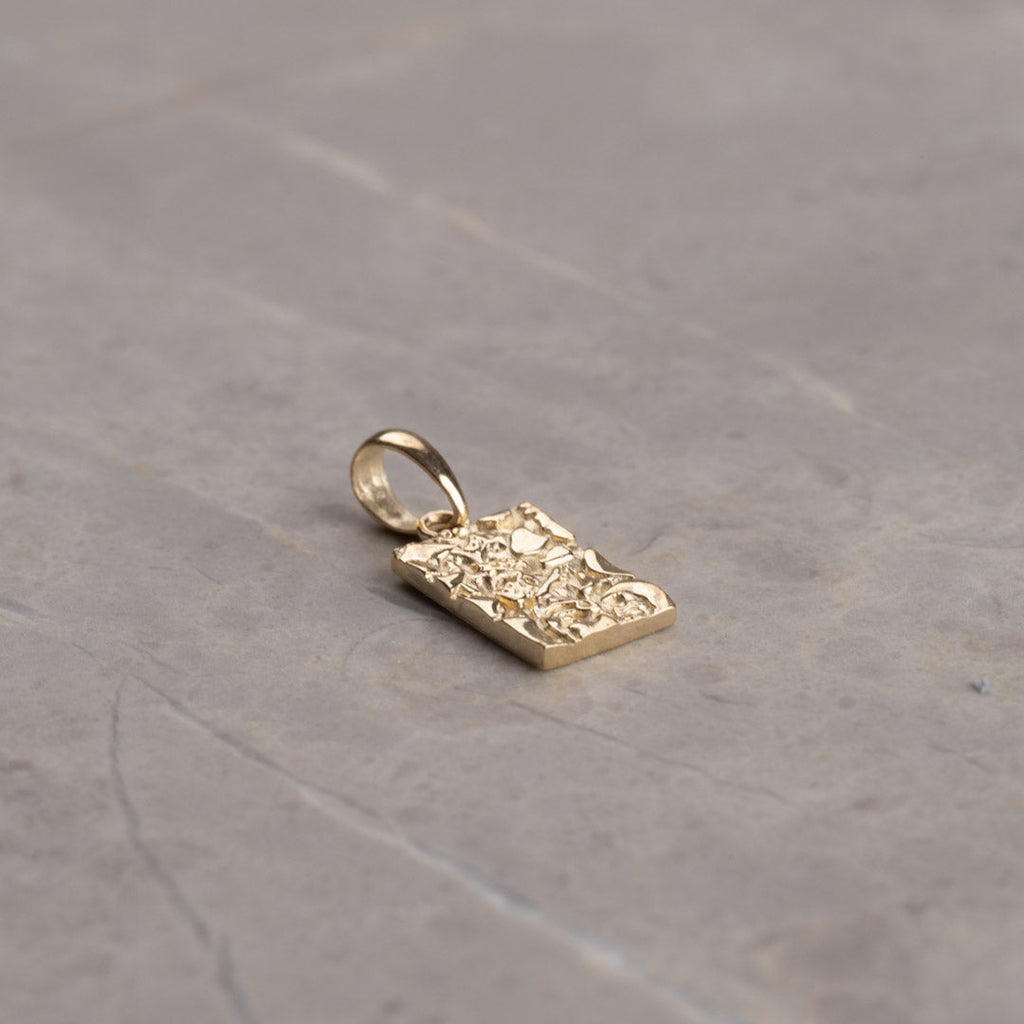 Pendant in solid gold in a rectangle form. The surface of the pendant is molded, giving a nice and light raw structure. The square itself measures 6.5x10mm (without the wish)