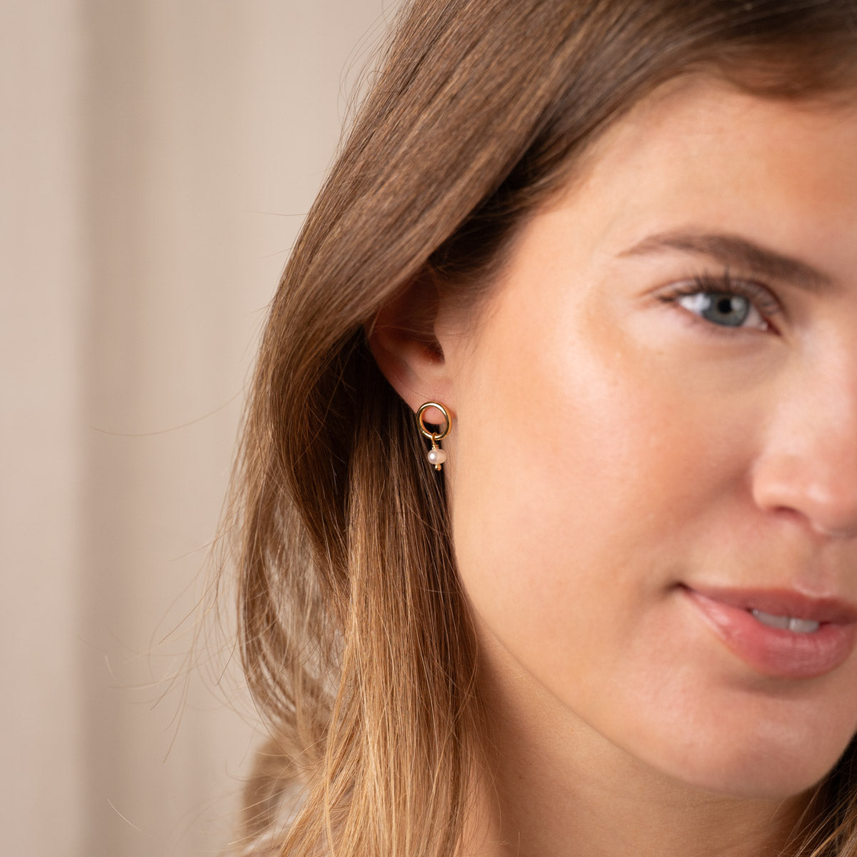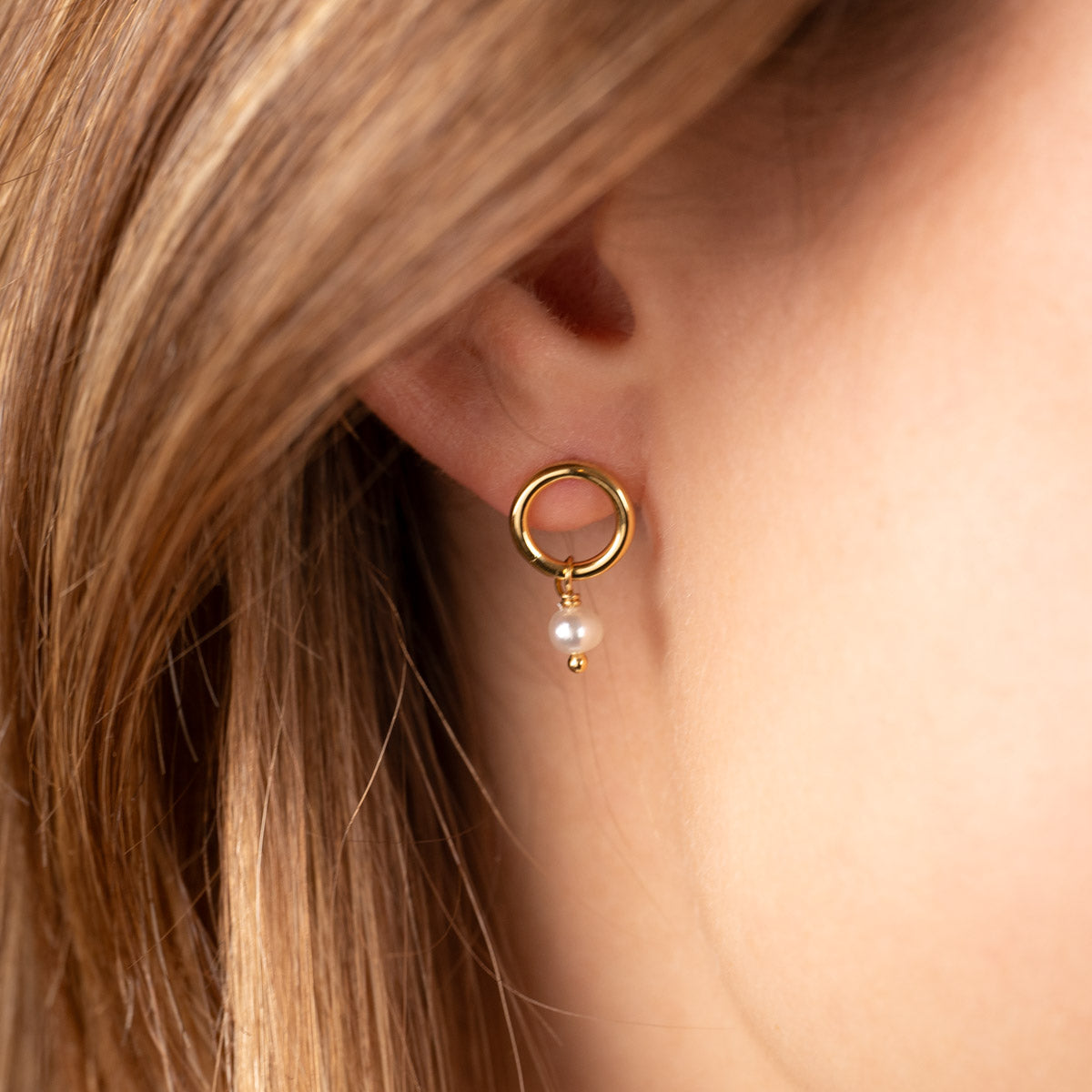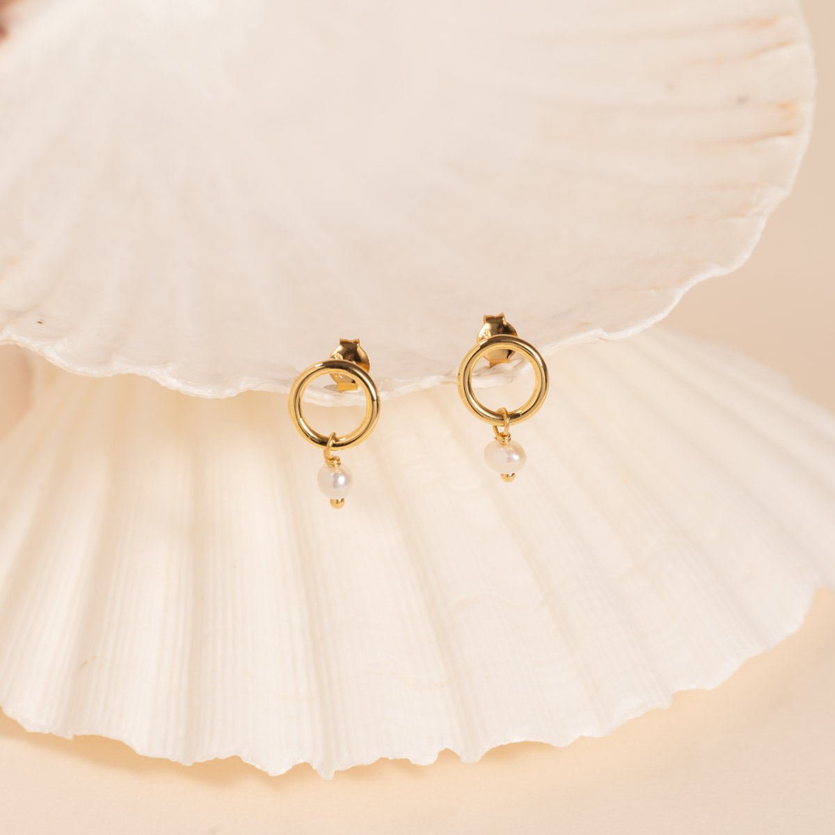 The Fiona earrings are created in recycled 18 karat gold-plated sterling silver. The earrings are designed in the shape of a circle, with a white freshwater pearl hanging as a pendant on the earring. The expression is classic and elegant, with a feminine touch from the delicate pearl. The earrings are perfect as everyday jewelry or as a simple accessory for a festive occasion.