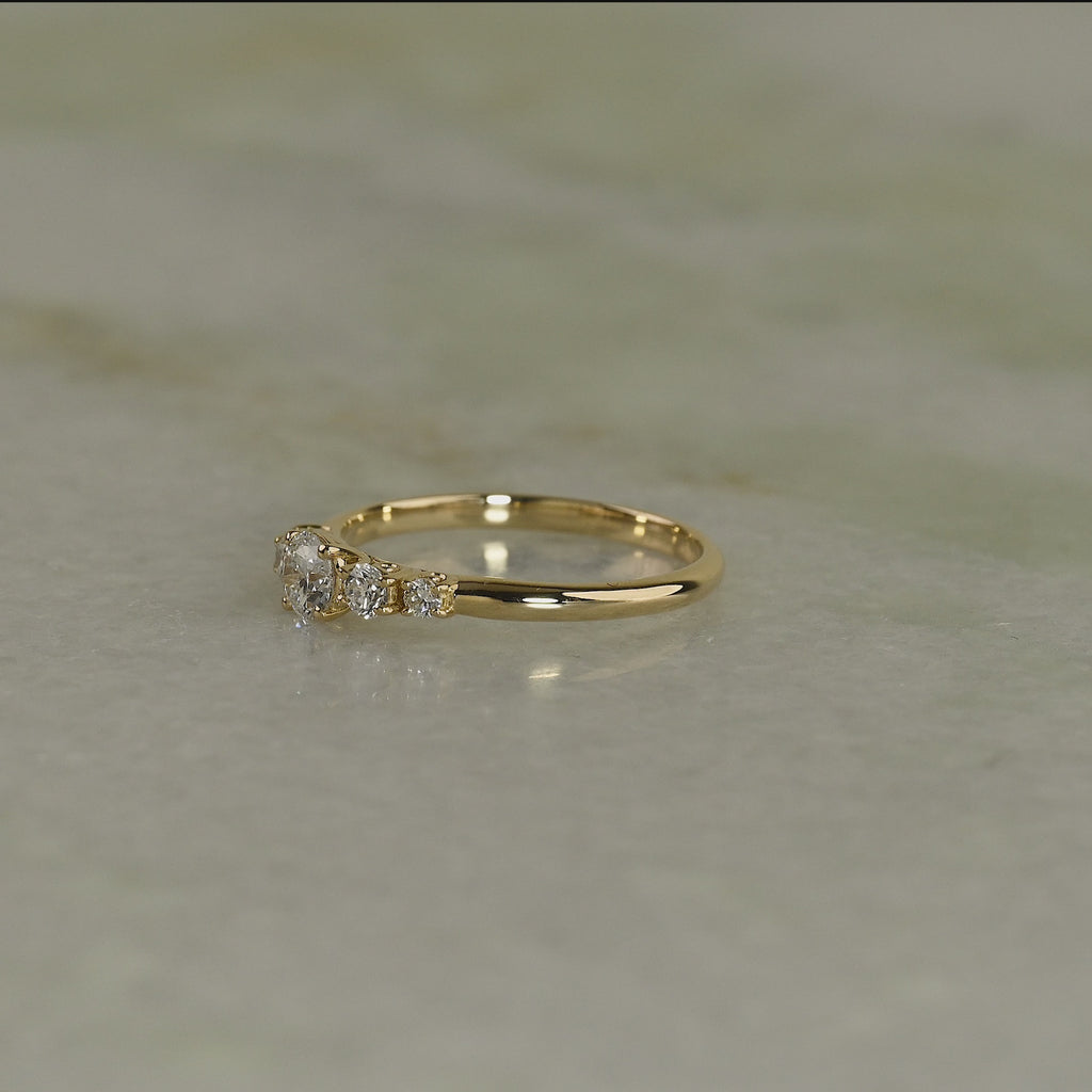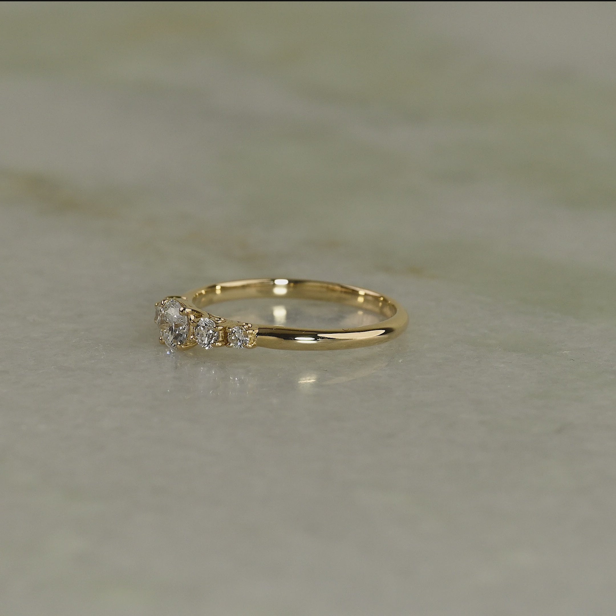 The ring is crafted in 14 karat solid gold with five lab-grown diamonds totaling 0.5 ct. The diamonds have a color grade of E/F (River) and clarity of VVS. This piece of jewelry is thoughtfully made; the diamonds are produced using solar energy, and the gold is 100% certified recycled.
