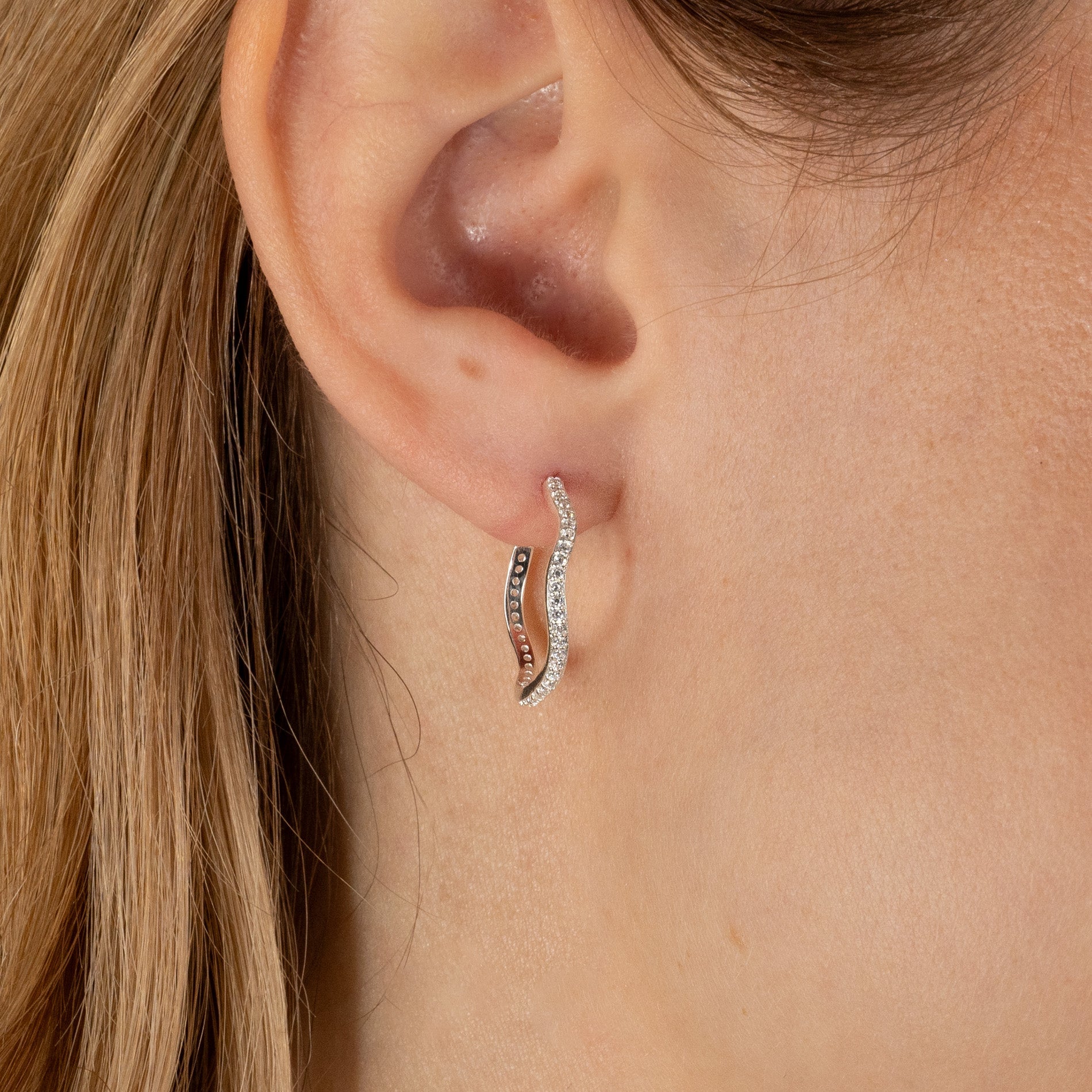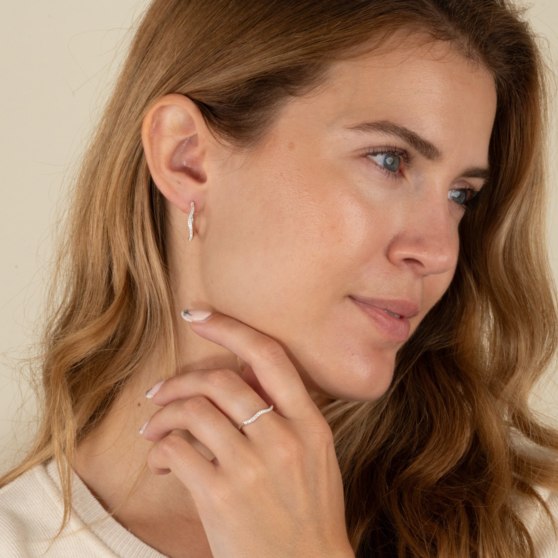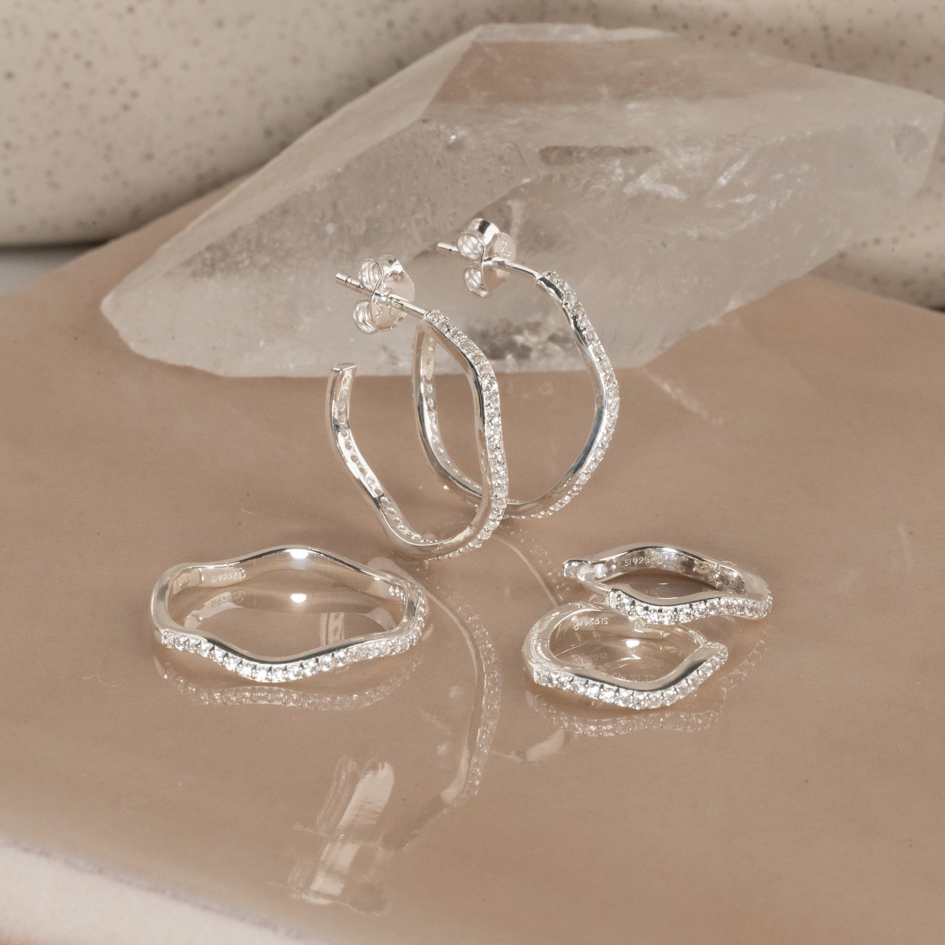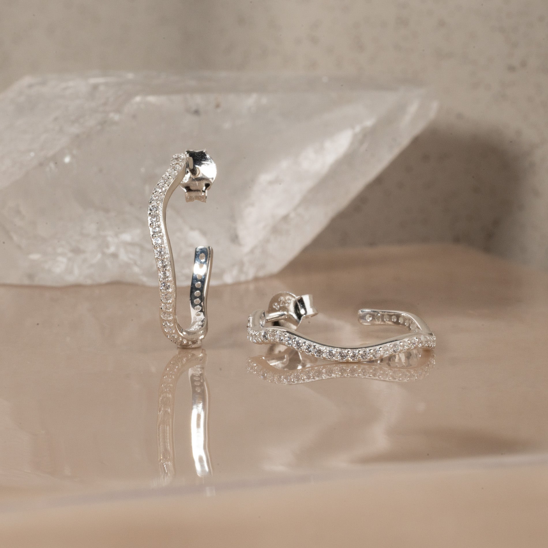 The earrings have a polished surface and are set with small clear zirconia. They are designed with a slight wave, making them appear organic and timeless.