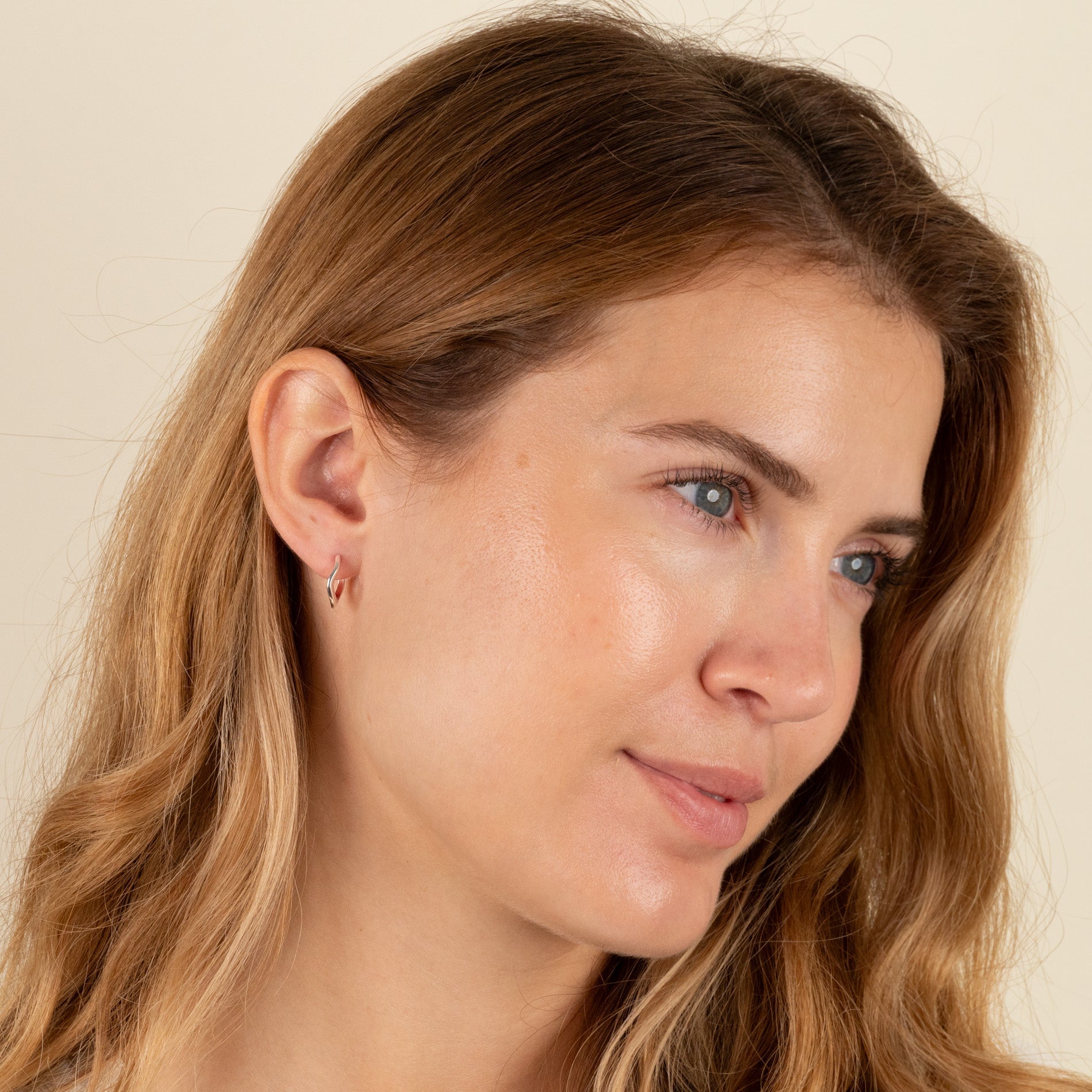 The earrings have a polished surface and are designed with a slight wave, making them appear organic, timeless, and feminine.