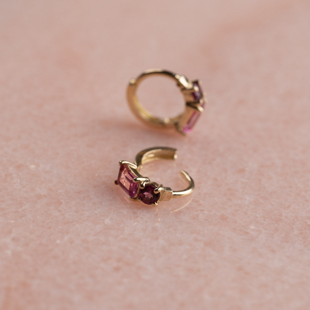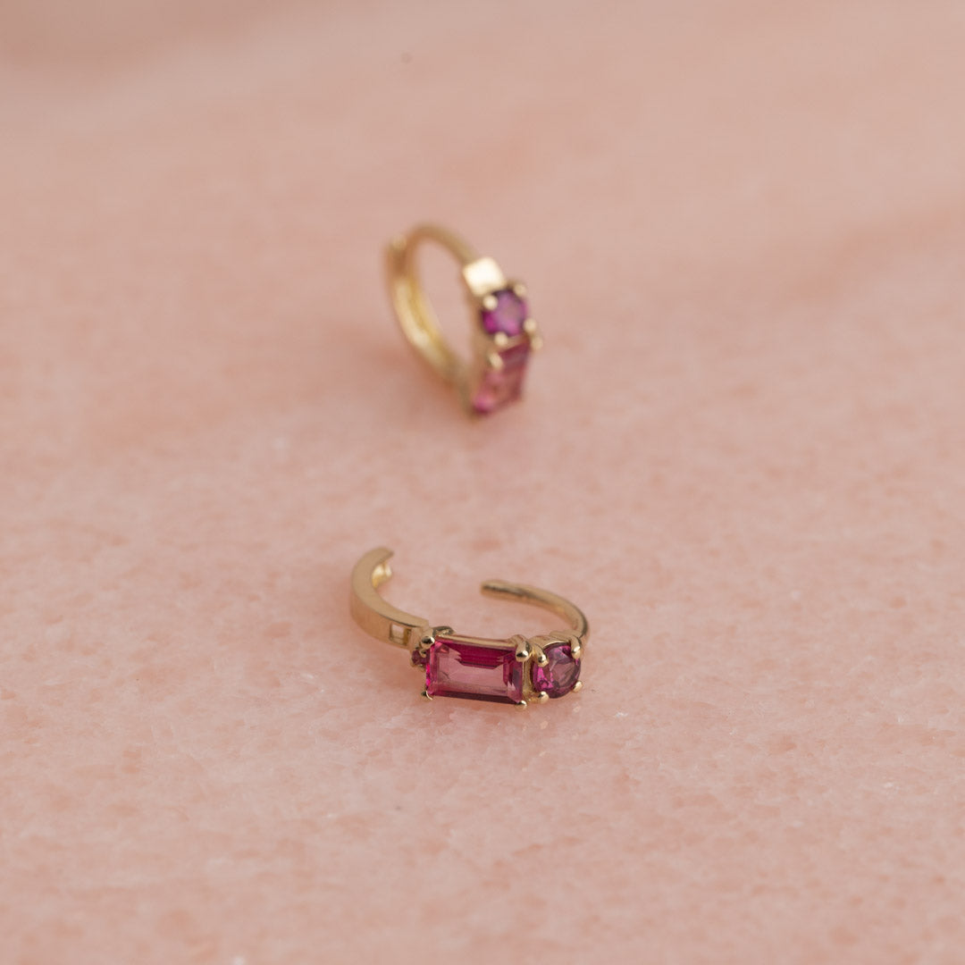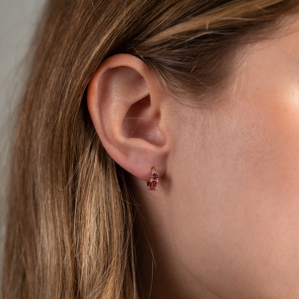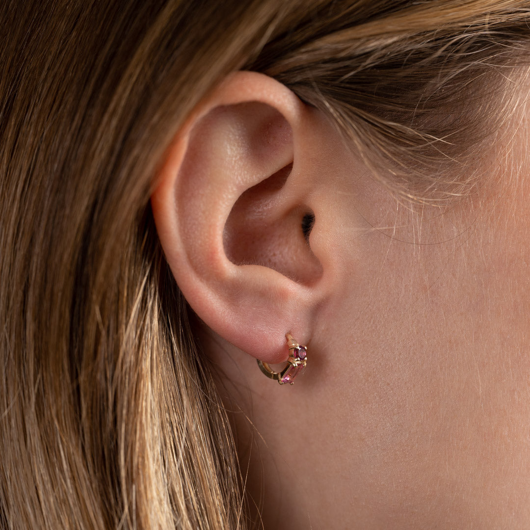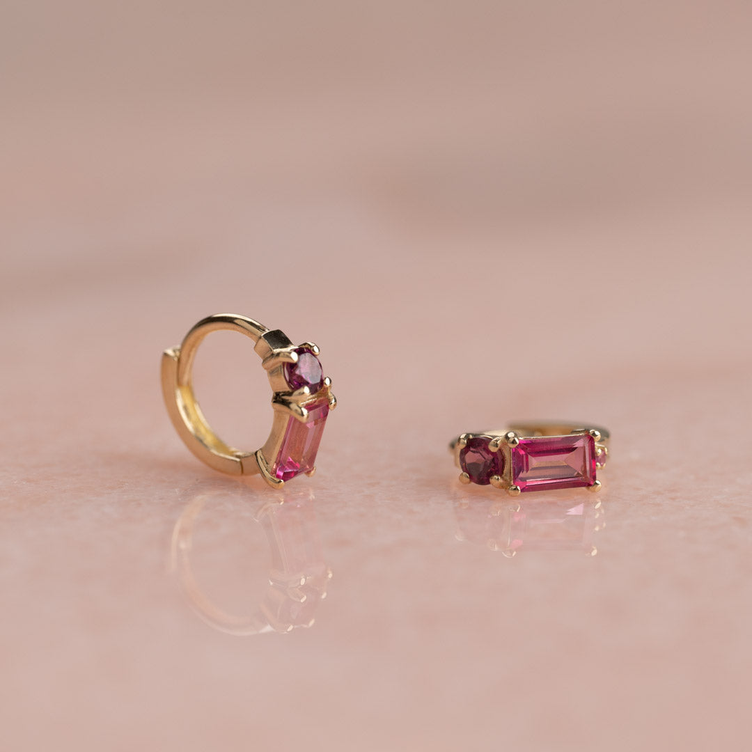 Our Gemina earrings are made of 100% recycled 9 karat solid gold with a baguette-slap pink topaz and round deep red rodolit on each earring. Earrings are made as hinged huggies with click-lock. They have a diameter of 12mm.