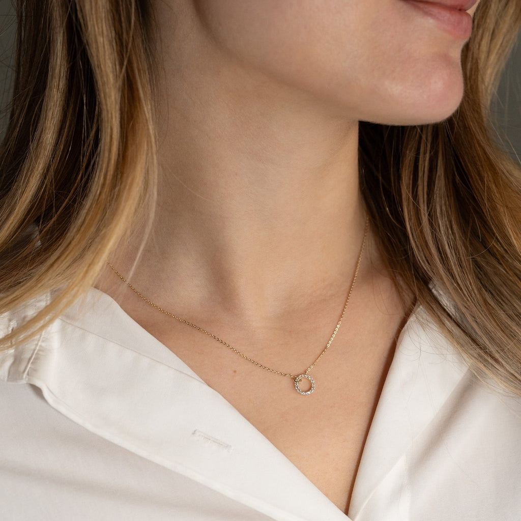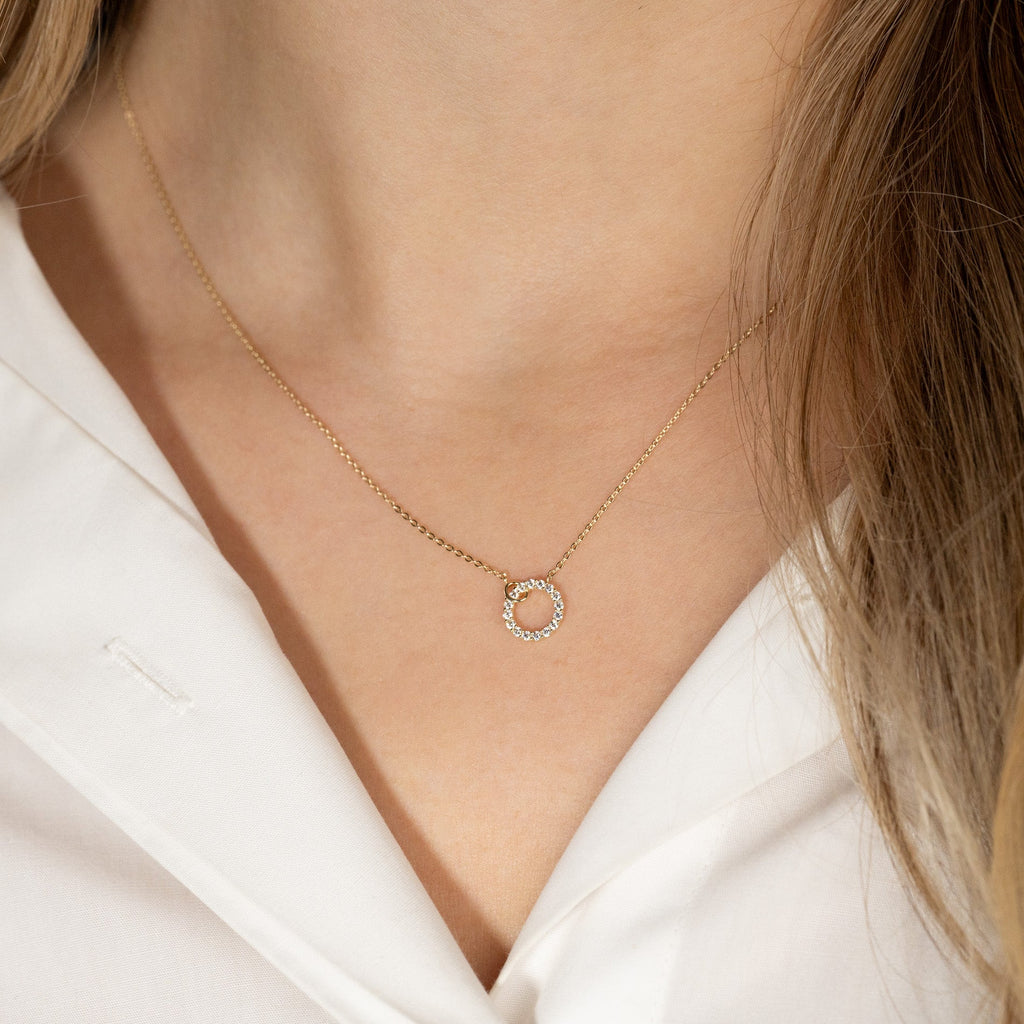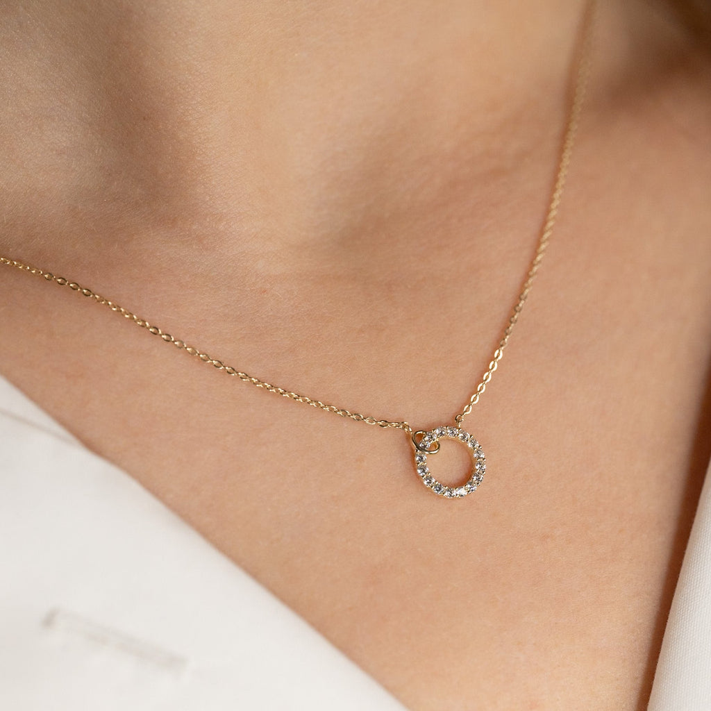 The necklace`s integrated pendant is shaped as an elegant circle studded with white zirconia stones that shine beautifully in the light. This gives a more feminine look.