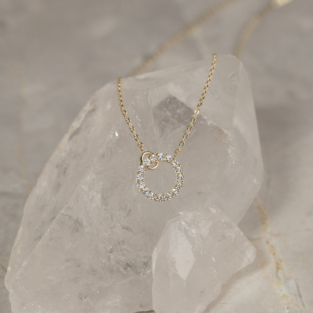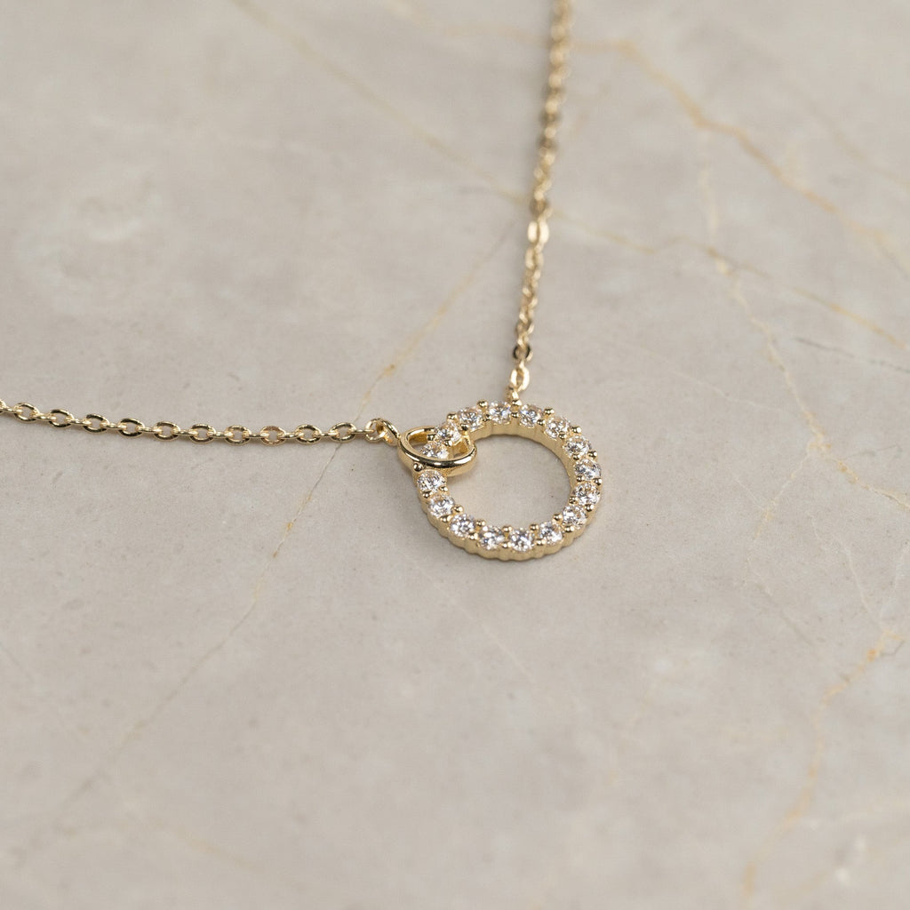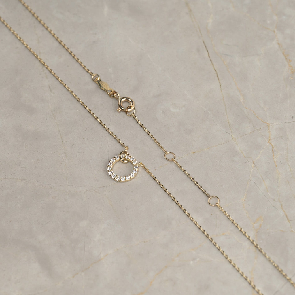 The necklace`s integrated pendant is shaped as an elegant circle studded with white zirconia stones that shine beautifully in the light. This gives a more feminine look.