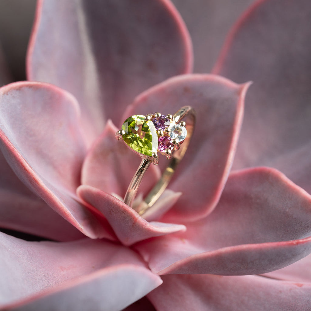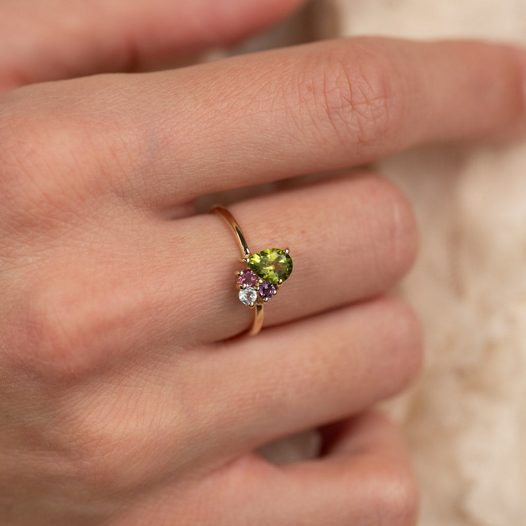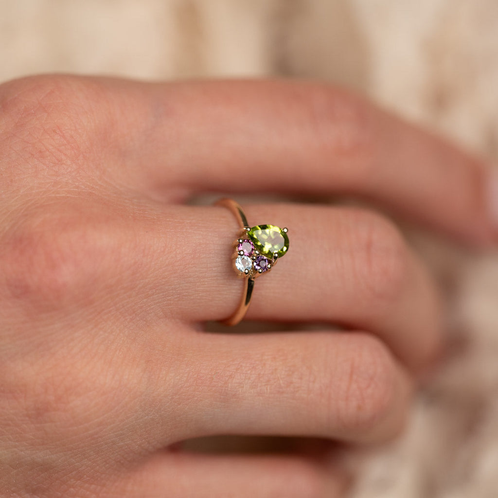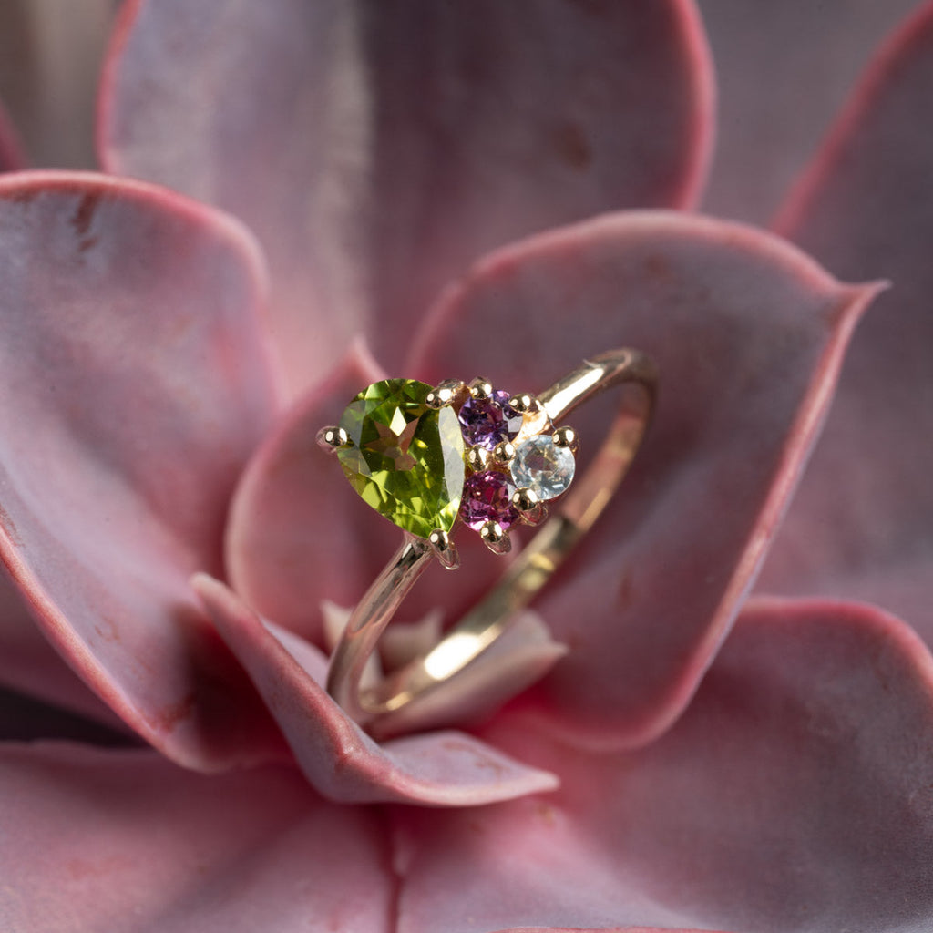 The green peridot is pear-shaped and closely set with the three other stones, giving the ring an incredibly beautiful and unique appearance.