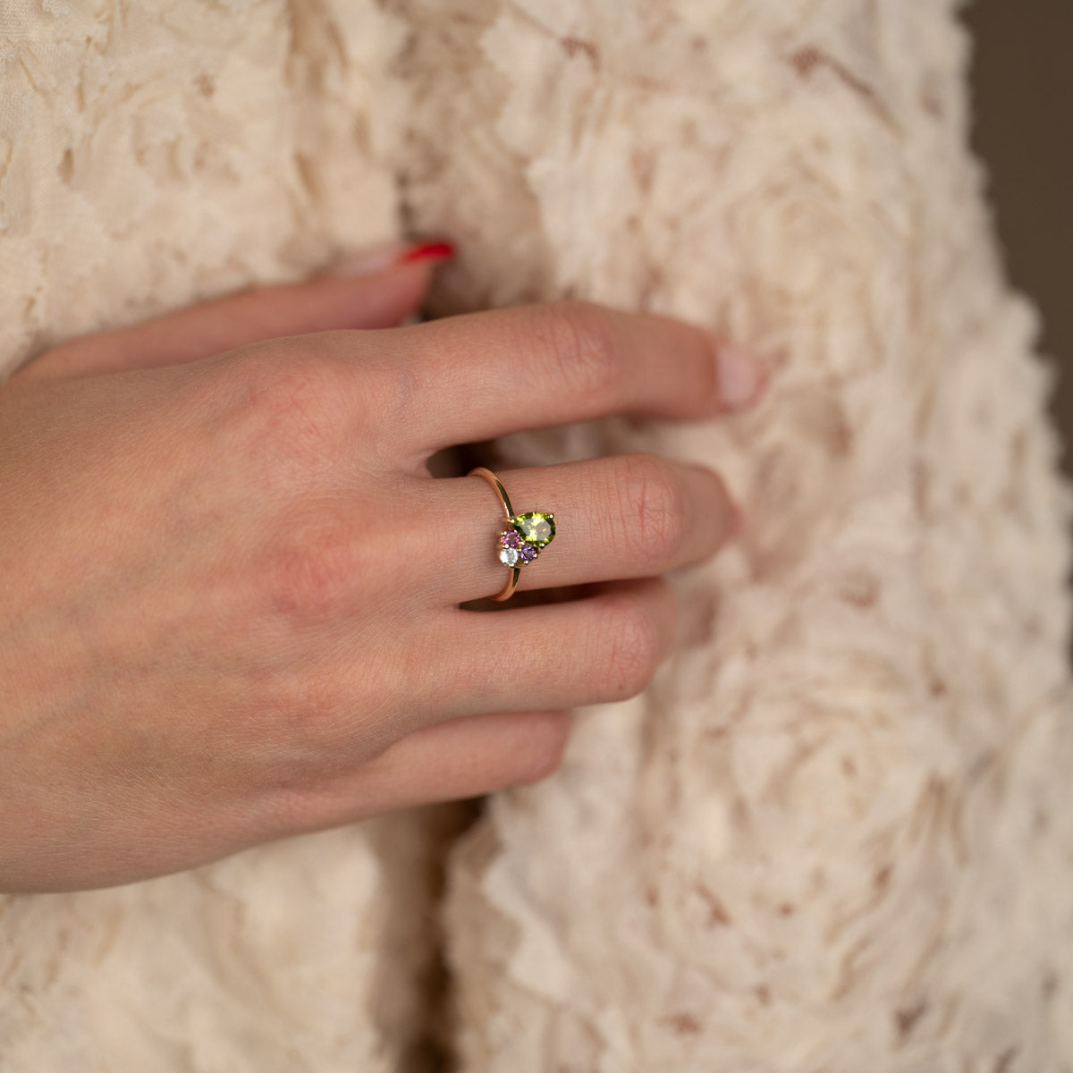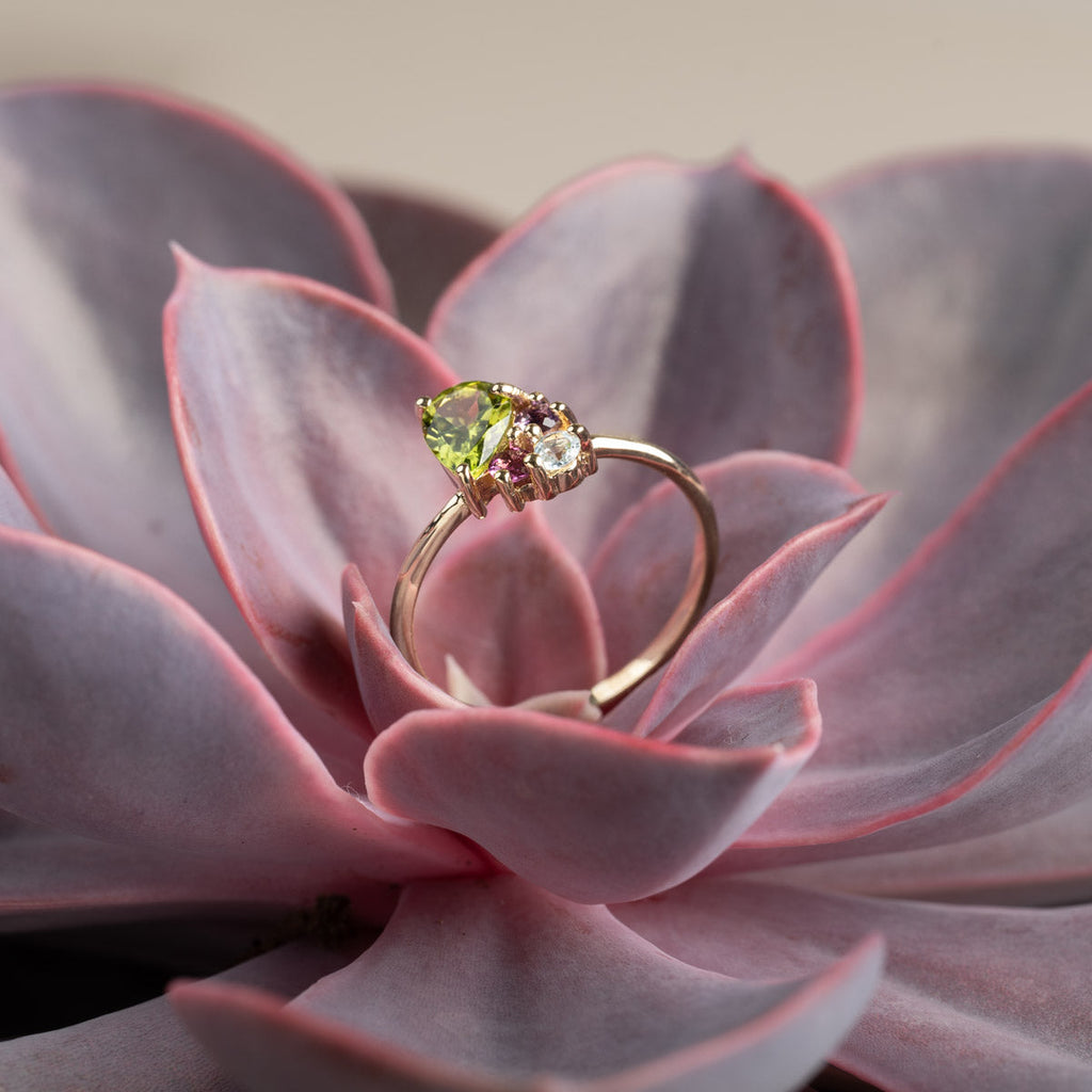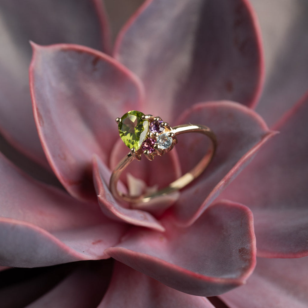 The green peridot is pear-shaped and closely set with the three other stones, giving the ring an incredibly beautiful and unique appearance.