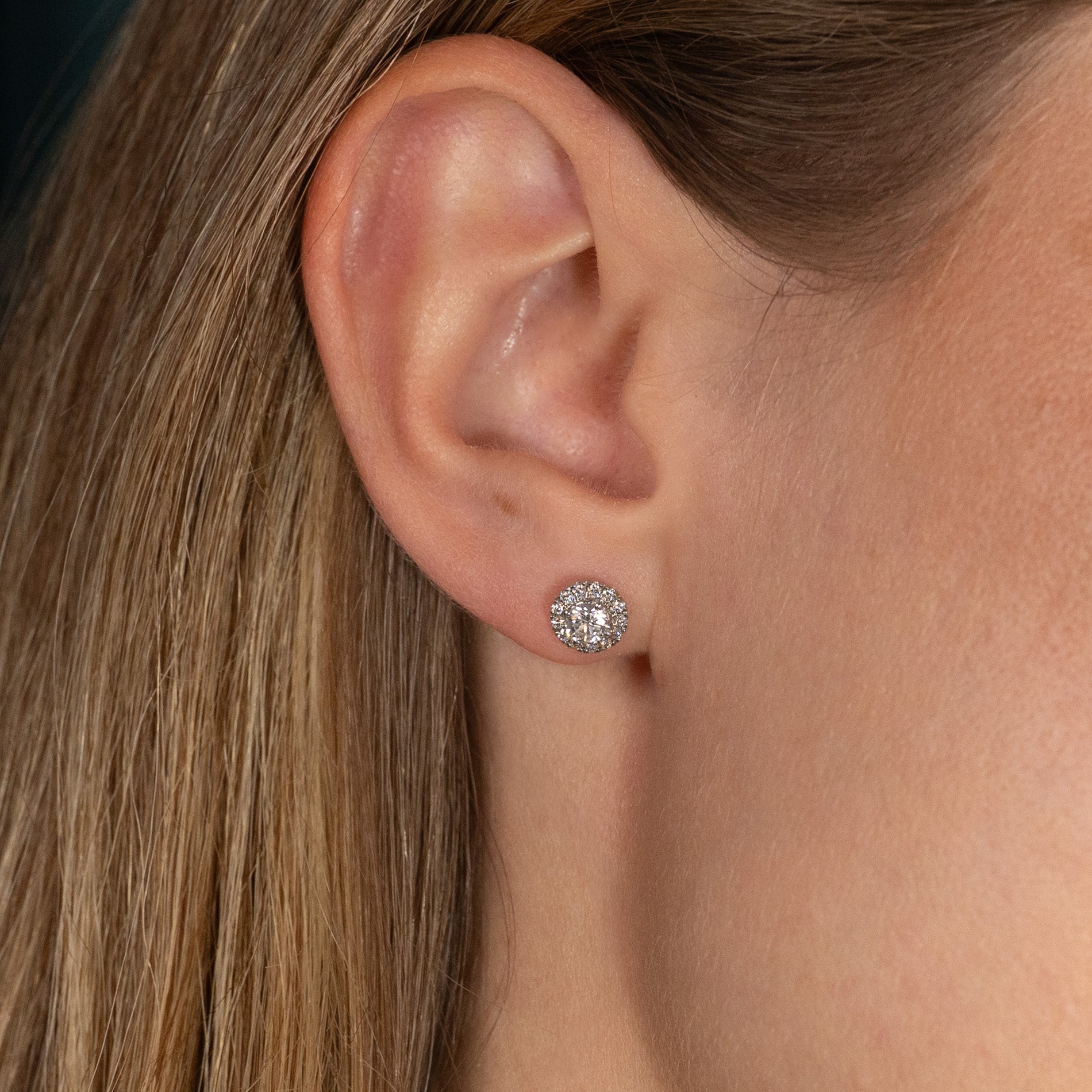 These diamond stud earrings are crafted in 14 karat white gold, with a brilliant-cut lab-grown diamond at the center, surrounded by 12 small brilliant-cut diamonds in a halo. The halo design creates an elegant and feminine piece, giving the earrings a beautiful overall diameter while sitting close to the ear.