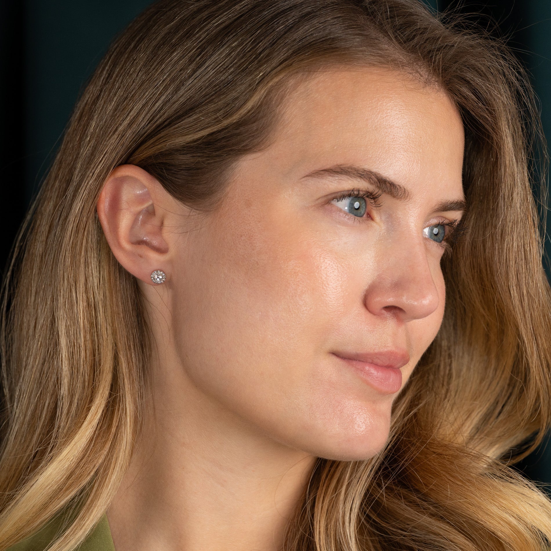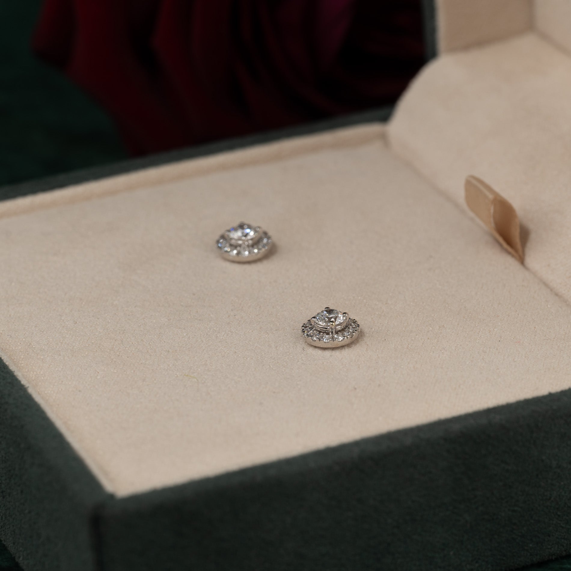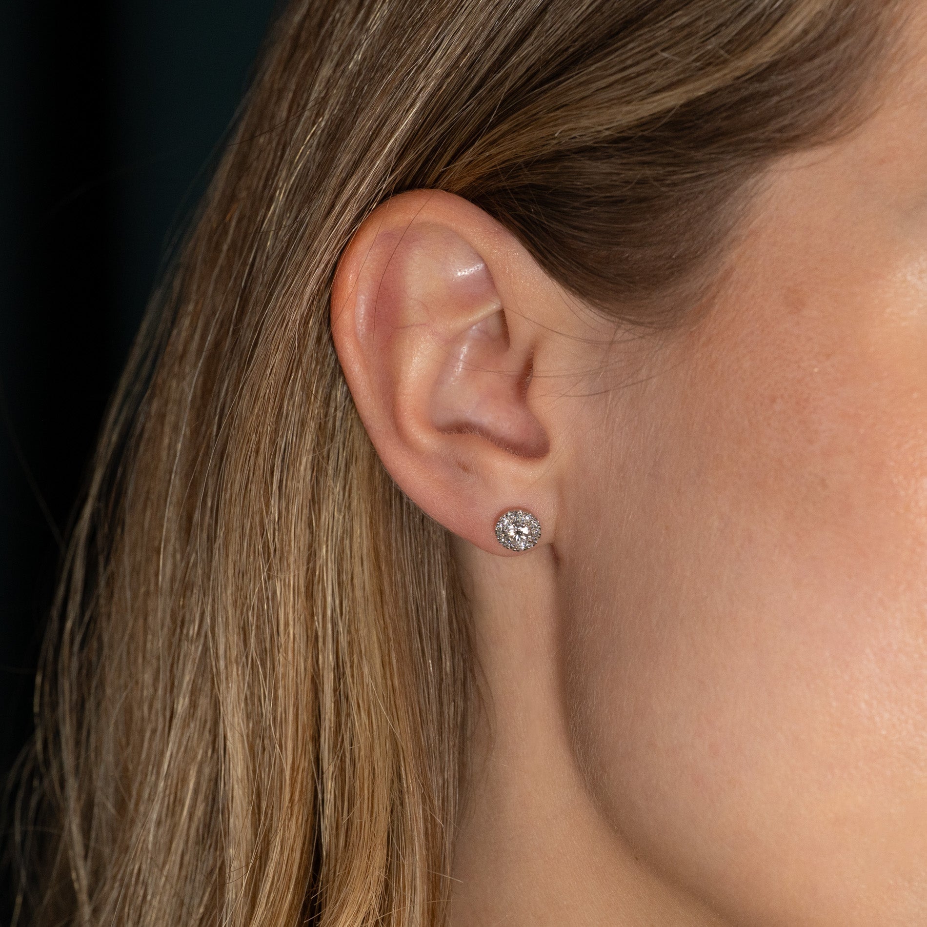 The studs are made of solid 14 karat white gold with lab-grown diamonds, totaling approximately 0.65ct. Each center stone weighs 0.22ct. and is surrounded by small diamonds totaling 0.08ct. – in total, the pair consists of 26 diamonds. The diamonds are graded E-F (River) for color and VVS for clarity. The jewelry is created with care; the diamonds are made using, among other things, solar energy, and the gold is 100% certified recycled.