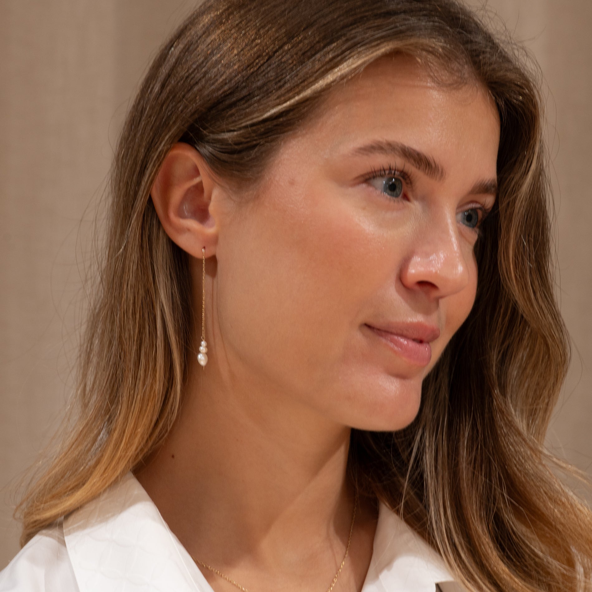 These stunning drop earrings have a classic and timeless look, with a delicate gold chain that slides easily through the ear and three beautiful pearls at the end.