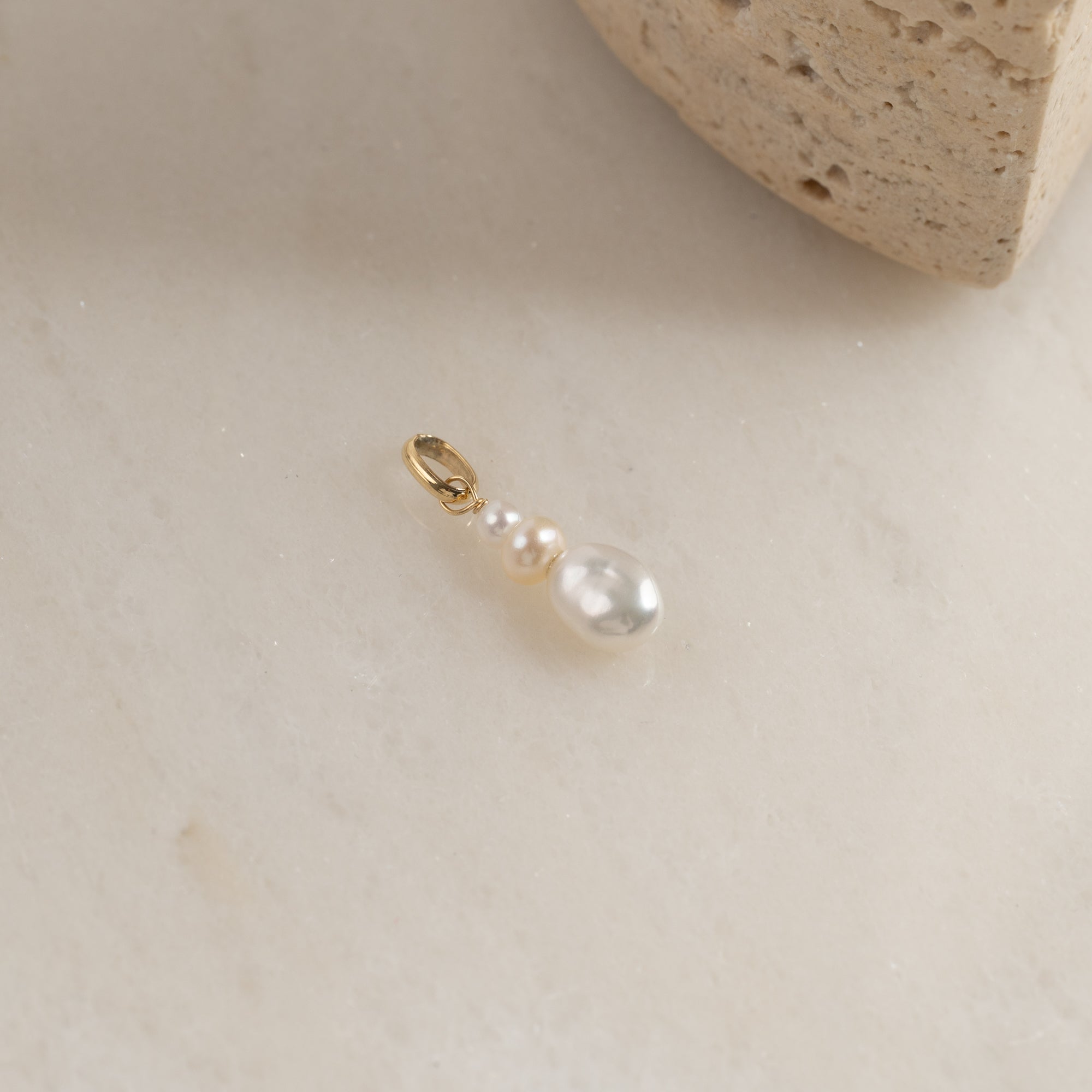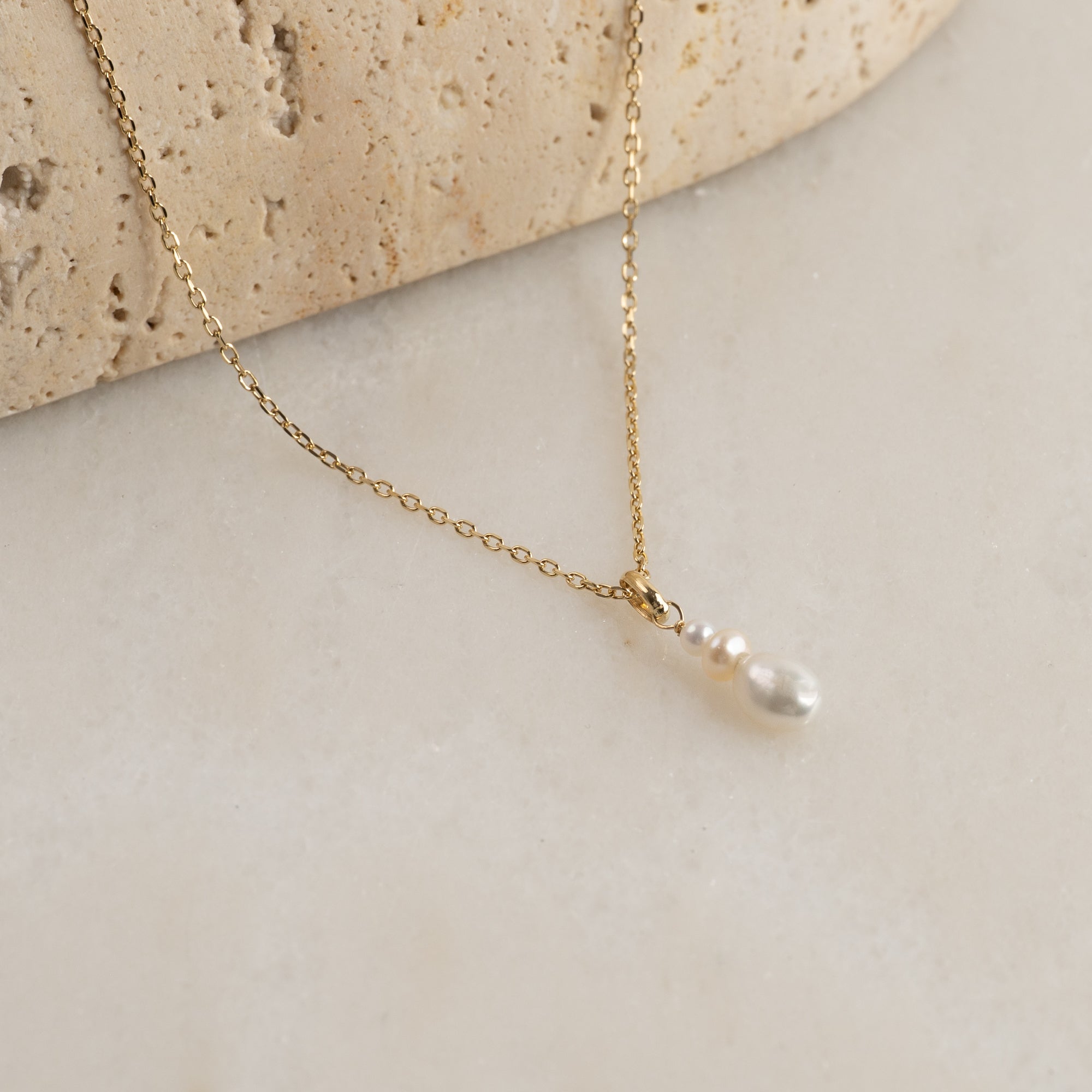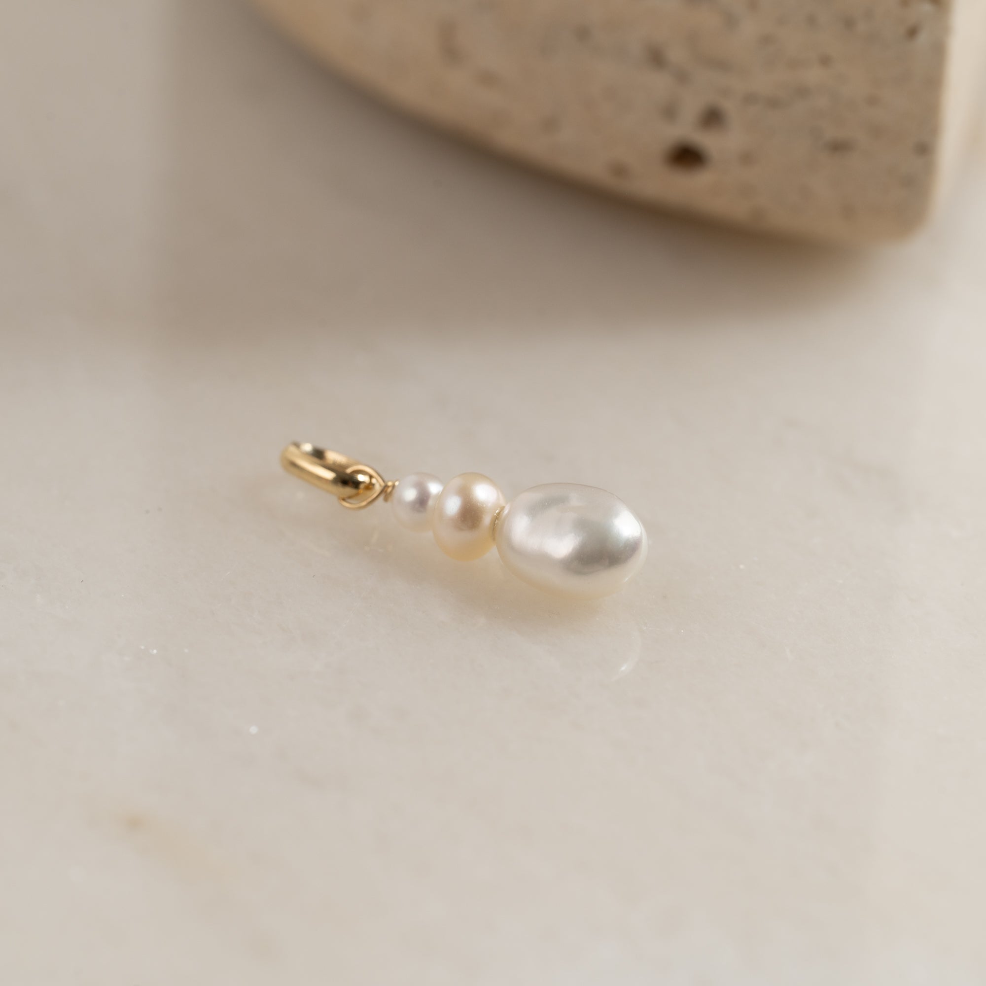 The pendant is made from 100% recycled solid 9-karat gold with three freshwater pearls.