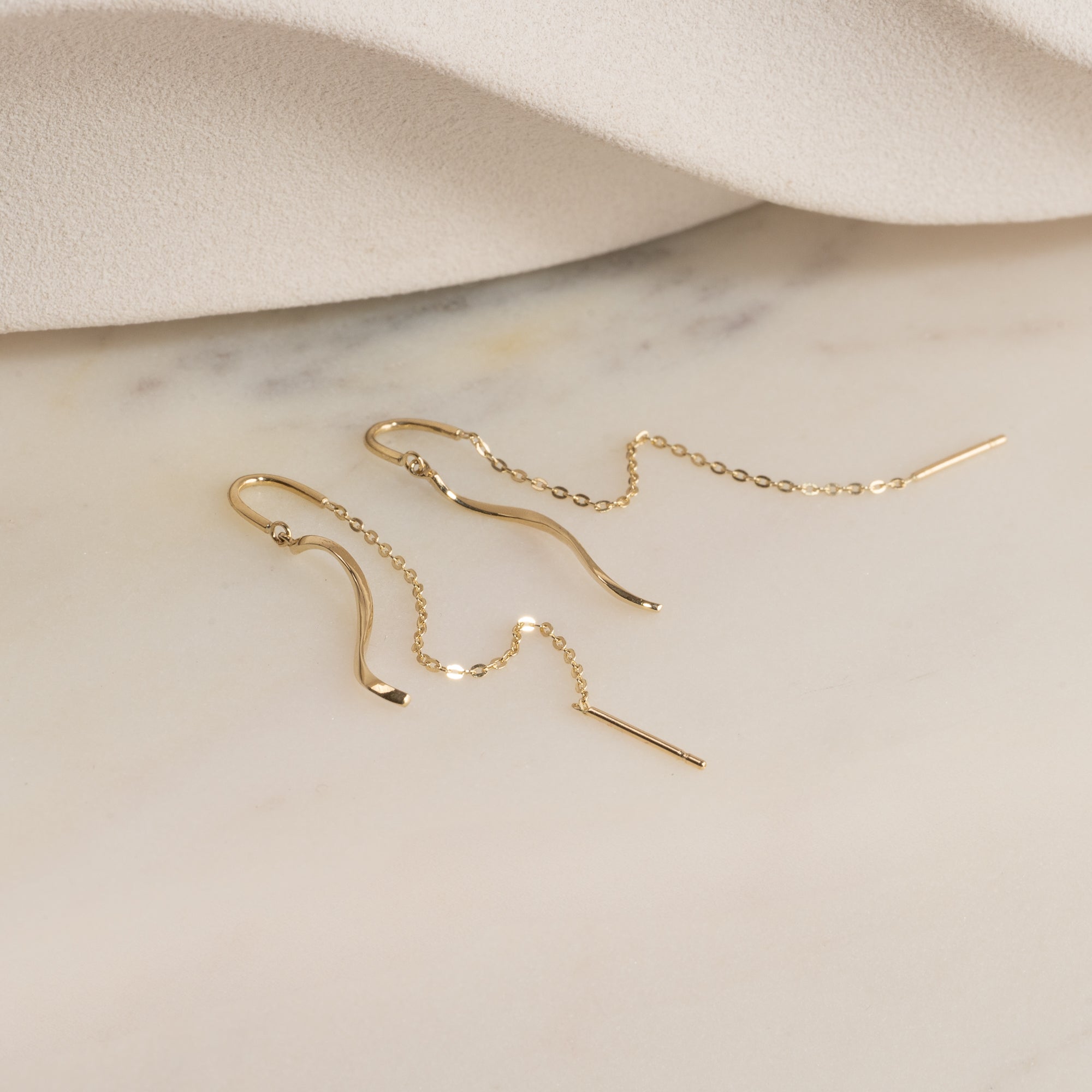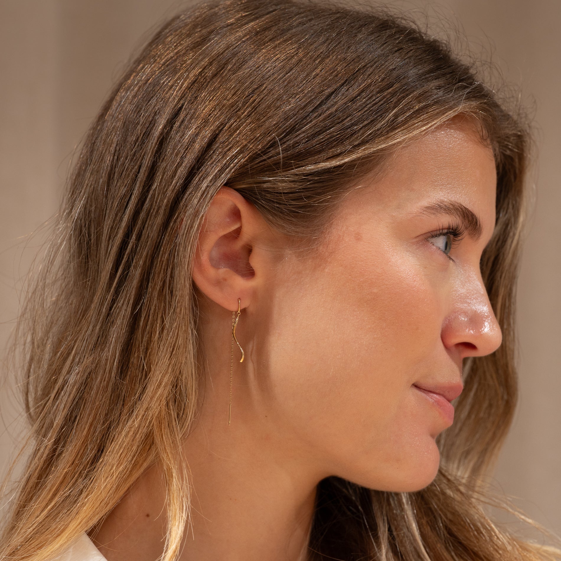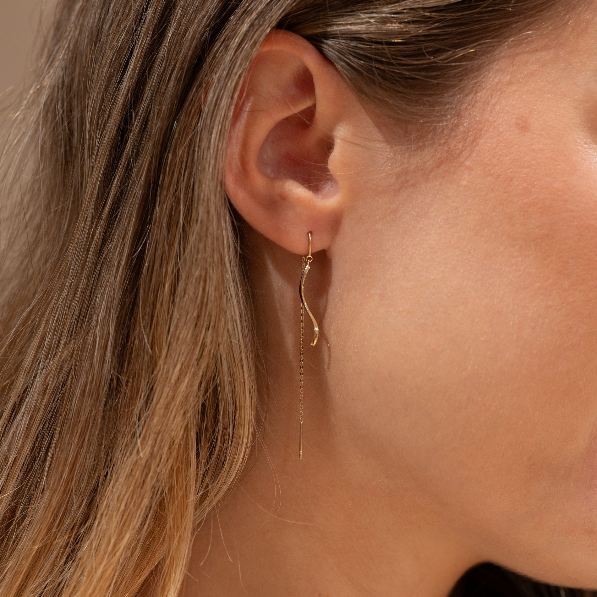They are designed with a delicate chain that easily slides through the ear. At the front is a twisted pendant, while the chain falls elegantly at the back, giving the earrings a light and organic look.