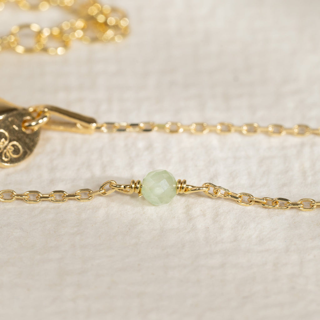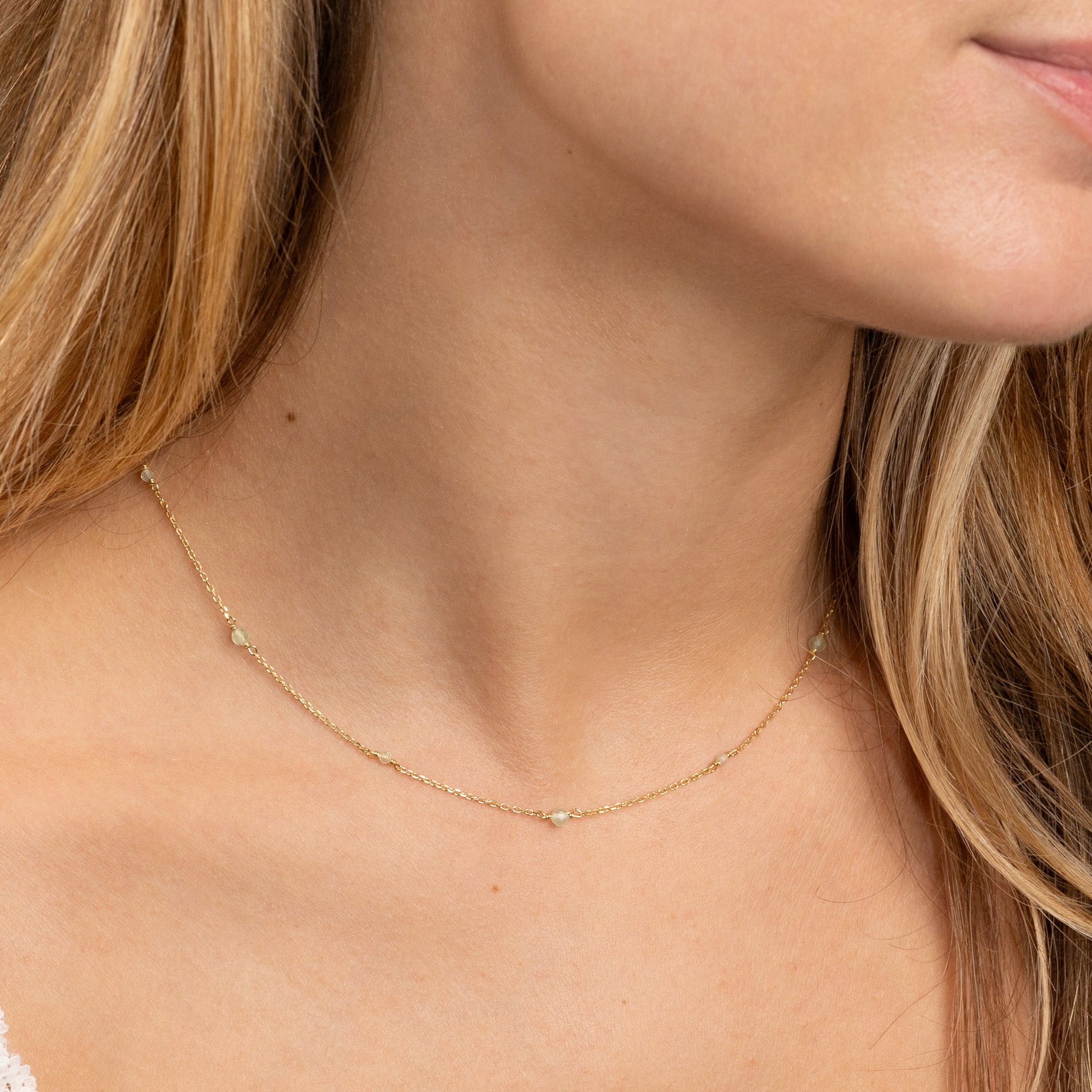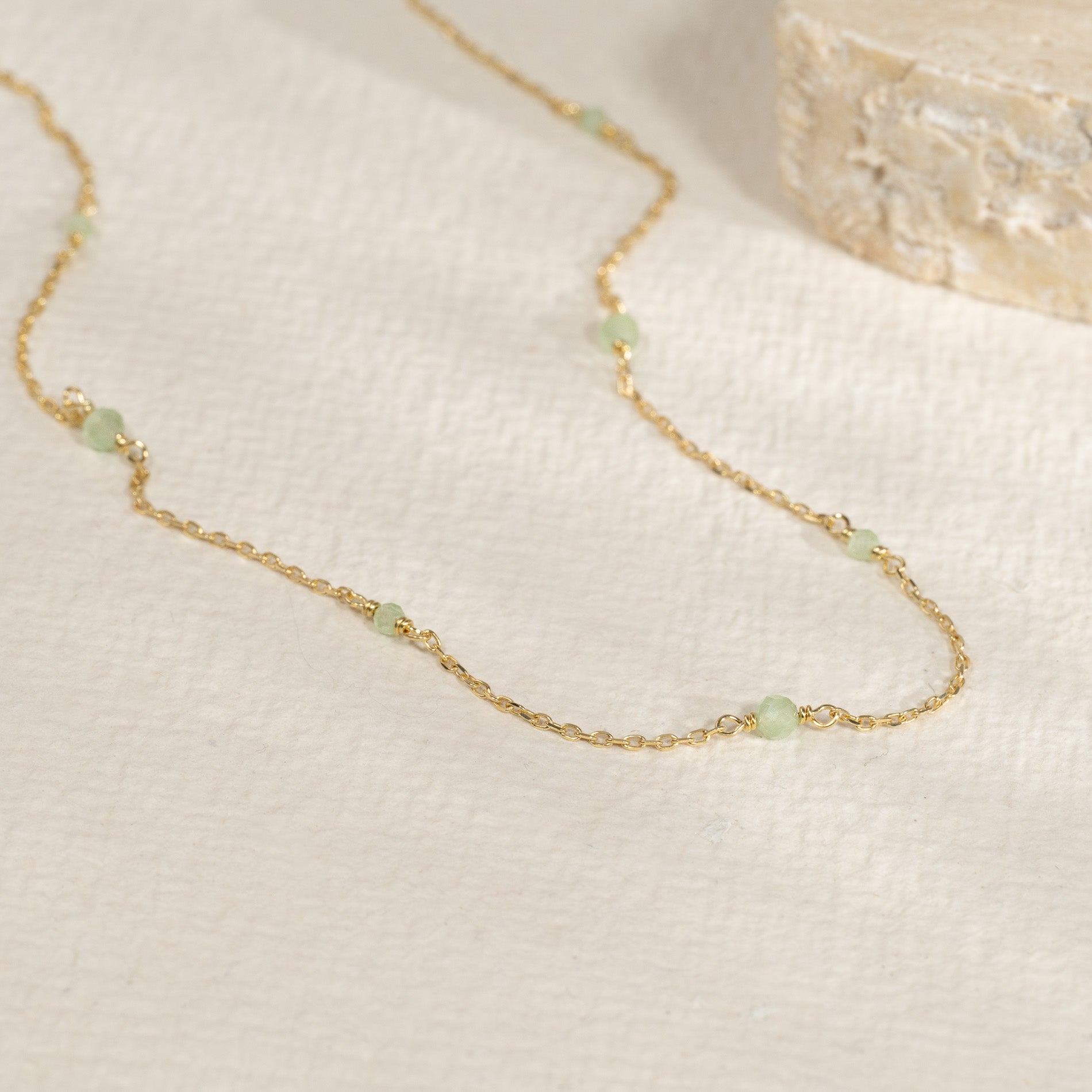 A light and beautiful necklace with small green stones evenly distributed along the chain. The stones add a subtle play of color, giving the necklace a feminine and elegant look.