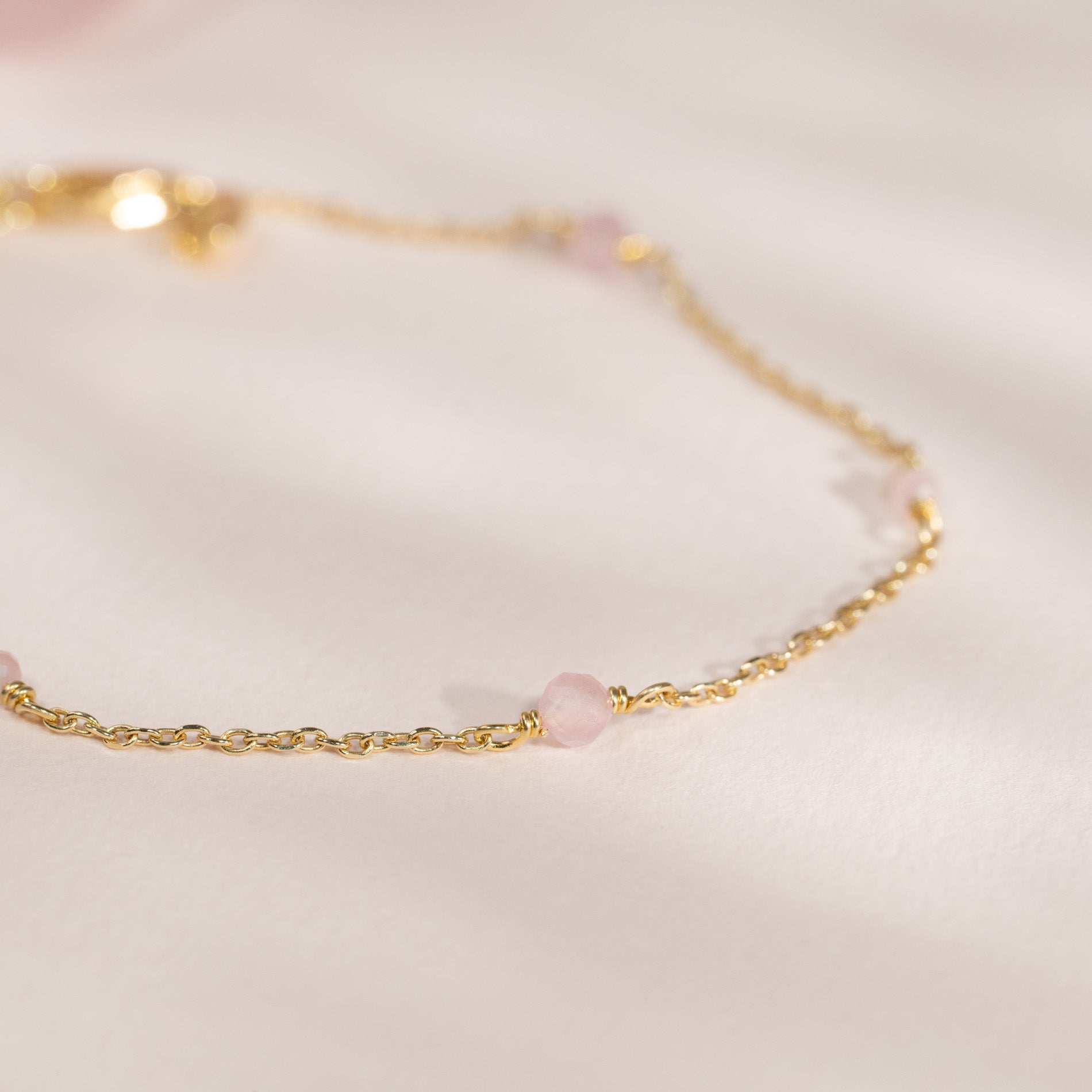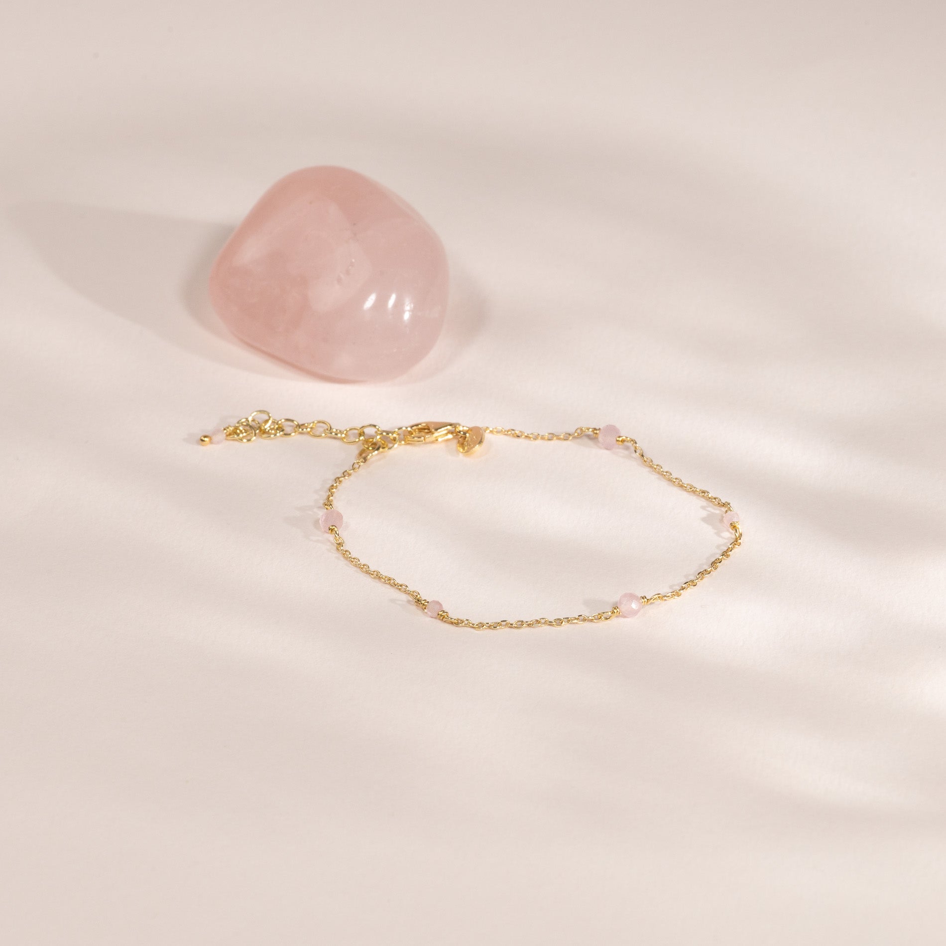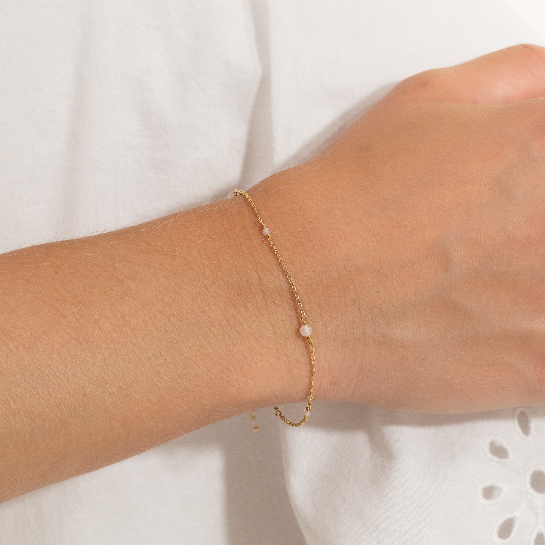 A light and elegant bracelet with small pink stones evenly distributed along a delicate chain. The stones add a subtle play of color, giving the bracelet a feminine and elegant look.