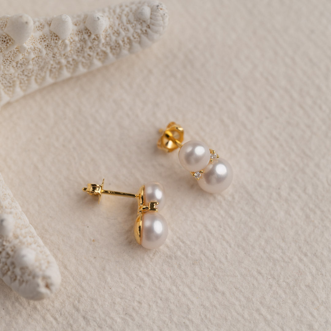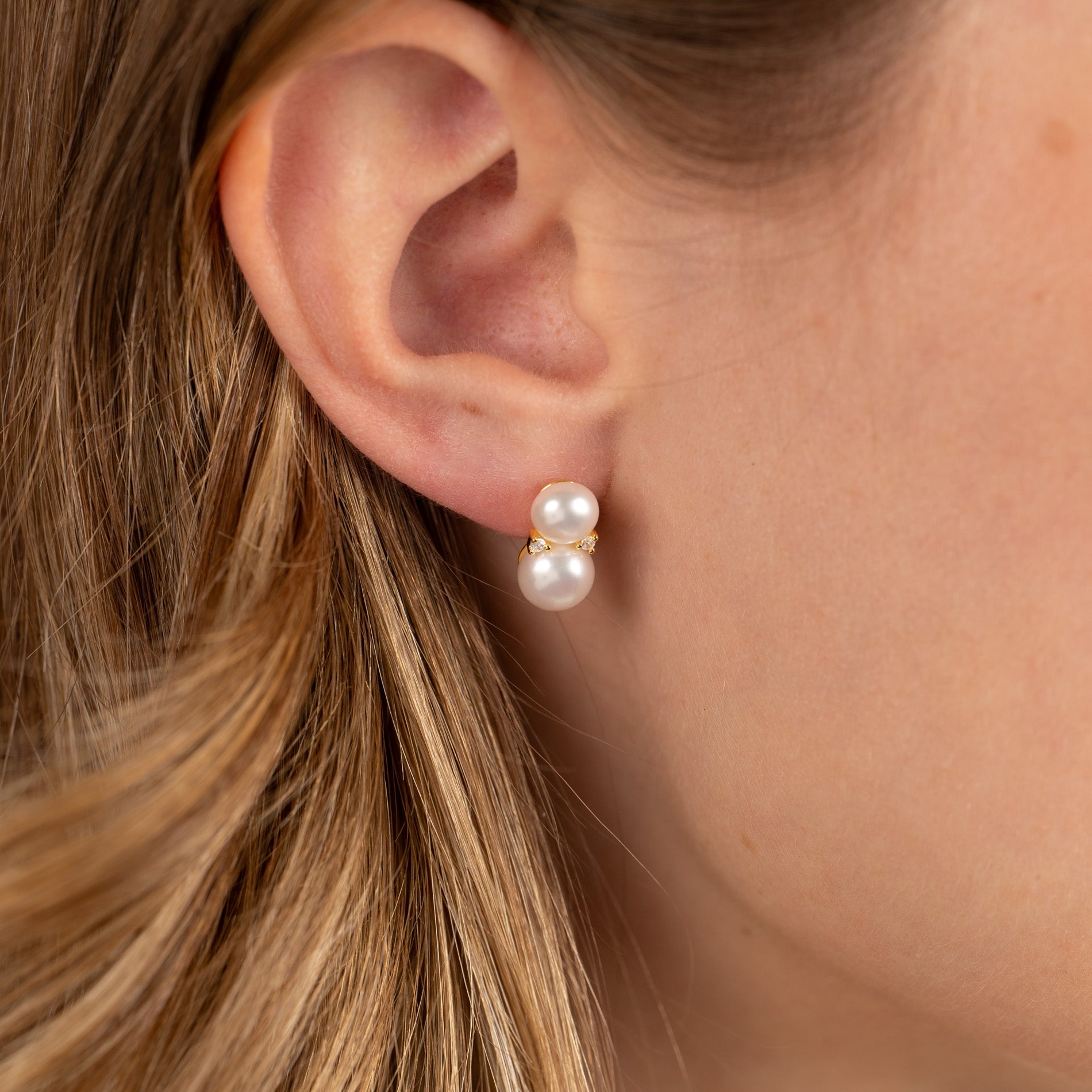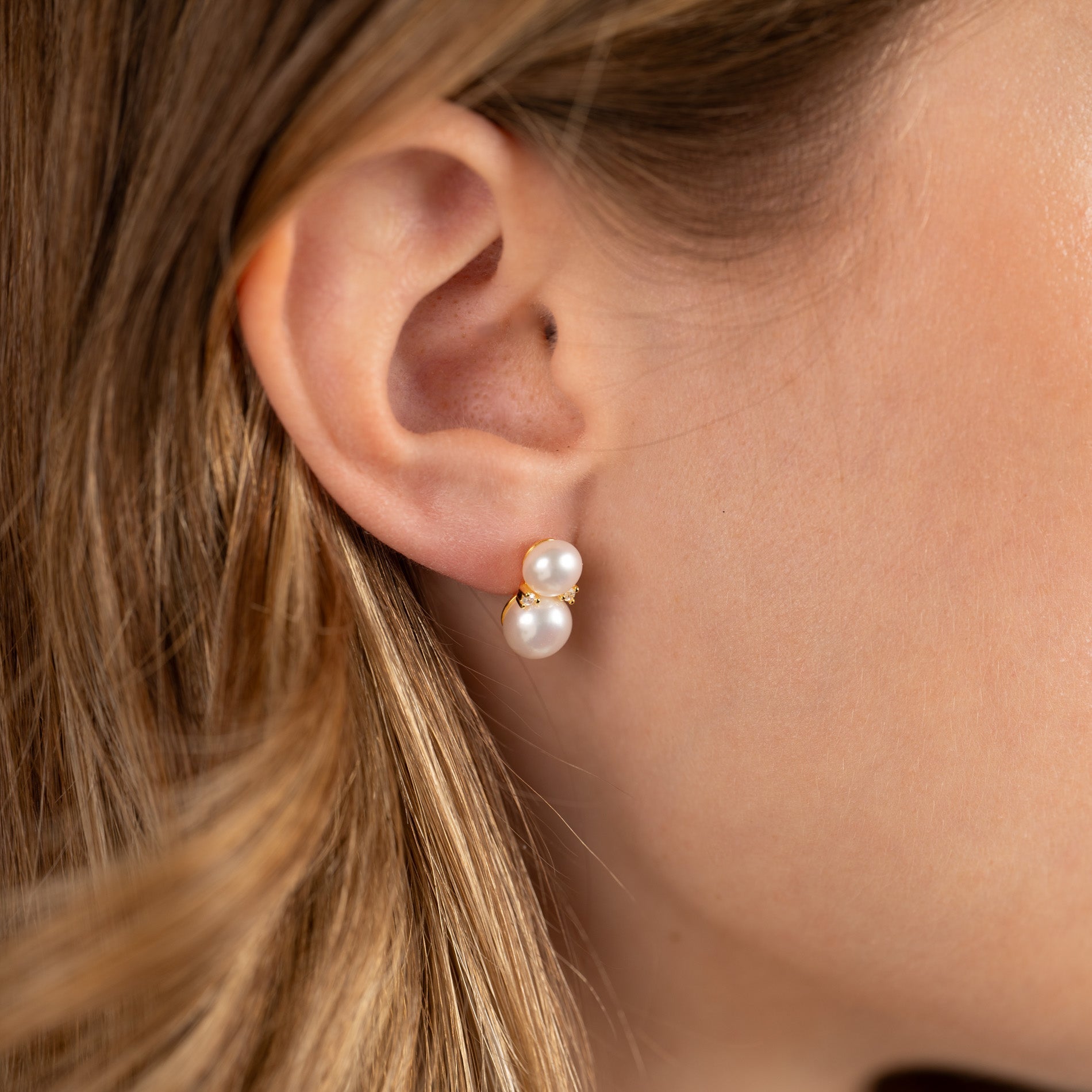 Earrings in 100% recycled 18 karat gilded 925 sterling silver. The earring features a small freshwater pearl measuring approximately 6-6.5 mm, as well as a larger freshwater pearl measuring about 7.5-8 mm. In addition, there are two small zirconias placed between the pearls.