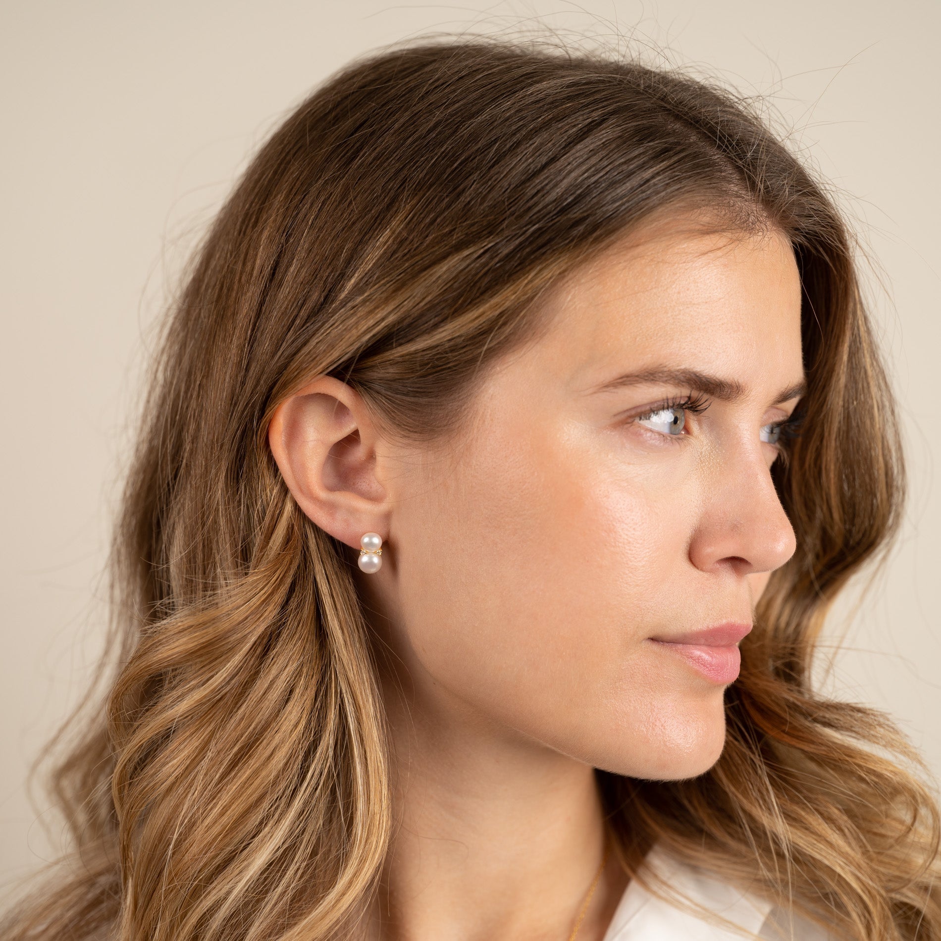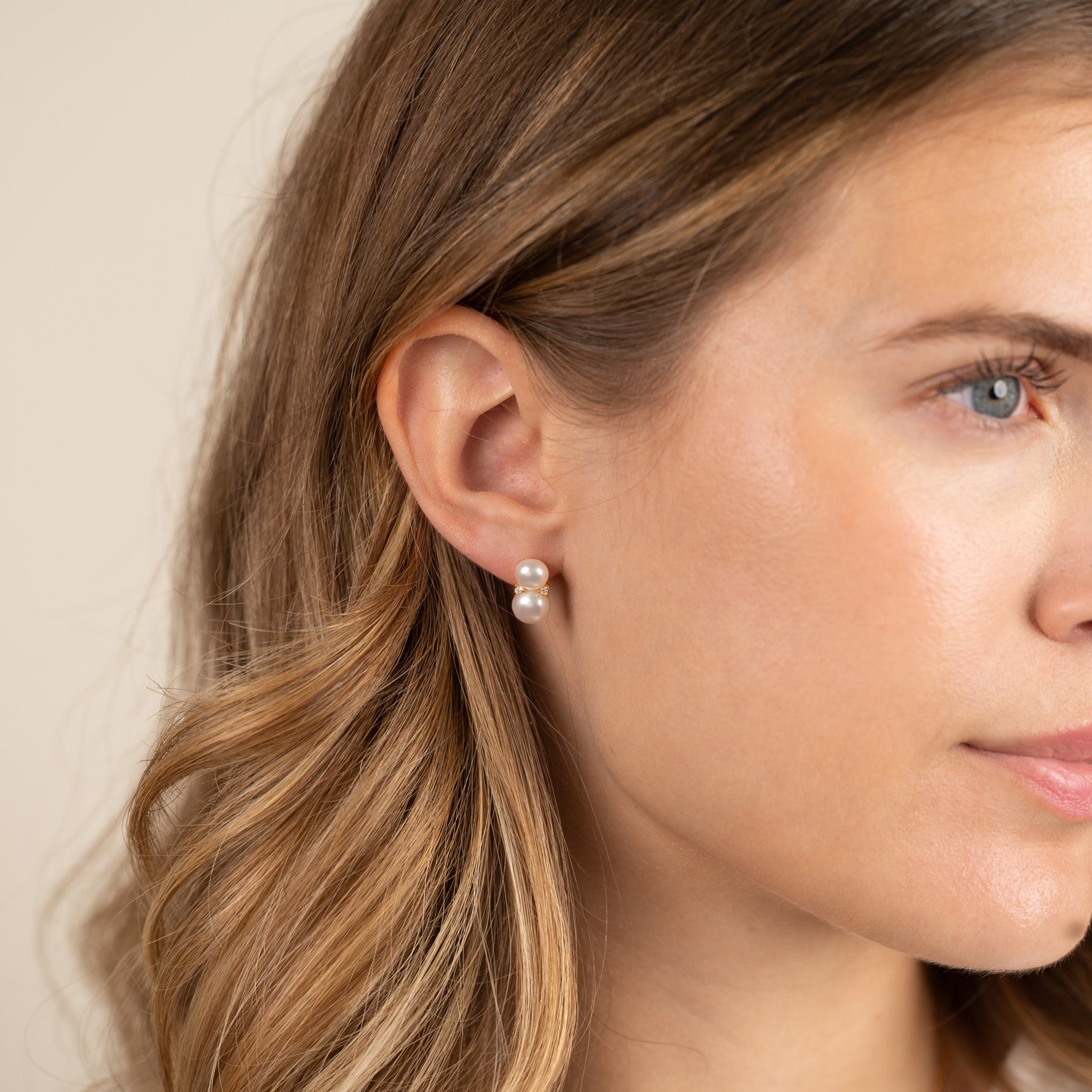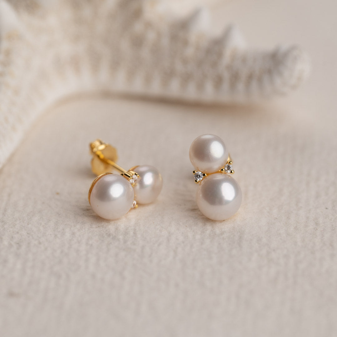Earrings in 100% recycled 18 karat gilded 925 sterling silver. The earring features a small freshwater pearl measuring approximately 6-6.5 mm, as well as a larger freshwater pearl measuring about 7.5-8 mm. In addition, there are two small zirconias placed between the pearls.