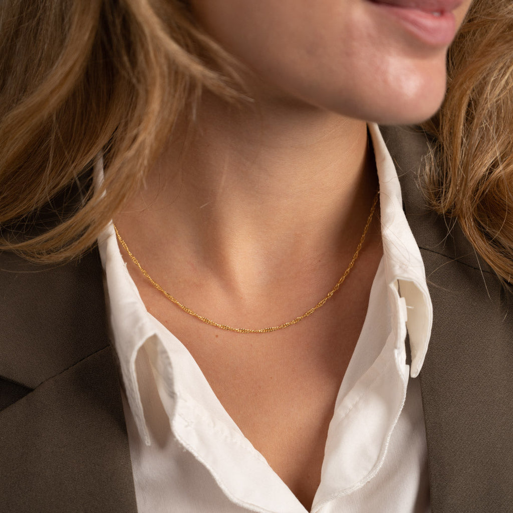 The Leonora jewelry is designed with an elegant and feminine expression. The twisted chains give the jewelry an understated organic expression that goes extremely well with the otherwise simplistic design. An elegant and timeless set that you can wear forever!