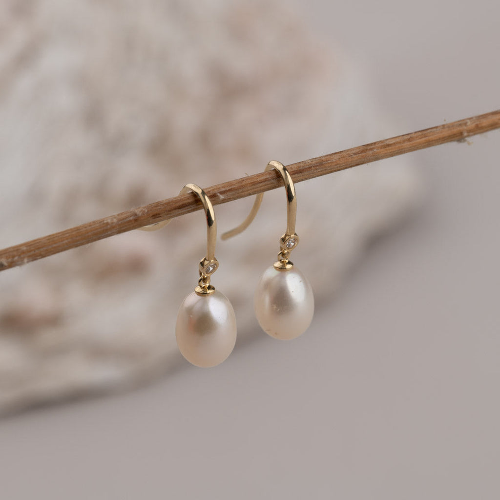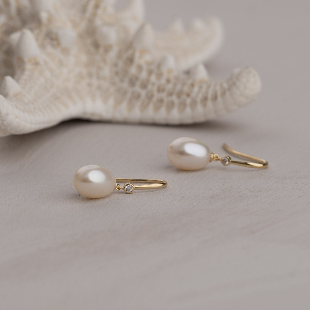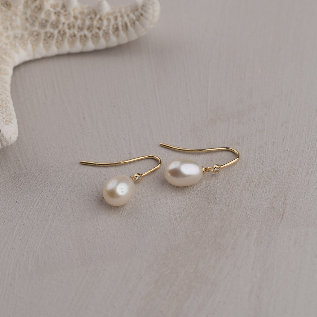 Our Lilibet earrings are made of 100% recycled solid 9 karat gold with white freshwater pearls and small zirconia. The earrings are designed as ear hooks with a small zirconia, from which a pearl pendant hangs. The beautiful white pear-shaped freshwater pearl measures approximately 7mm in diameter, and the total height of the earring is 20mm.