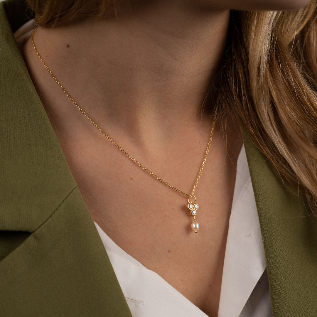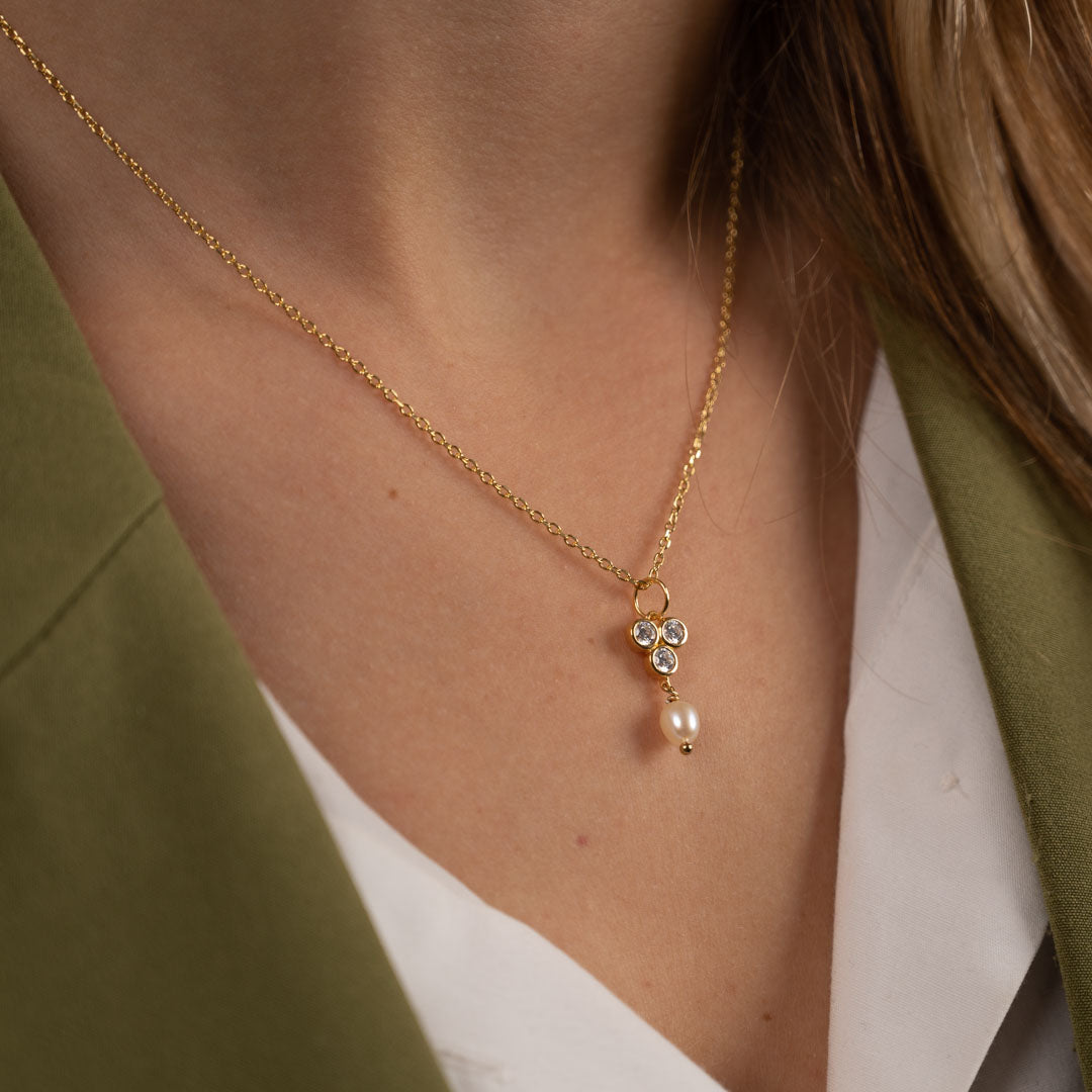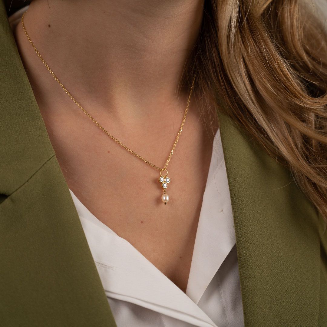 Our Louise pendant is made of 100% recycled 18-carat gold-plated sterling silver, with three zircons and a white freshwater pearl. The pendant carries three zircons in a triangular shape, from which the pearl hangs. The pendant is classy and elegant and a great match to other jewelry with zircons or pearls.