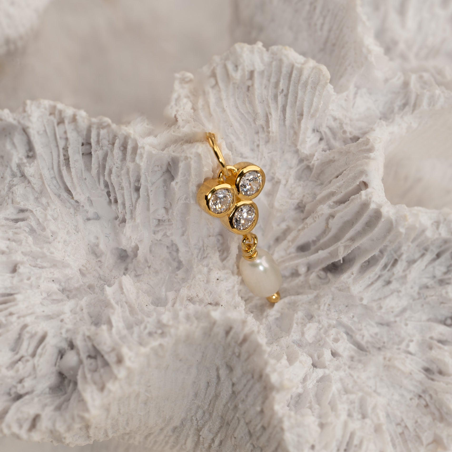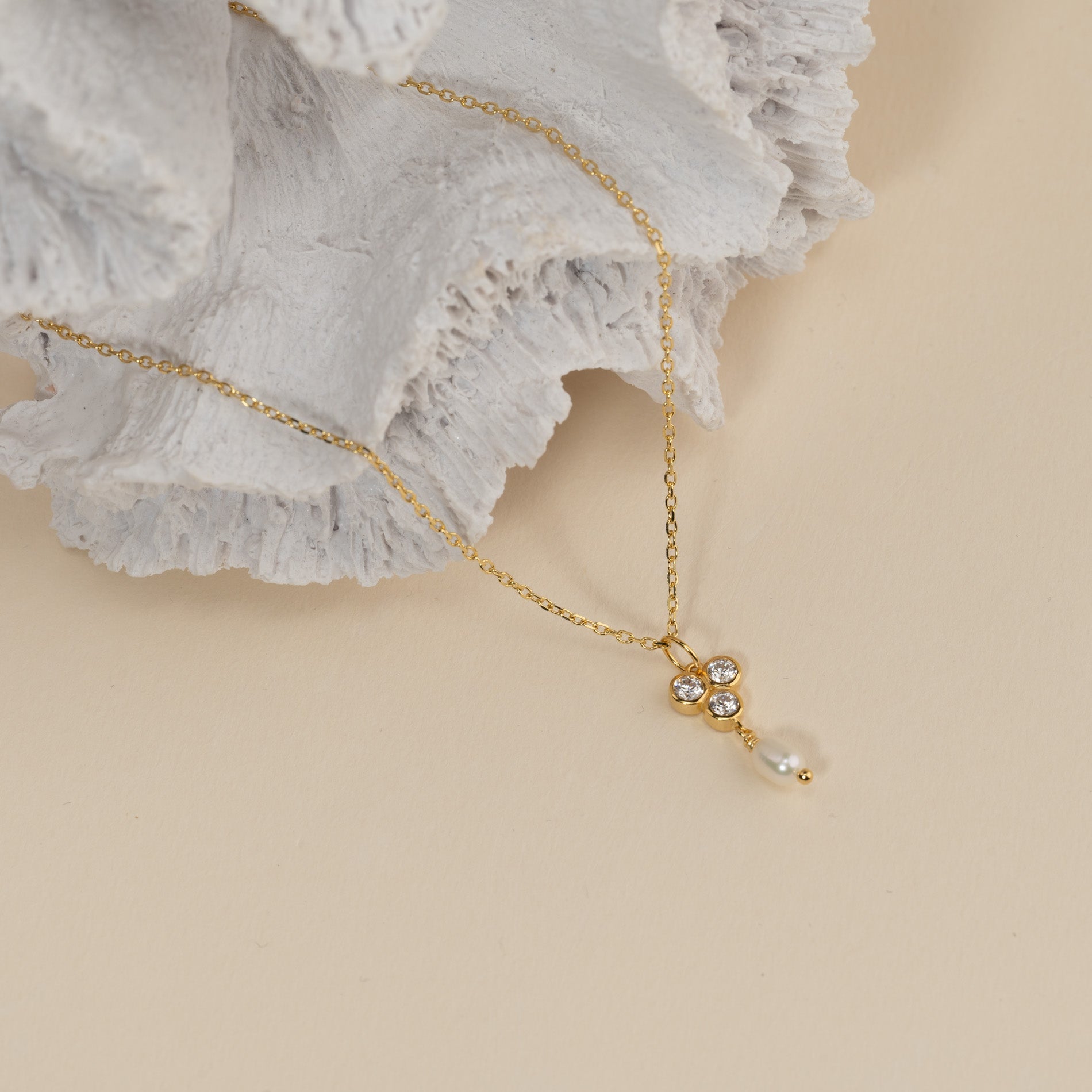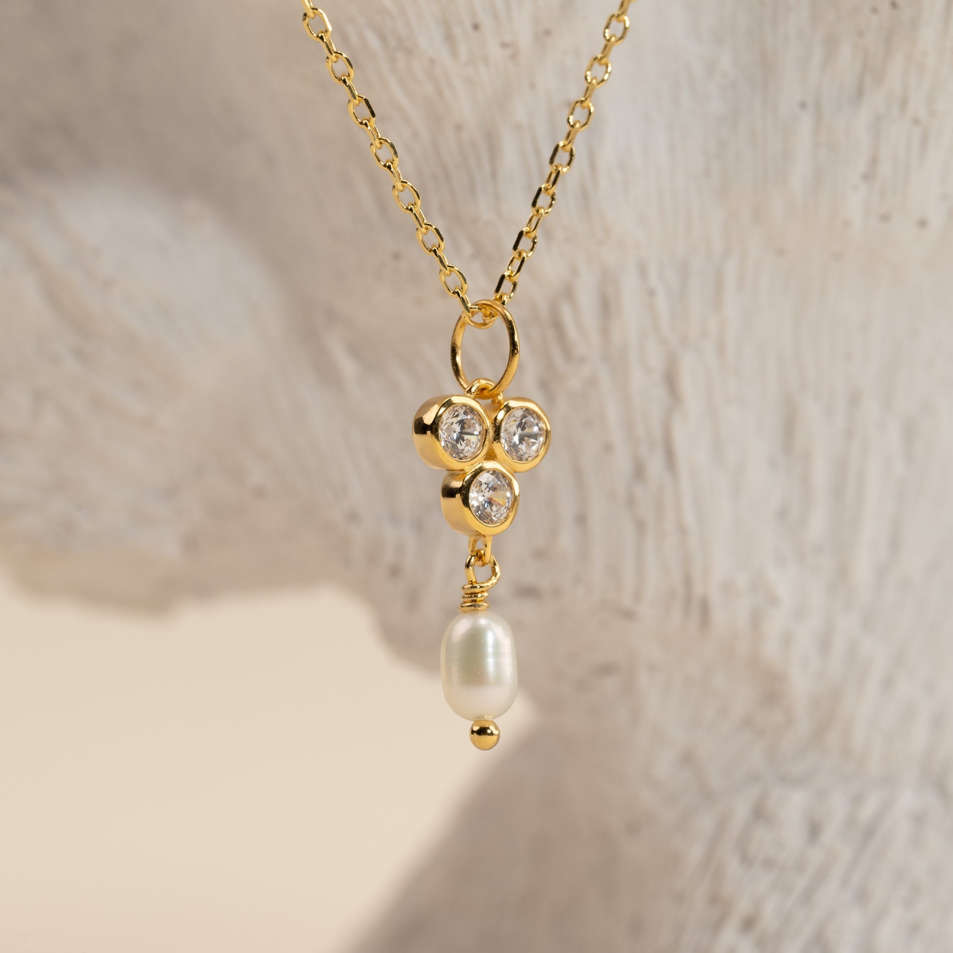 Our Louise pendant is made of 100% recycled 18-carat gold-plated sterling silver, with three zircons and a white freshwater pearl. The pendant carries three zircons in a triangular shape, from which the pearl hangs. The pendant is classy and elegant and a great match to other jewelry with zircons or pearls.