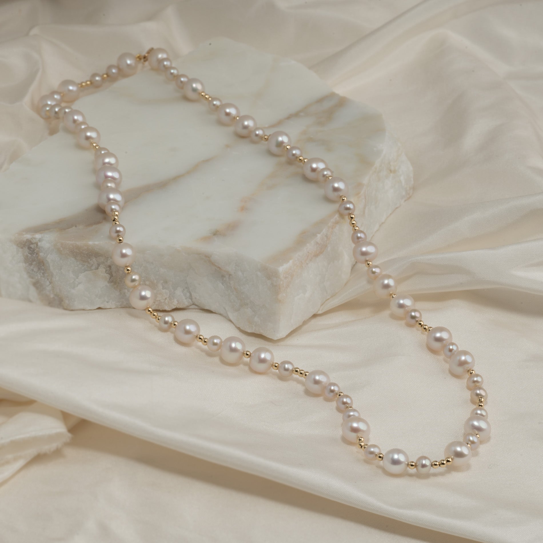 The necklace is made from 100% recycled solid 9-karat gold. This necklace is a beautiful and timeless pearl necklace designed with small fine freshwater pearls in varying sizes and small gold beads.