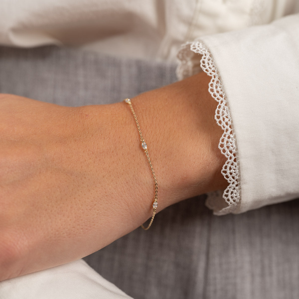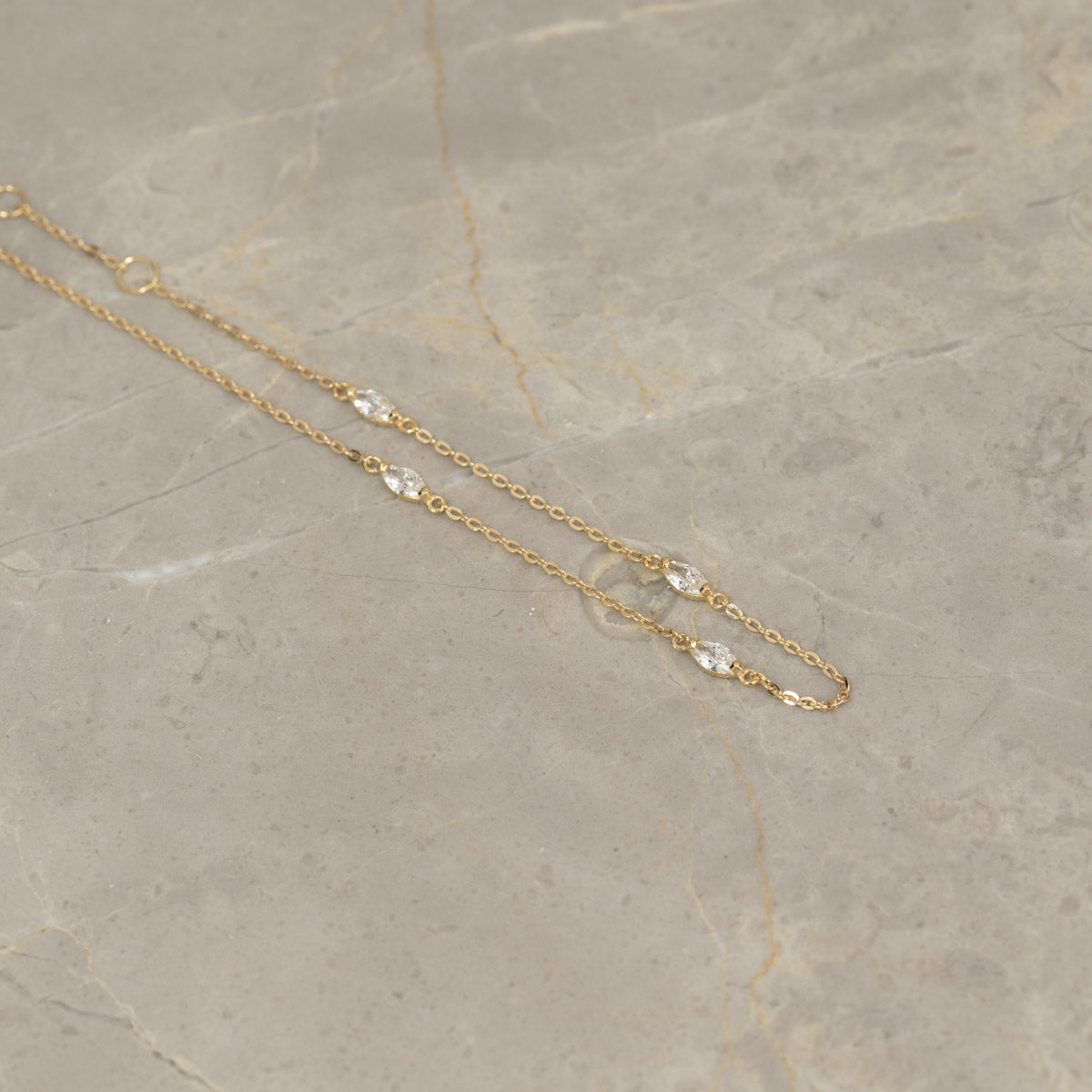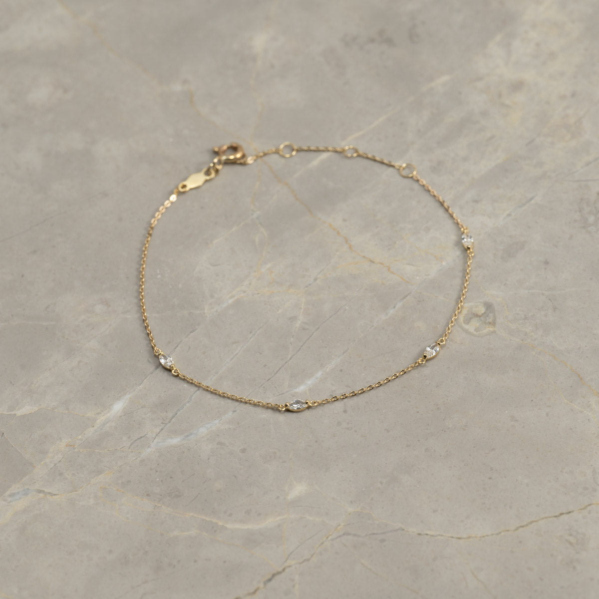 The Madeline bracelet is made of 100% recycled solid 9-karat gold with four beautiful marquise-cut white cubic zirconia stones.