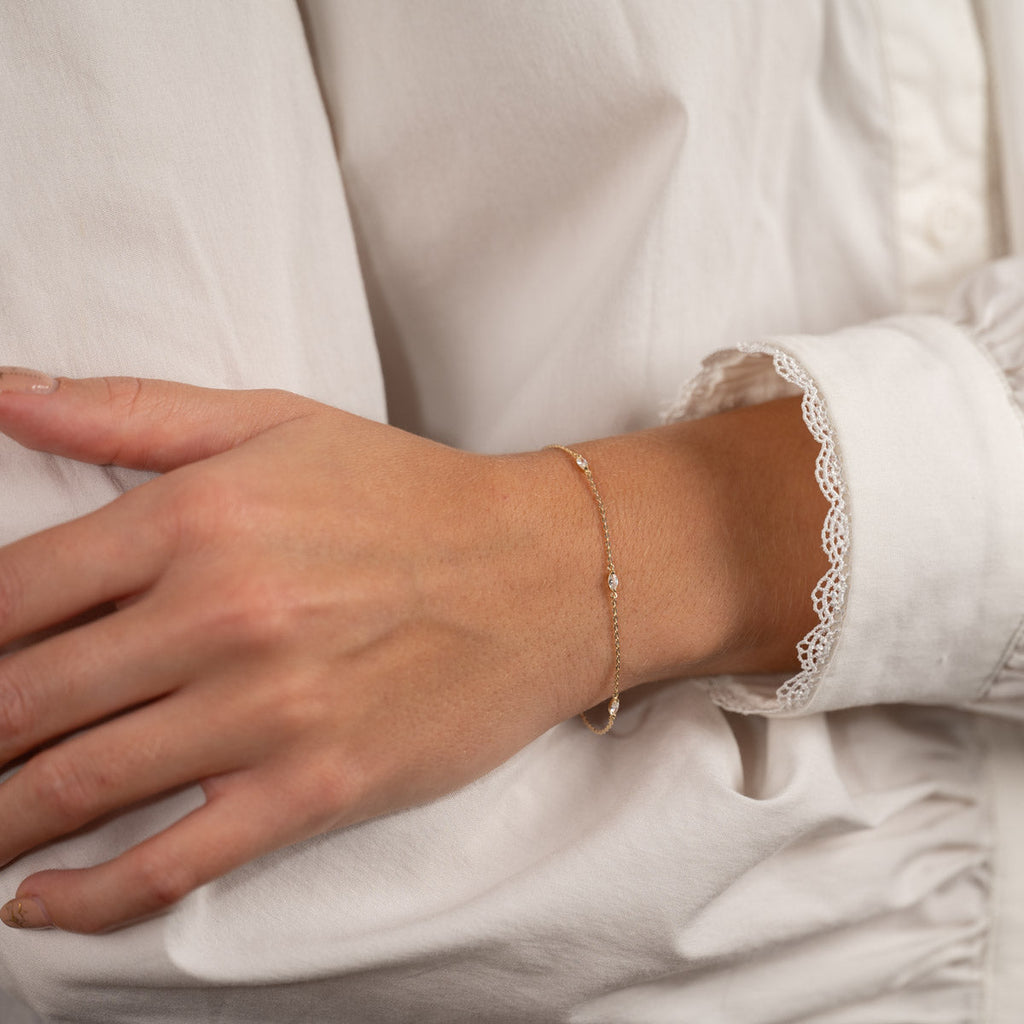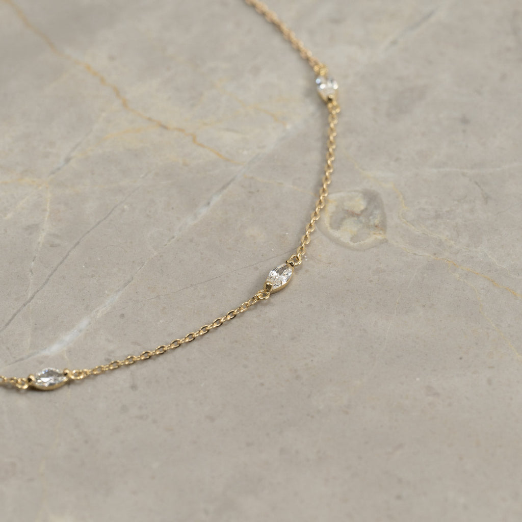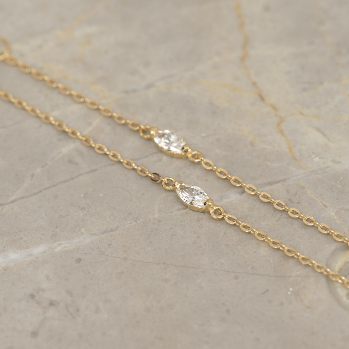 The Madeline bracelet is made of 100% recycled solid 9-karat gold with four beautiful marquise-cut white cubic zirconia stones.