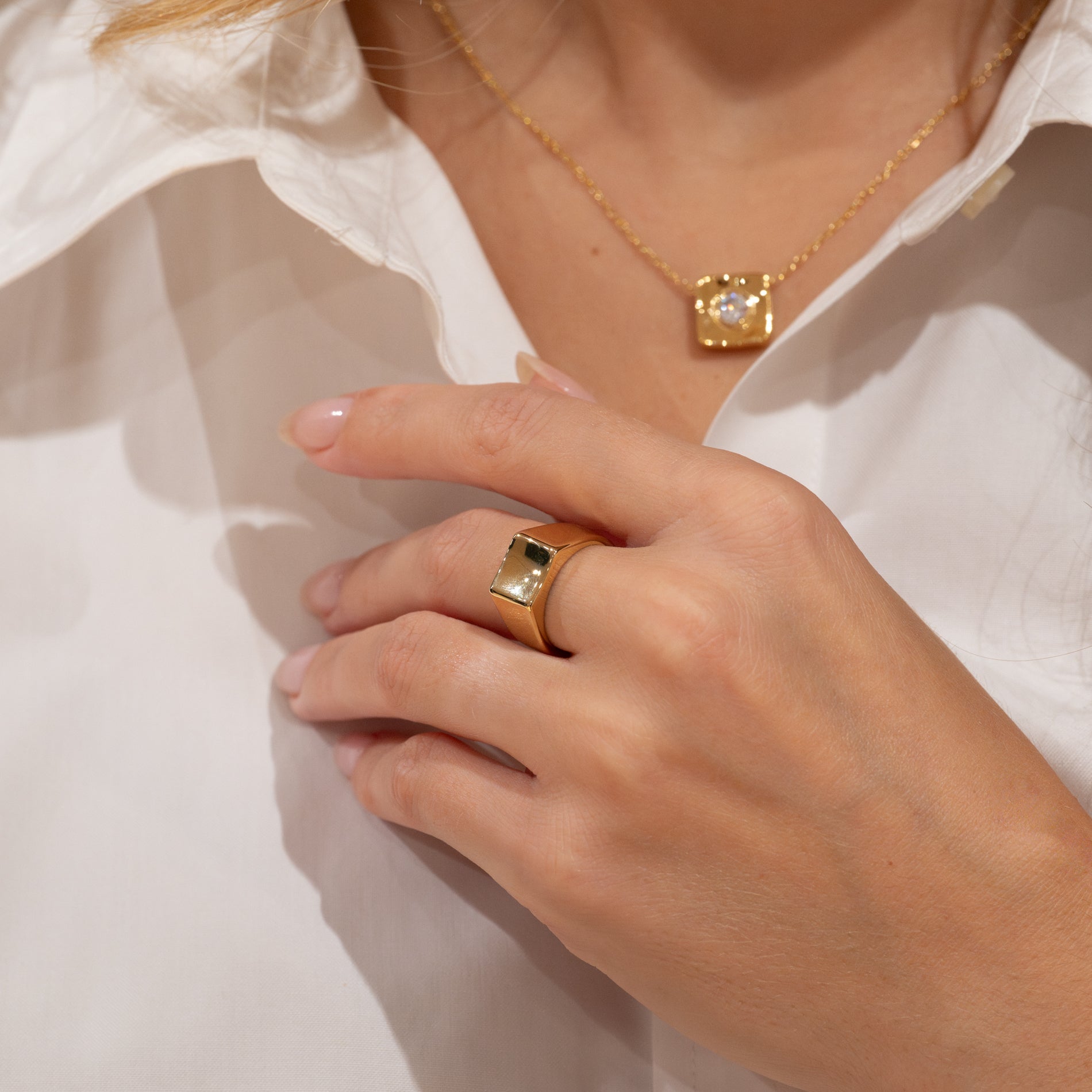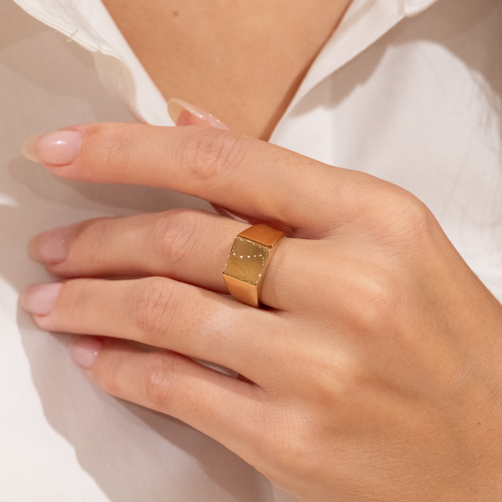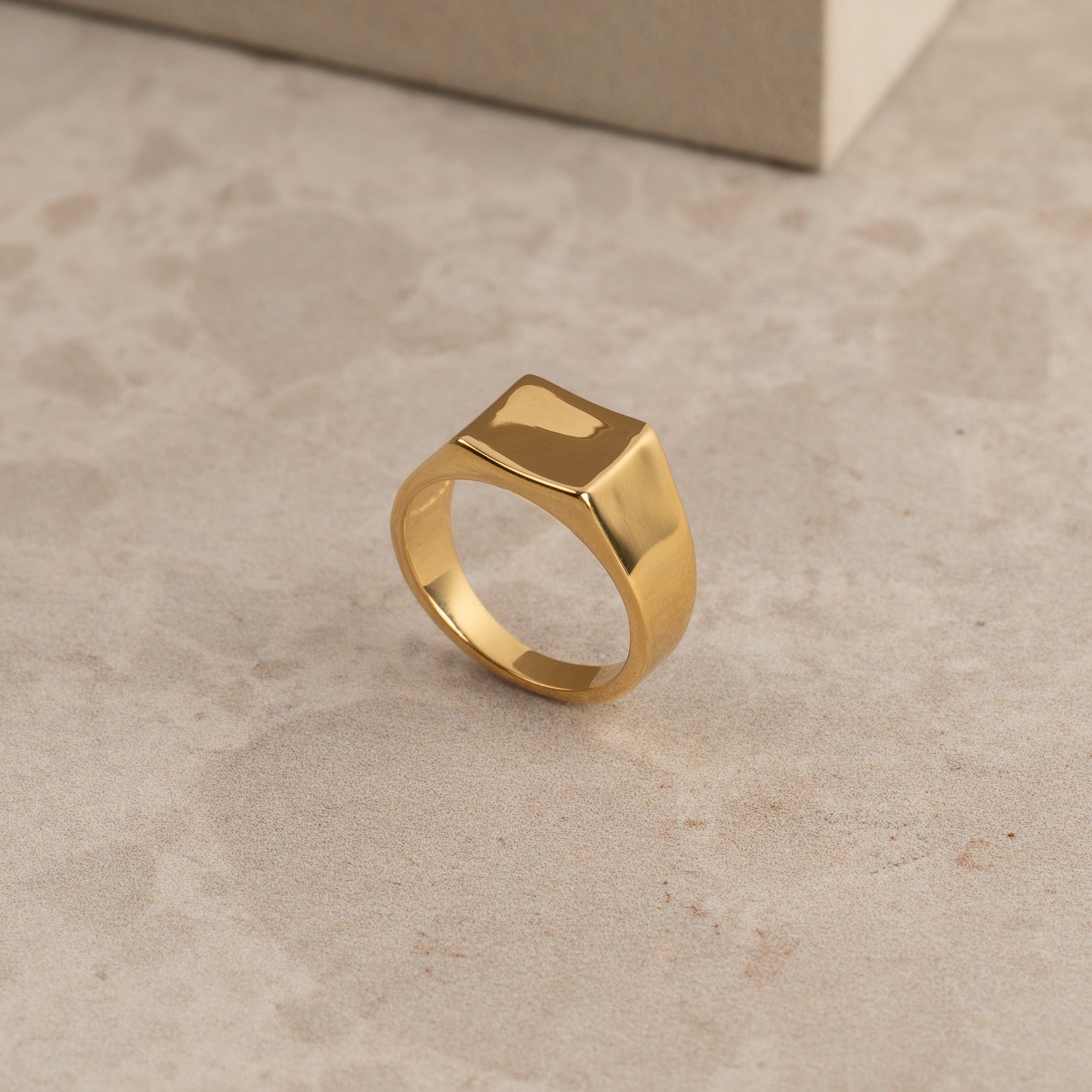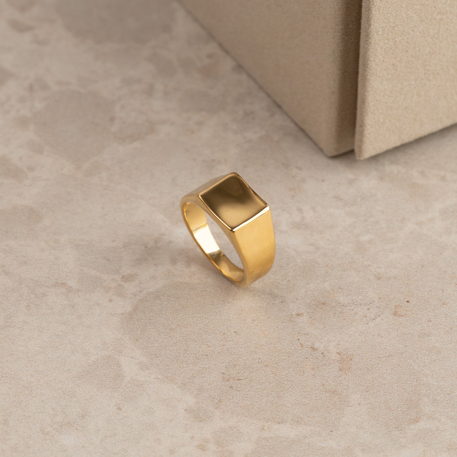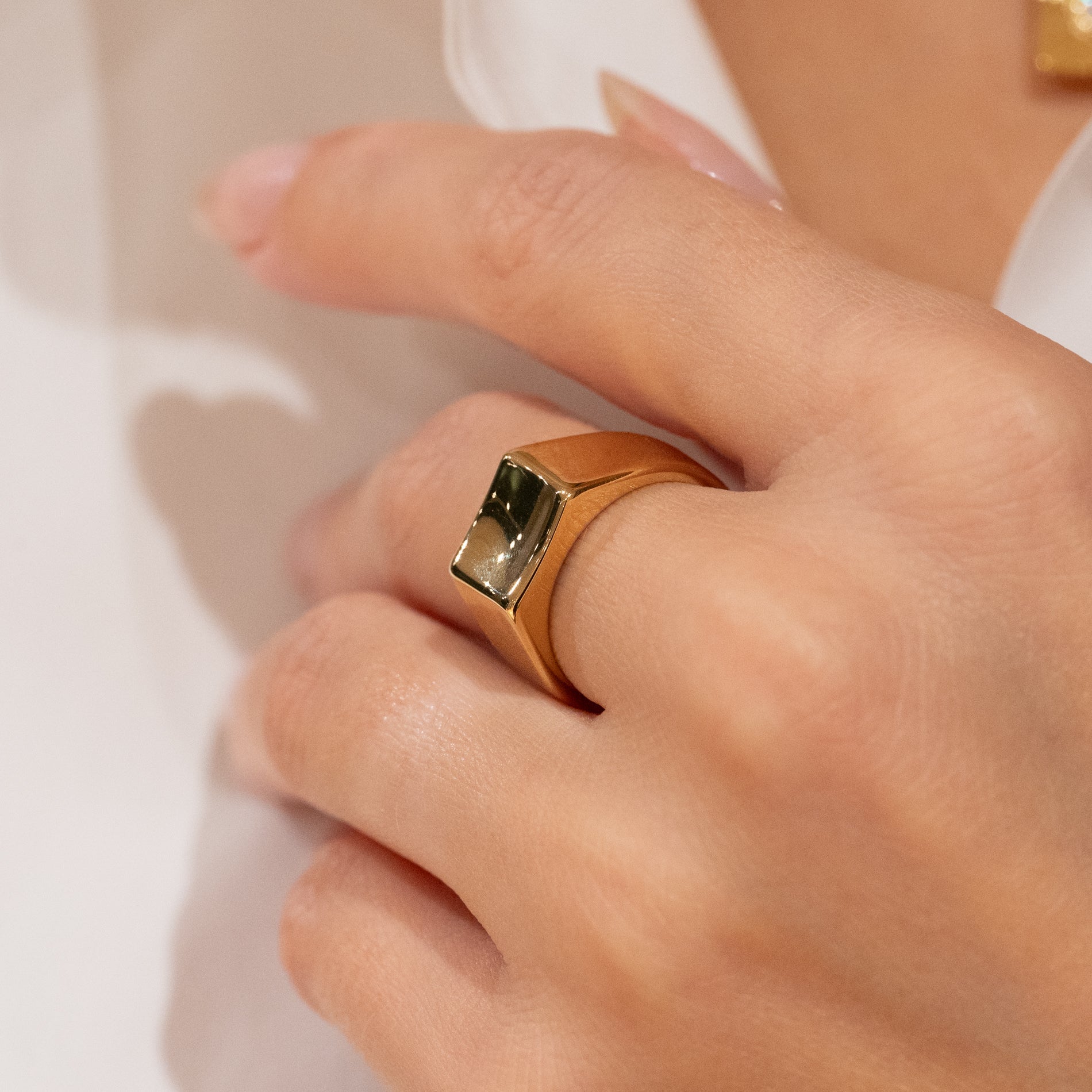 A classic square signet ring crafted from 100% recycled 18k gold-plated sterling silver. Its bold, retro-inspired design adds instant character, making it the ultimate statement piece.