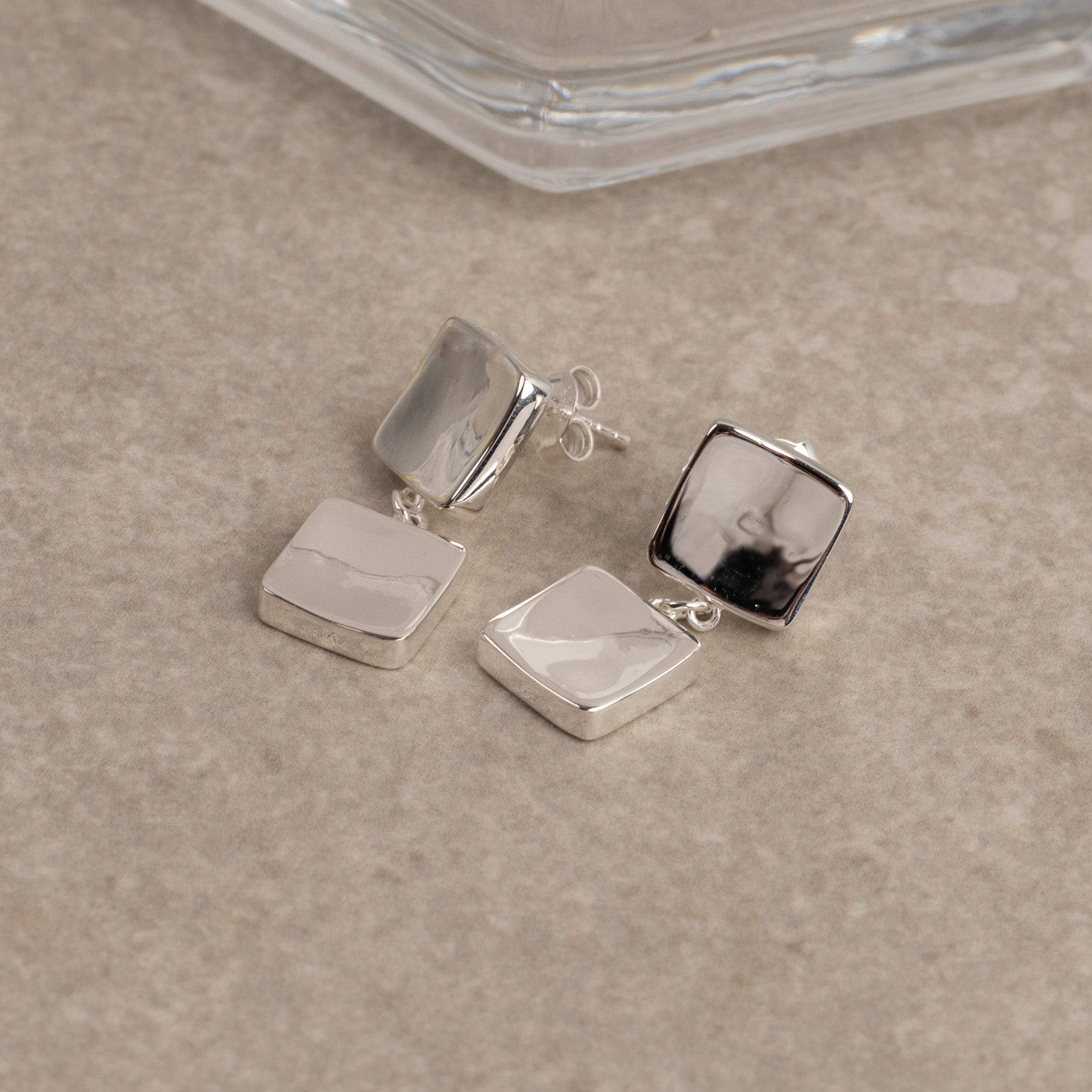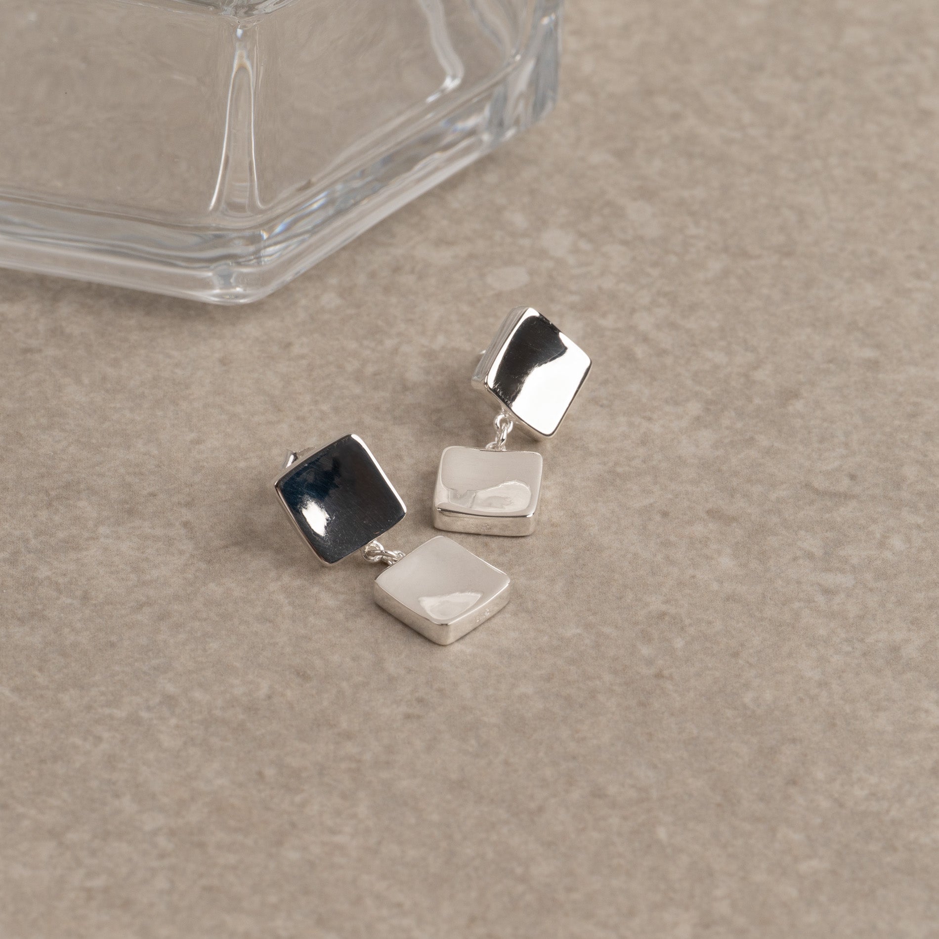 Drop earrings crafted from 100% recycled 925 sterling silver with a retro-inspired design. They feature two softly rounded squares, linked together to create a light, flowing movement.