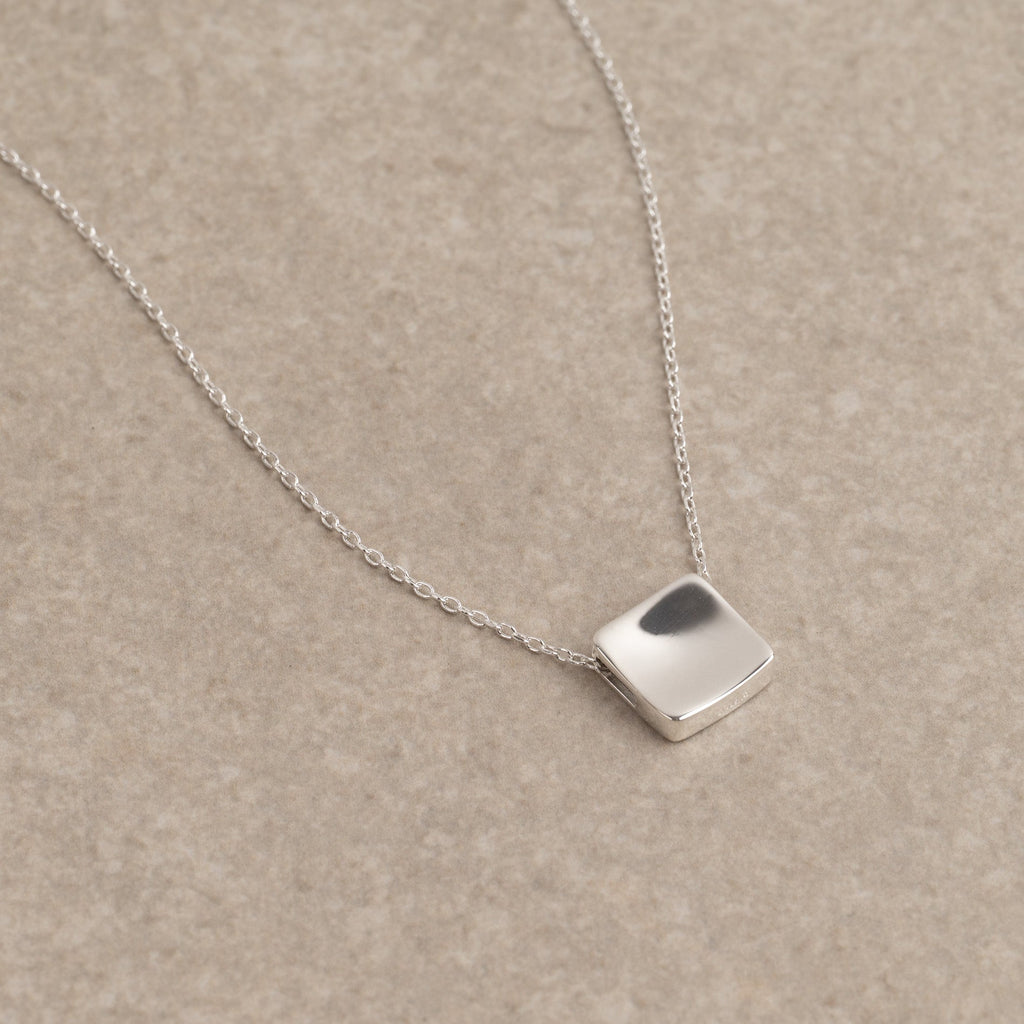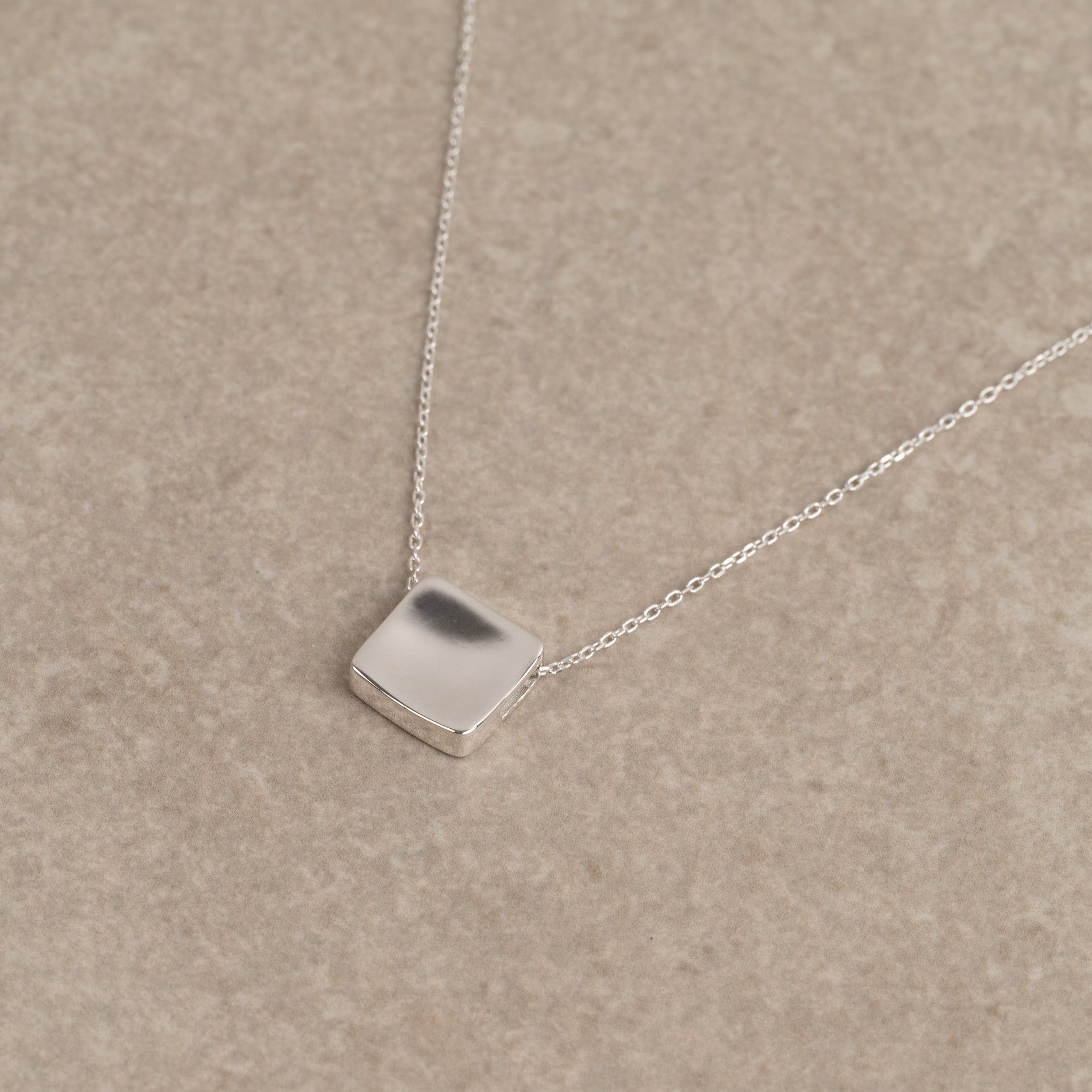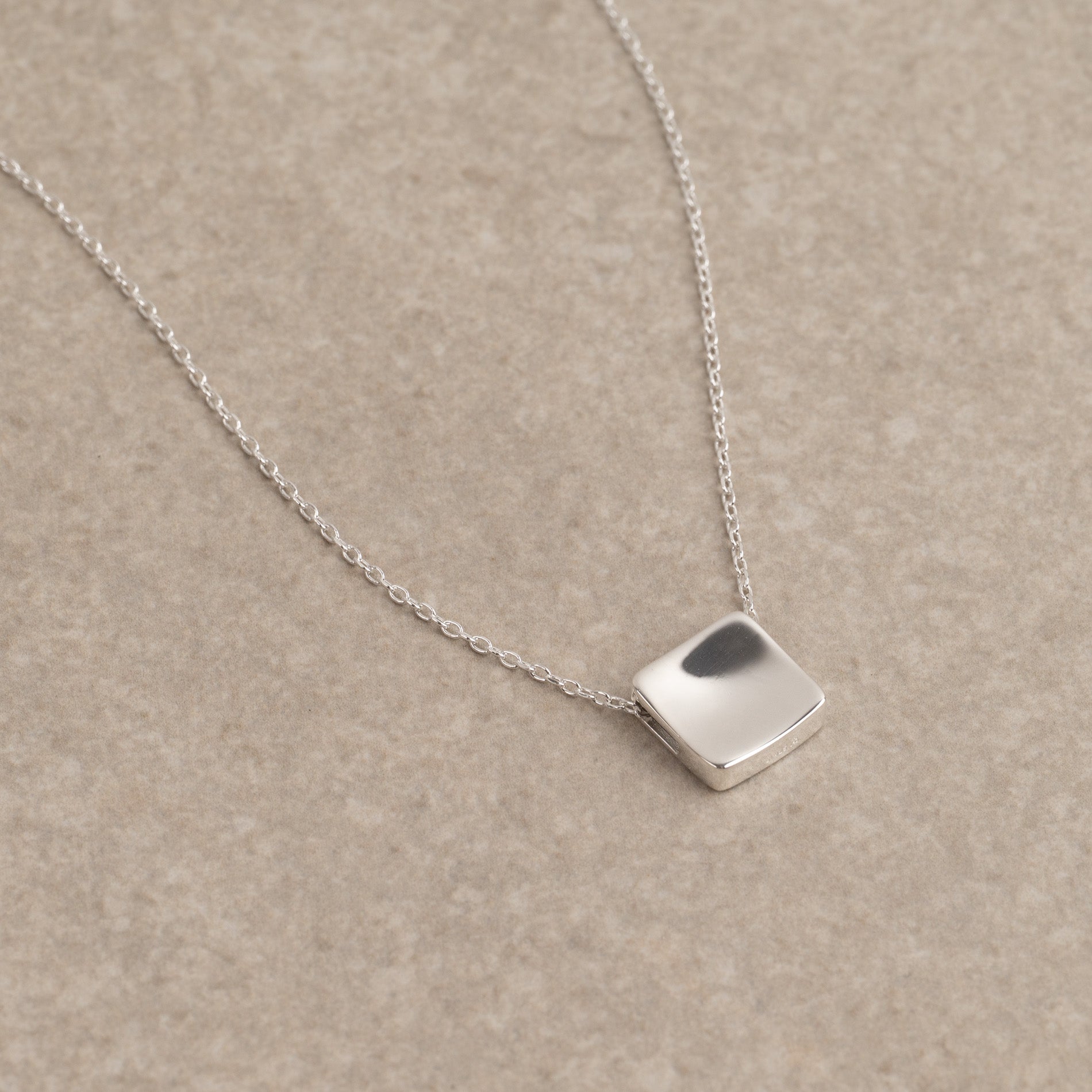 The square design with softly rounded corners creates a subtle, retro-inspired feel. Measuring 12 x 12 mm, the pendant features a slide-in opening of approximately 4 mm, making it easy to add to any necklace.