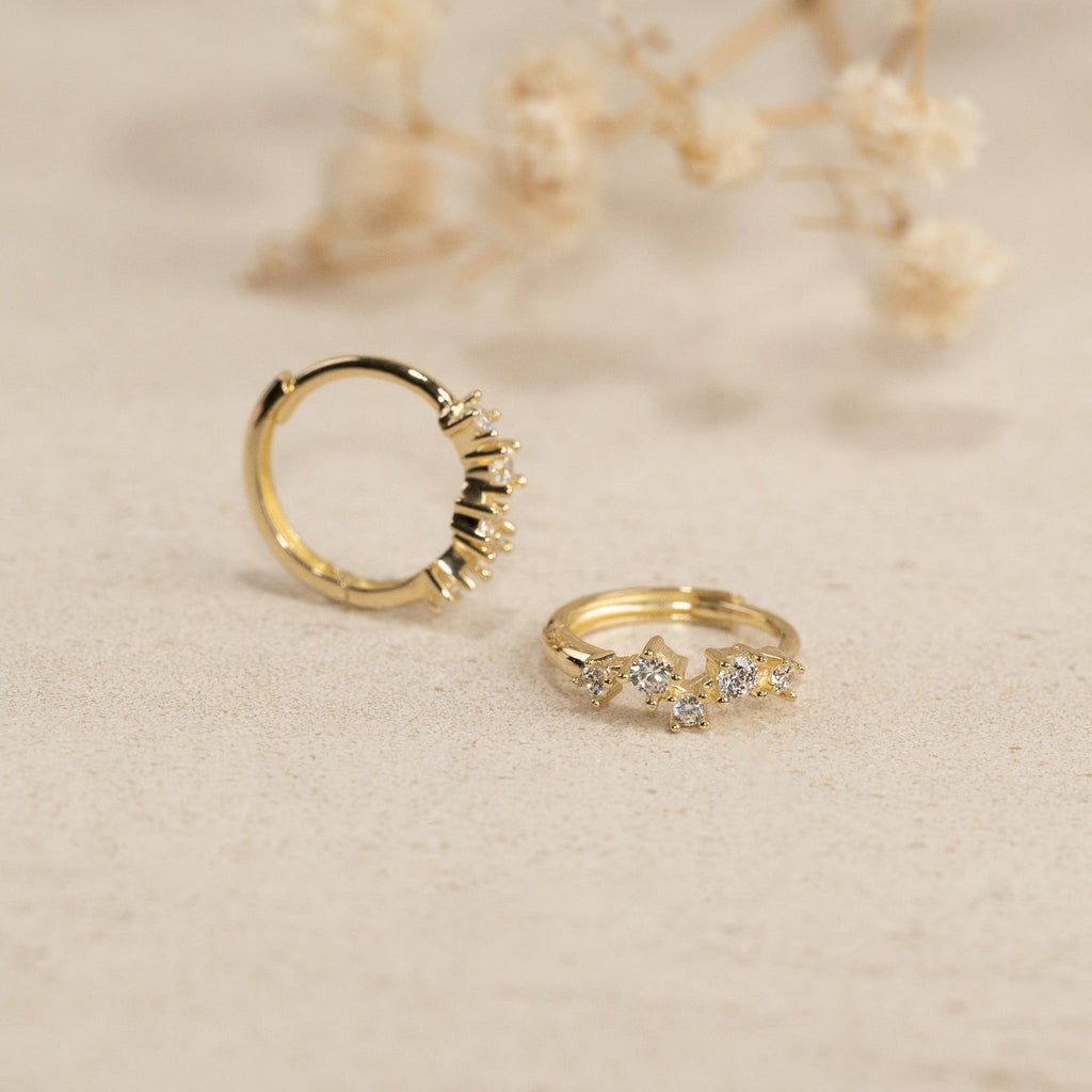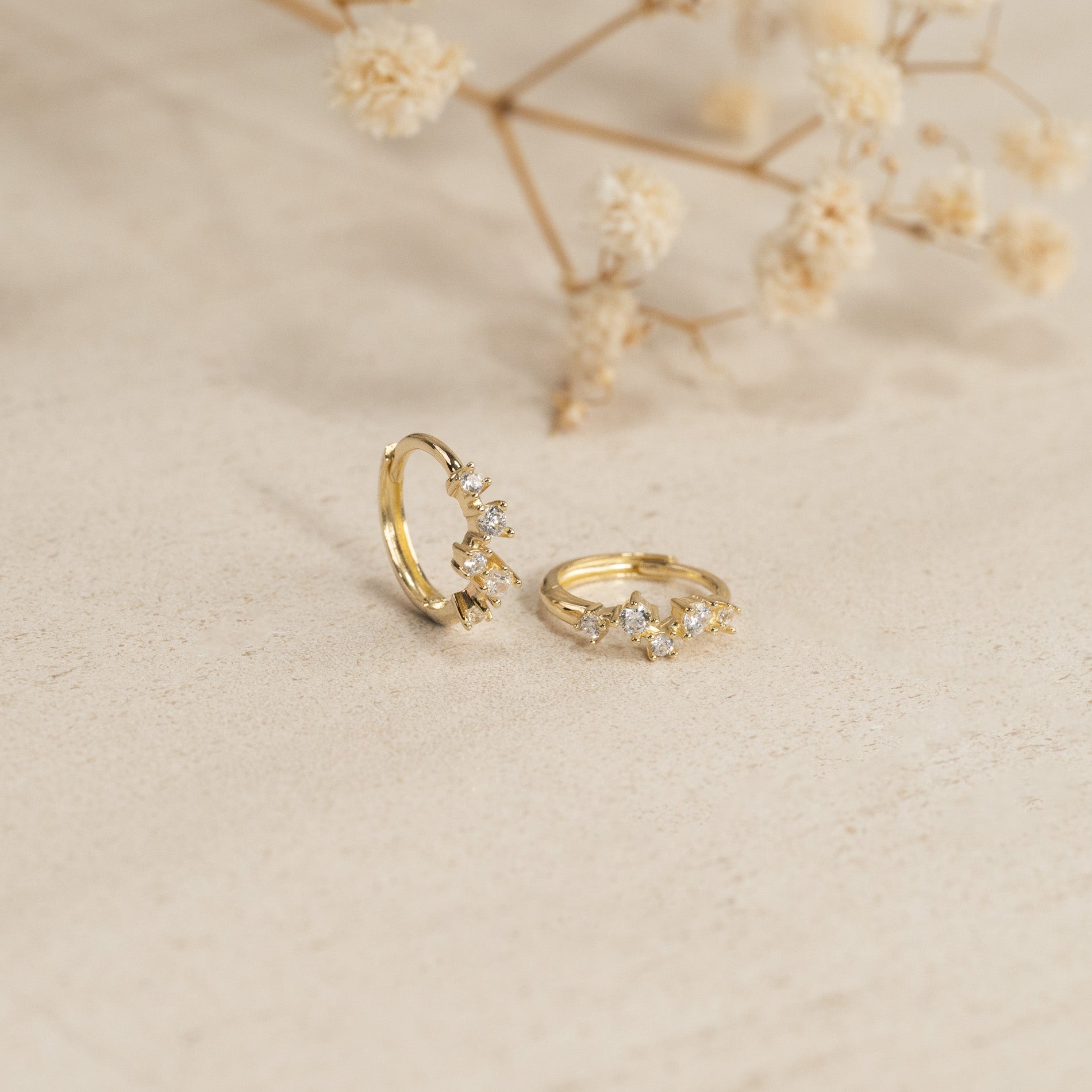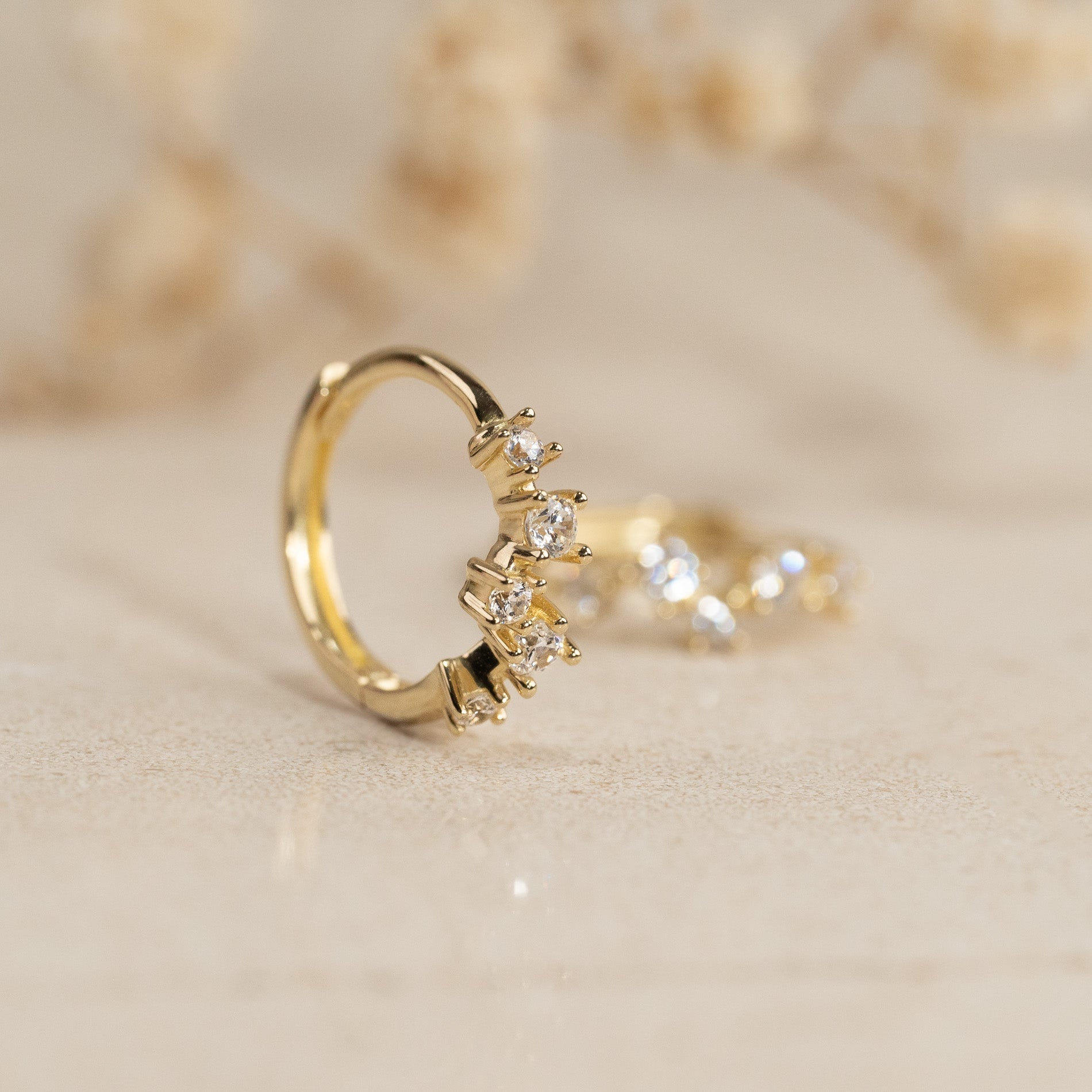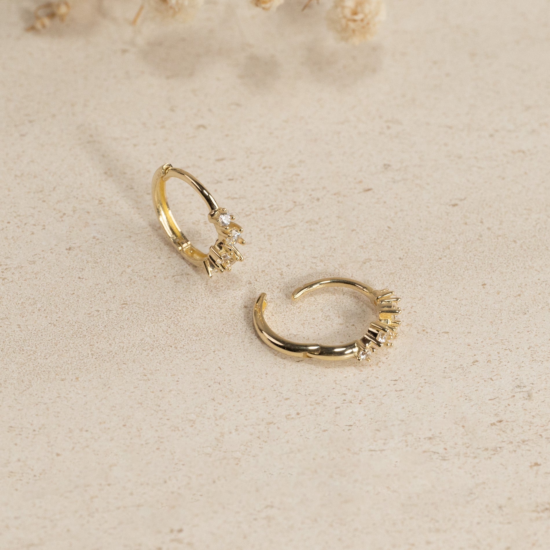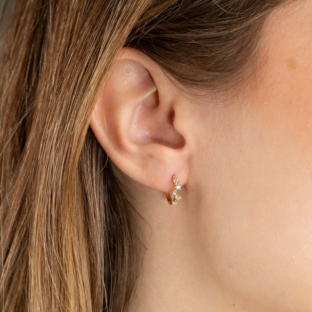 The earrings are made of 100% recycled 9 kt. solid gold with a row of five small clear zirconias.